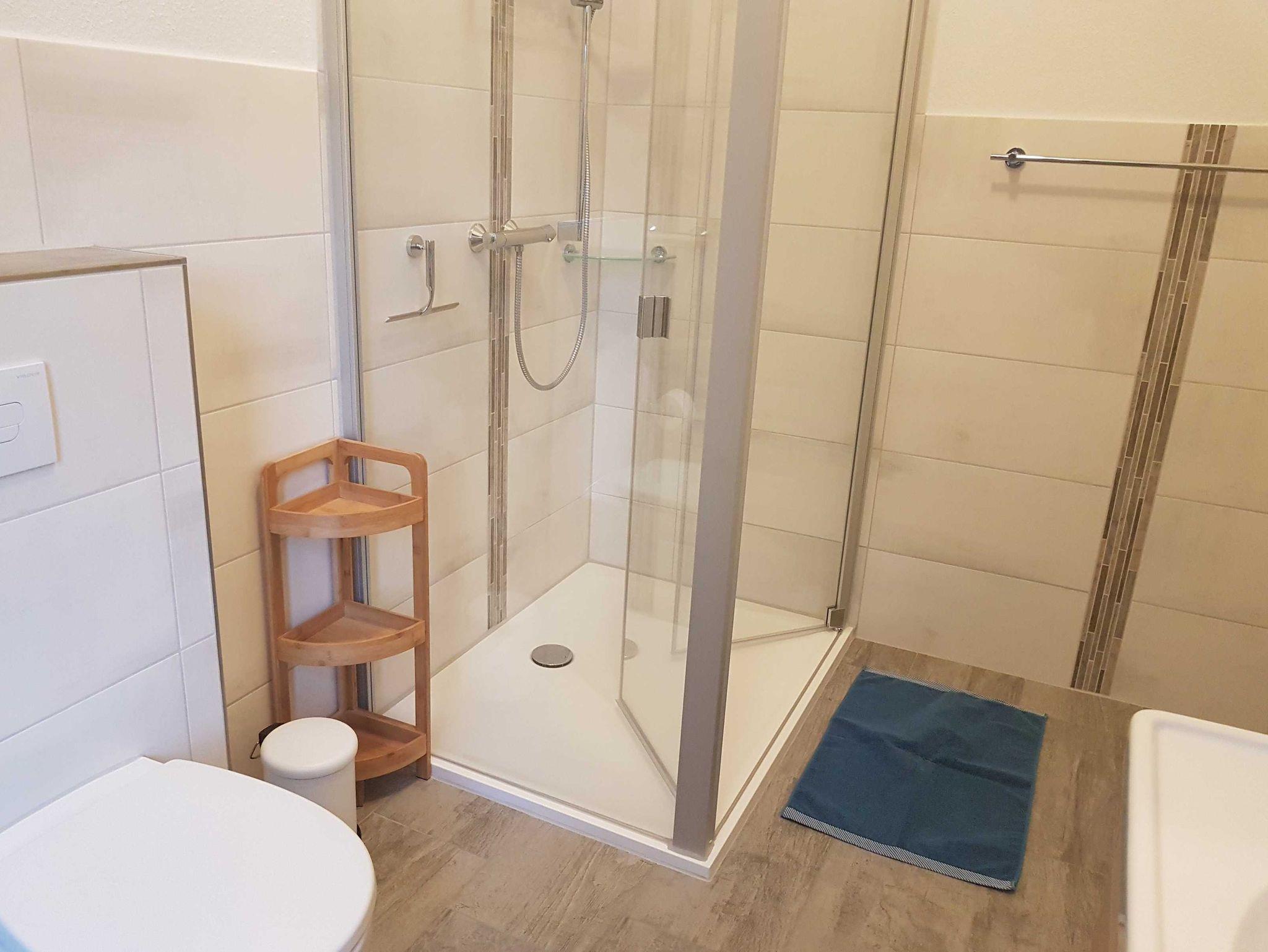 Das moderne Badezimmer verfügt über eine Dusche und WC.