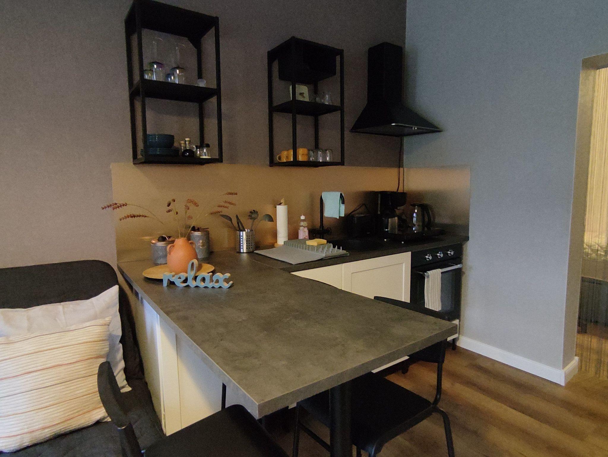 • zum Wohnzimmer offene, moderne Einbauküche mit Backofen, 2-Platten-Kochfeld und Eßtresen