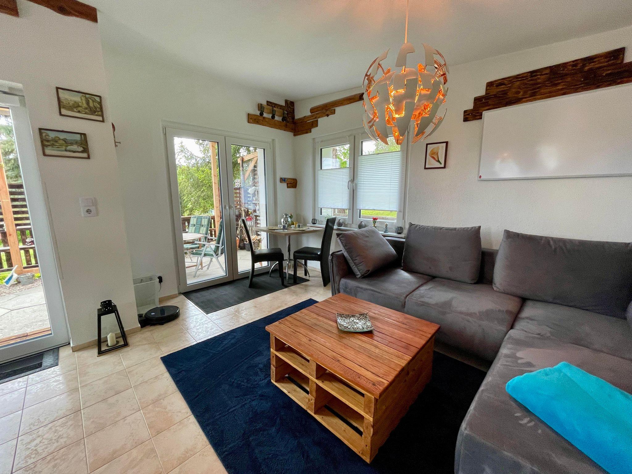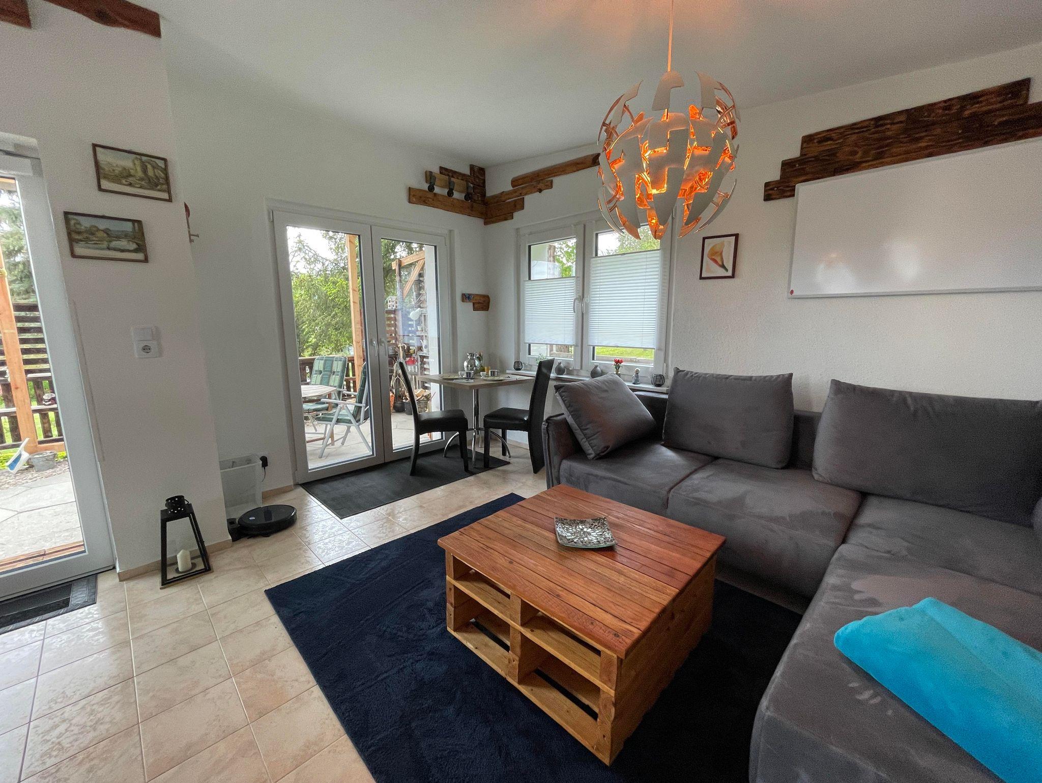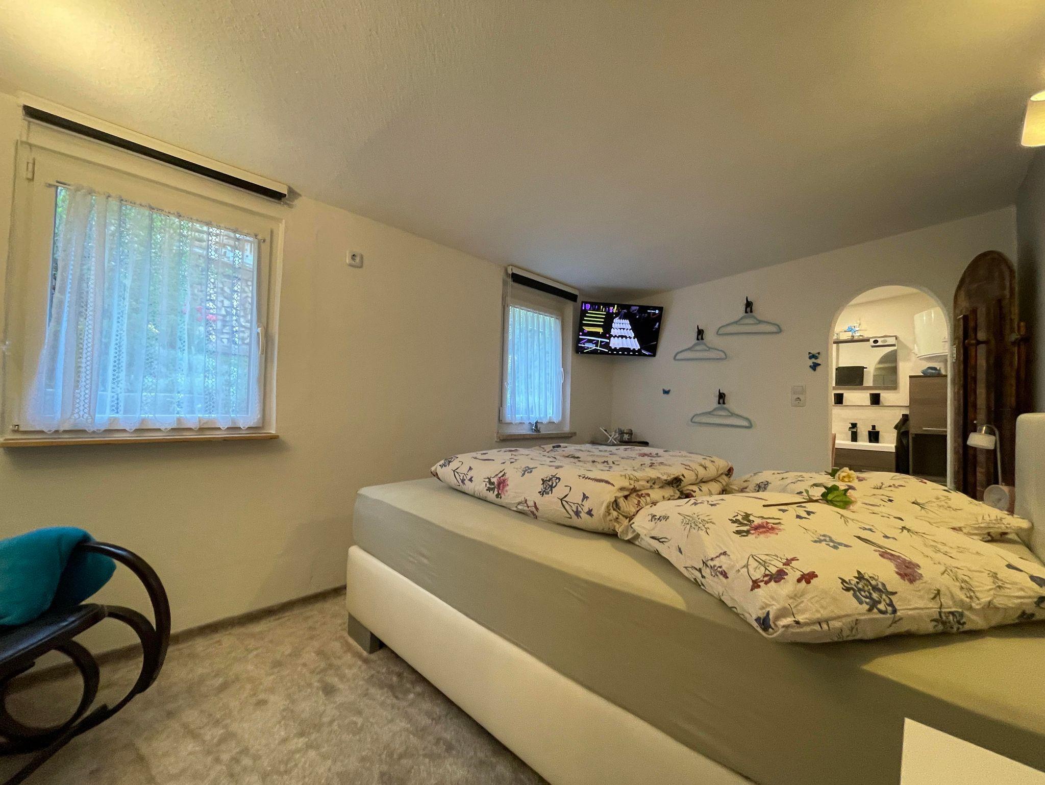 Unser Häuschen ist modern und gemütlich eingerichtet. Es steht komplett im Grünen auf Privatboden. Sie sind für sich allein in der Natur... In der Wohnung ist Platz für 2 Personen. Wir haben 1 Schlafzimmer mit einem Boxspringbett (160 cm breit). Das große Sofa im Wohnzimmer Bereich könnte auch eine 3. Person, zur Ausnahme, beherbergen. Sie finden dort eine neu eingebaute Küche mit: Herdplatten, Backofen, Mikrowelle, Kaffeemaschine, Toaster, Wasserkocher und Kühl- und Gefrierkombination. Das Badezimmer ist zweckmäßig eingerichtet mit Dusche, Waschbecken, WC. Draußen können Sie die geräumige Terrasse genießen mit vorhandenen Gartenmöbeln, Sonnenschirm und Grill. Sie haben von dort aus einen herrlichen Blick auf die Stadt Thale und die Harzregion. Einen Parkplatz finden Sie direkt an der Hauptstraße oder ca. 100 Meter weiter, direkt an der Ferienwohnung.
