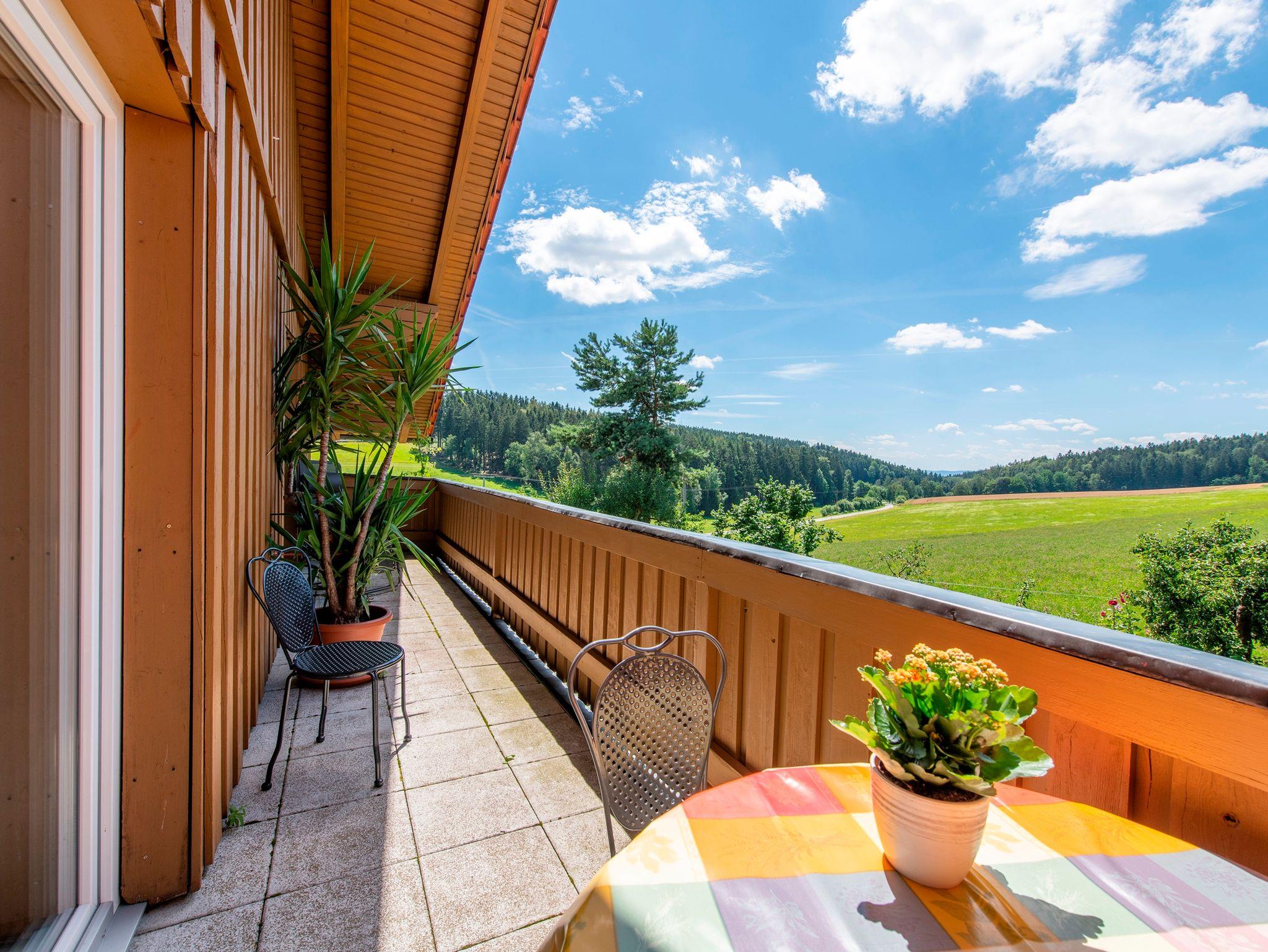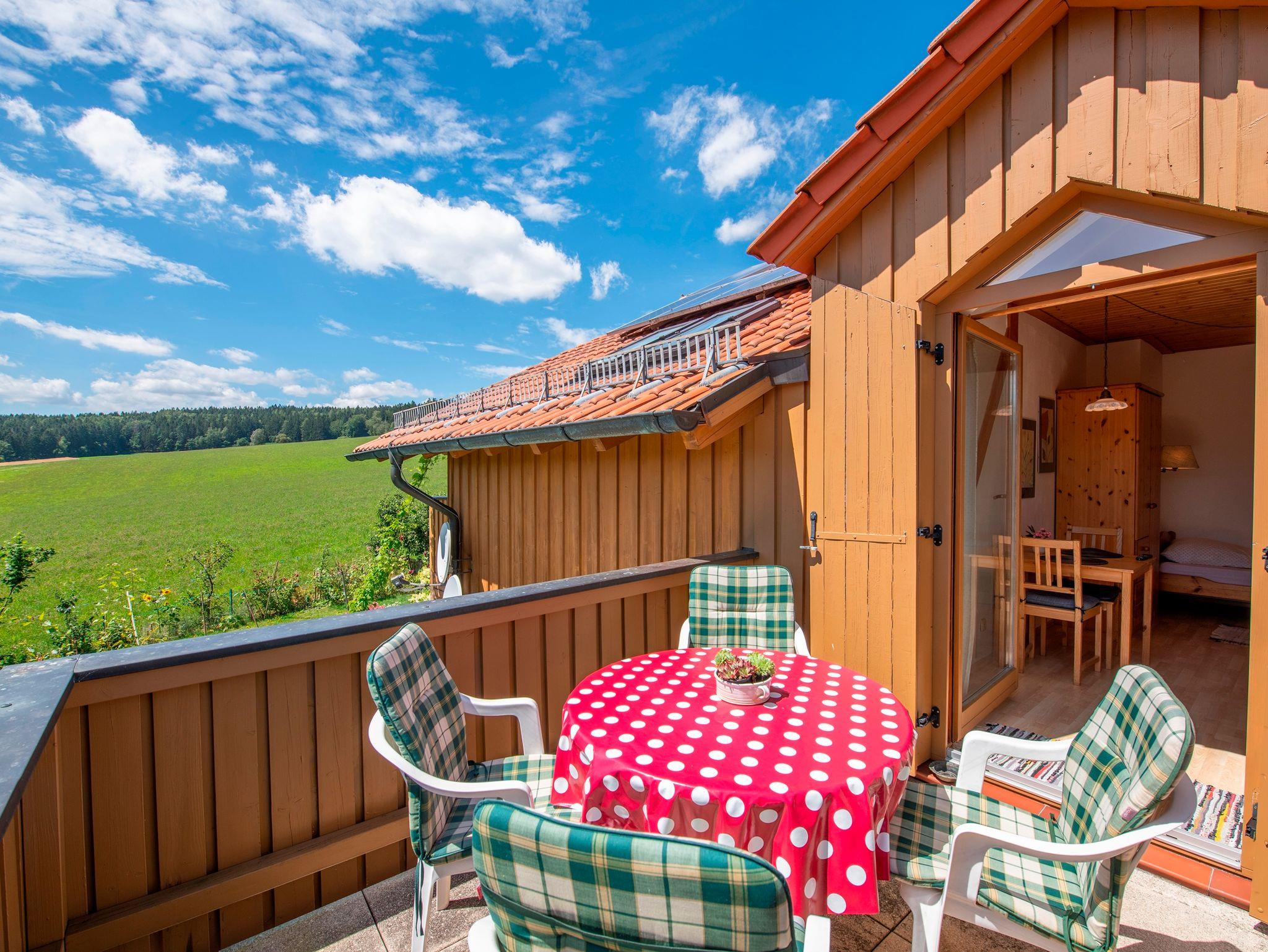 Ein großer Westbalkon mit einer Sitzgruppe.