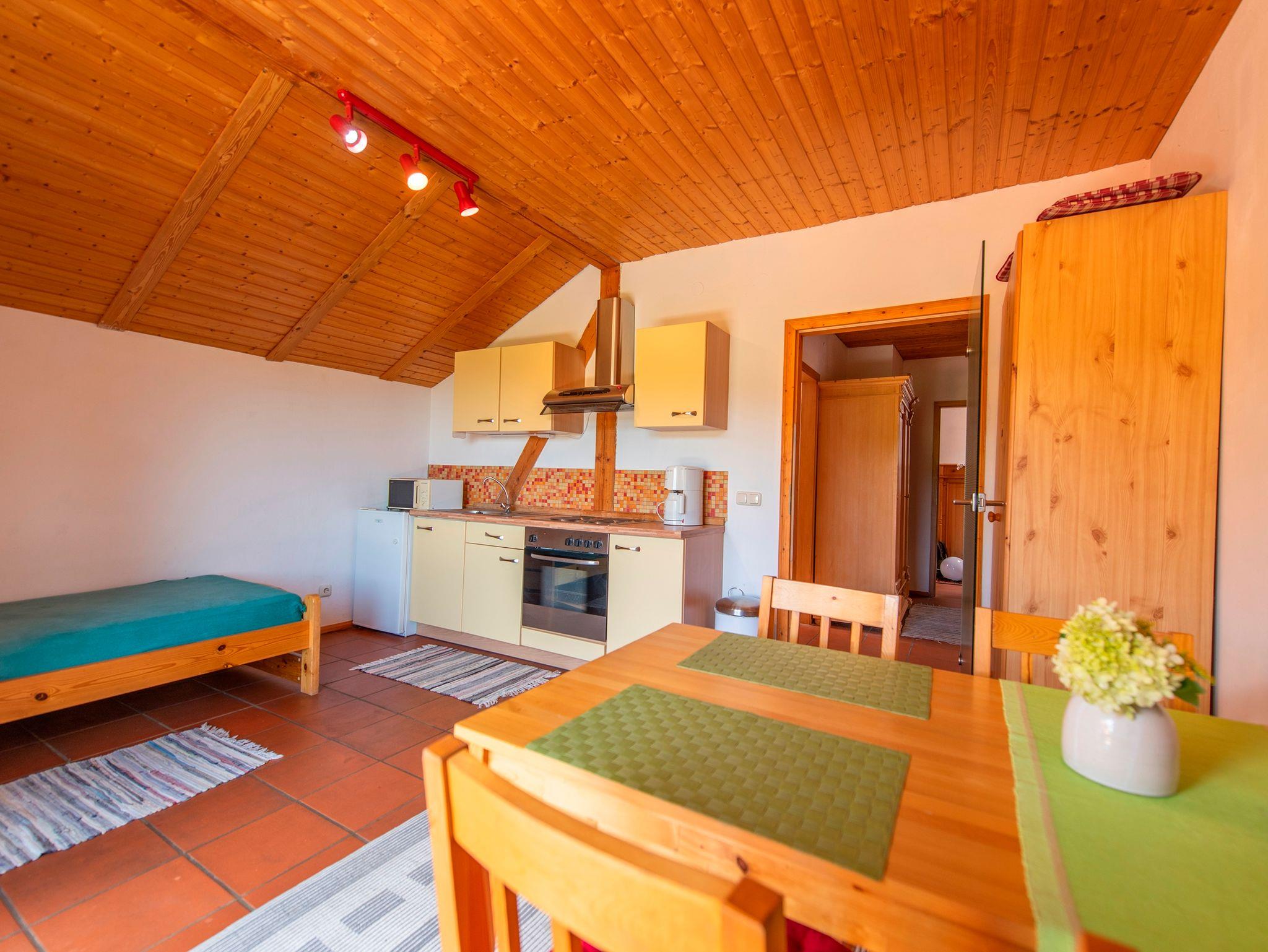 Unsere gemütliche Ferienwohnung ist 55qm groß und bietet Platz für 2 Personen. Es gibt einen Schlafraum drei Betten, sowie einen kombinierten Wohn- Schlafbereich mit einem Einzelbett. Die Küchenzeile ist voll ausgestattet mit einem Kühlschrank, einer Mikrowelle, einer Kaffeemaschine sowie einem Kaffee- und Teekocher und einem Toaster. Tisch-und Küchenwäsche ist vorhanden. Es gibt einen Esstisch mit Stühlen, sowie eine Couch und einen Sat-Fernseher.