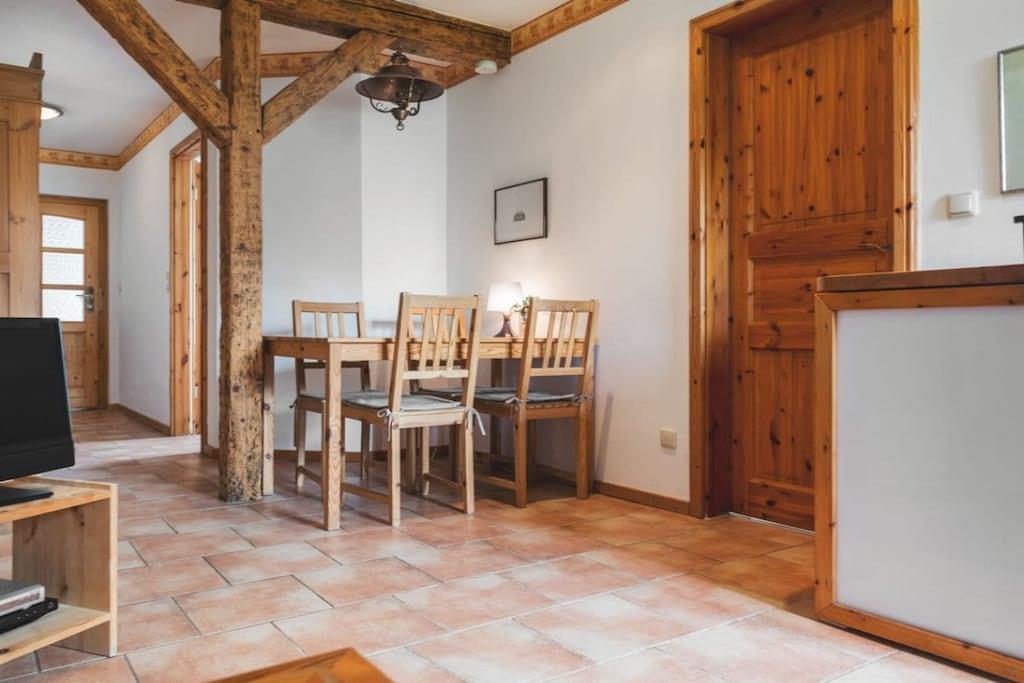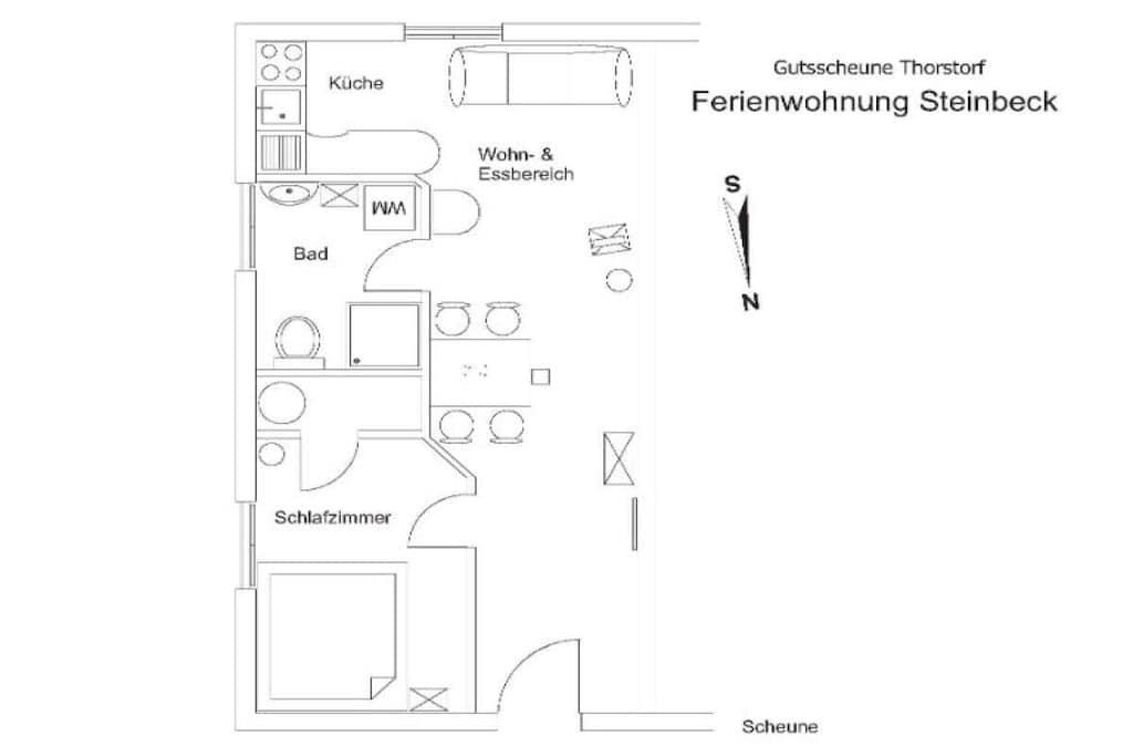 Verleben Sie Ihren Urlaub in einer einmaligen Dreiständerscheune nur 5 km von der Ostsee entfernt. Die Wohnung Steinbeck im Erdgeschoss ist auf ca. 40 m² ausgestattet mit einem Schlafzimmer für zwei Personen und zwei Aufbettungsmöglichkeiten auf der Schlafcouch im Wohnbereich. Genießen Sie beim Aufwachen die Morgensonne, im Bad mit Fenster den Ausblick und das Zwitschern der Vögel in den Weinranken an der Hauswand. Mit viel Liebe zum Detail sind die alten Balken aufgearbeitet worden, die sich jetzt mit ihrer Natürlichkeit in die Wohnung einbringen und die Zeichnungen mit Mecklenburger Motiven geben der Wohnung ein individuelles Erscheinungsbild. Platz bieten zusätzlich das 5000 m² große Grundstück sowie die 400 m² große Scheune.