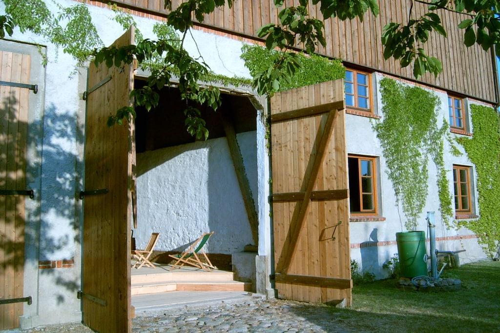 Die Wohnung bietet Platz zum Wohlfühlen und Genießen für acht Personen auf ca. 140 m² und zwei Ebenen. Aufgeteilt ist sie in Küche mit großem Essbereich, Bad, Wohnzimmer, Veranda, zwei Schlafzimmer und eine Schlafgalerie. Dielenfußböden in Wohn- und Schlafbereich sowie in der Küche verbreiten in der Wohnung ein angenehmes Raumklima. Besonderes Highlight dieser Wohnung ist die Veranda - eine gelungene Verbindung zwischen drinnen und draußen. Die große Wohnküche bietet mit ihrem Essbereich nicht nur Platz und Raum zum Essen, sondern auch zum Spielen und geselligen Zusammensein. Und der Kamin im Wohnzimmer sorgt für eine kuschelige Atmosphäre. Platz bieten zusätzlich das 5000 m² große Grundstück, sowie die 400 m² große Scheune.
