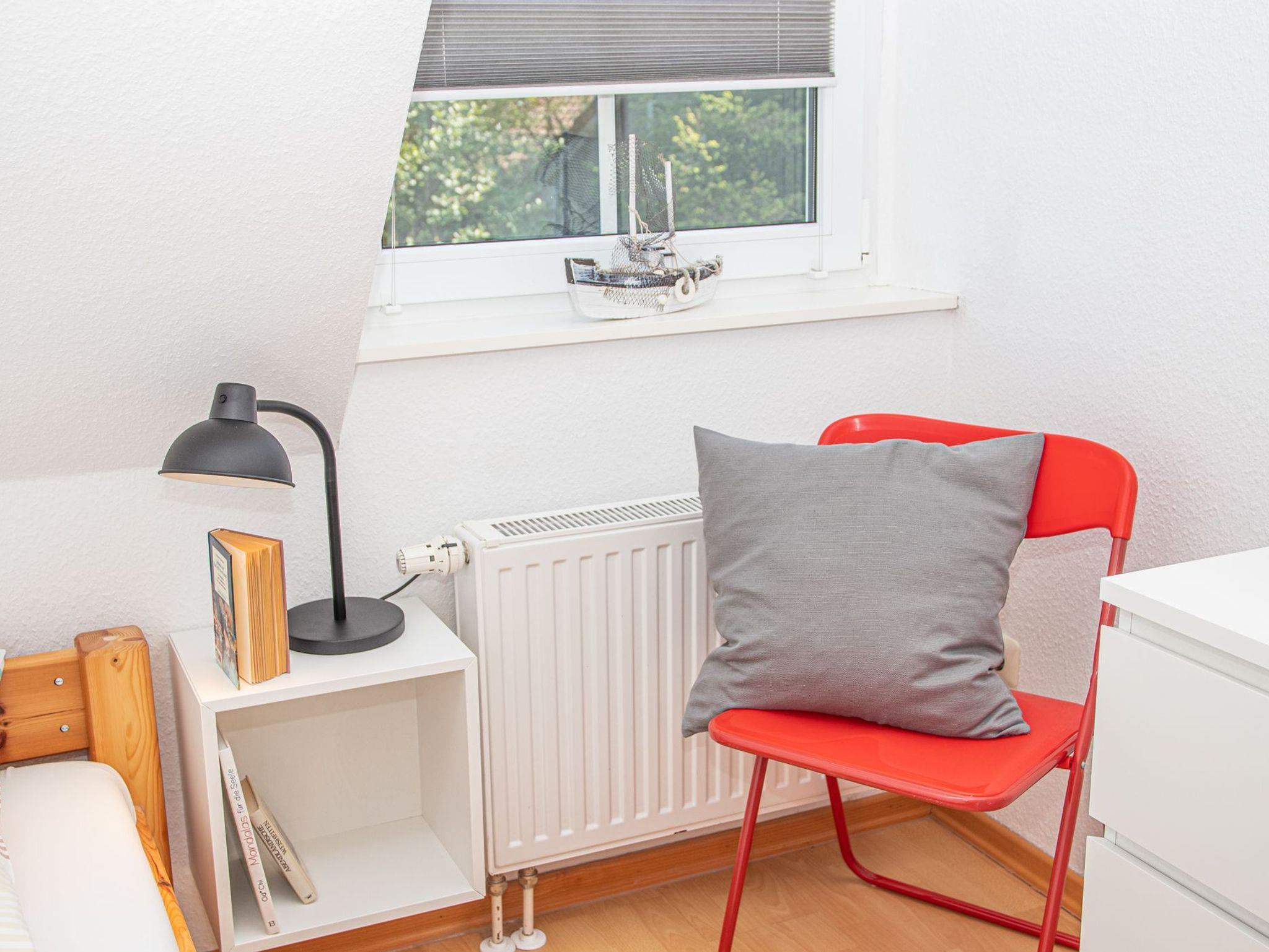 Schlafzimmer/Kinderzimmer mit Einzelbett Badezimmer mit Dusche, Waschtisch