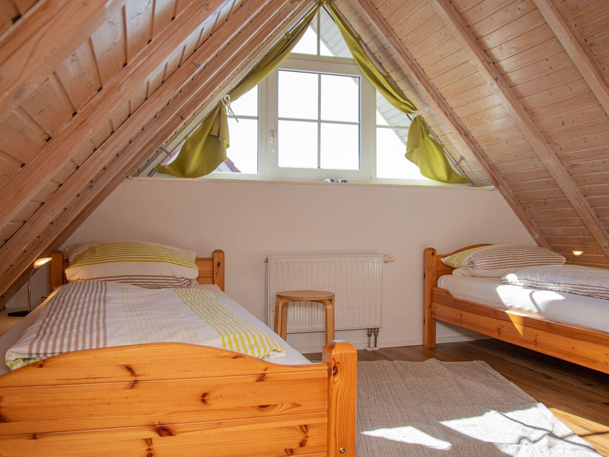 und WC. Im Dachgeschoss befinden sich ein weiterer Raum mit zwei Einzelbellen ( Hier möchten wir auf eine etwas steilere Treppe hinweisen). Separates zweites WC im Erdgeschoss . Terrasse