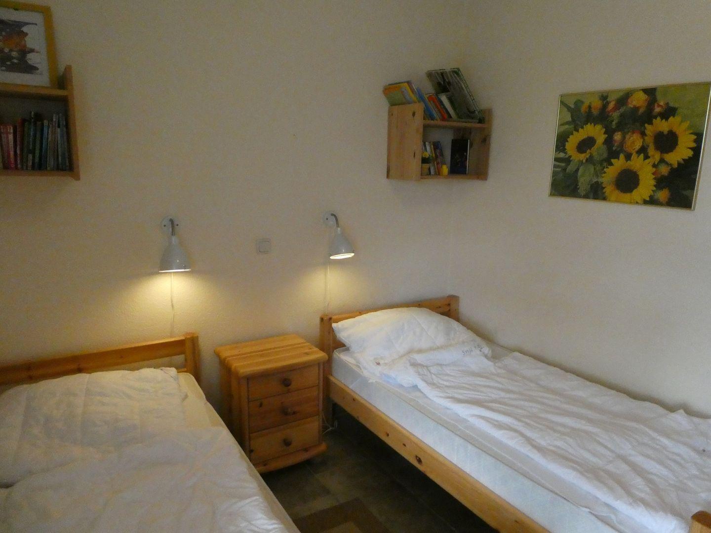 Für einen erholsamen Schlaf bietet Ihnen die Ferienwohnung ein Schlafzimmer mit einem Doppelbett und festem Kinderbett und ein weiteres Schlafzimmer mit zwei Einzelbetten. Zwei weitere Aufbettungen sind über eine Doppelbettcouch im Wohnbereich möglich. Für Ihre Garderobe steht Ihnen jeweils ein Kleiderschrank pro Schlafzimmer zur Verfügung.