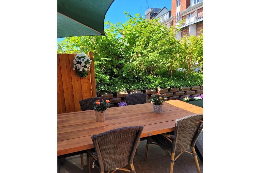 Souterrain: (Eingangshalle(, ), Wohnzimmer(Schlafcouch 1 Pers., TV, Radio, CD-Spieler), Küche(Kochnische, Esstisch, Kochplatte, Wasserkocher, Toaster, Kaffeemaschine, Backofen, Mikrowelle, Spülmaschine, Kühlschrank, Tiefkühlschrank, Hochstuhl), Schlafzimmer(, Doppelbett, Babybett), Badezimmer(, Badewanne, Dusche, Waschbecken), guest toilet(, Toilette, Waschbecken), Abstellraum(, Trockenschrank)) , , , Internet, Heizung, Terrasse(, Grill, Gartenmöbel), Parkplatz, Sonnenschirm, Trockenschrank