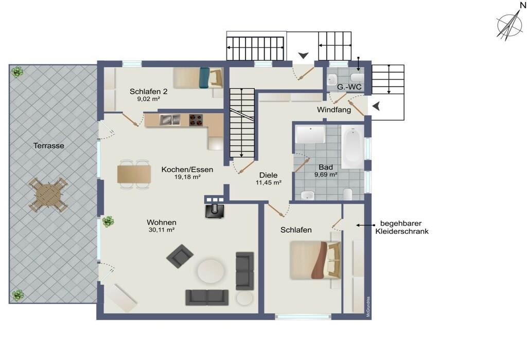 Moderne Ferienwohnung mit 2 Schlafzimmern, großer Sonnenterrasse und Kamin, nur wenige Schritte vom Sandstrand in Timmendorfer Strand entfernt.