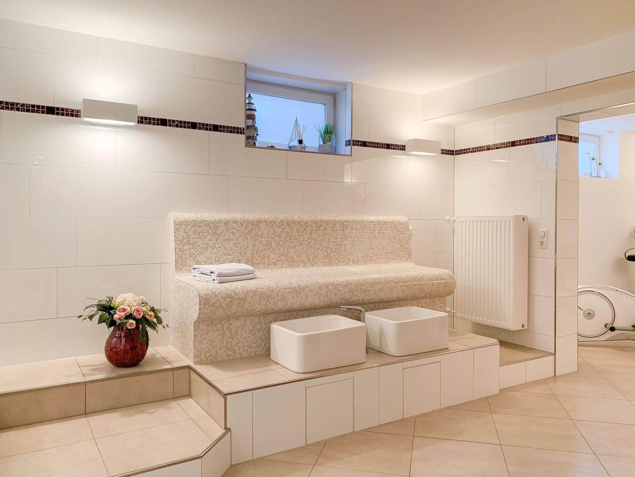 Entspannen können Sie im hauseigenen Wellnessbereich mit Sauna (Nutzung gegen Gebühr), Tauchbecken, Dusche, Crosstrainer und Kicker, der unseren Gästen zur gemeinschaftlichen Nutzung zur Verfügung steht. Ebenso Waschmaschine und Trockner (Münzgeräte).[nbsp] Ein fester PKW Stellplatz und Fahrradständer(außen) befinden sich[nbsp] direkt auf dem Grundstück.