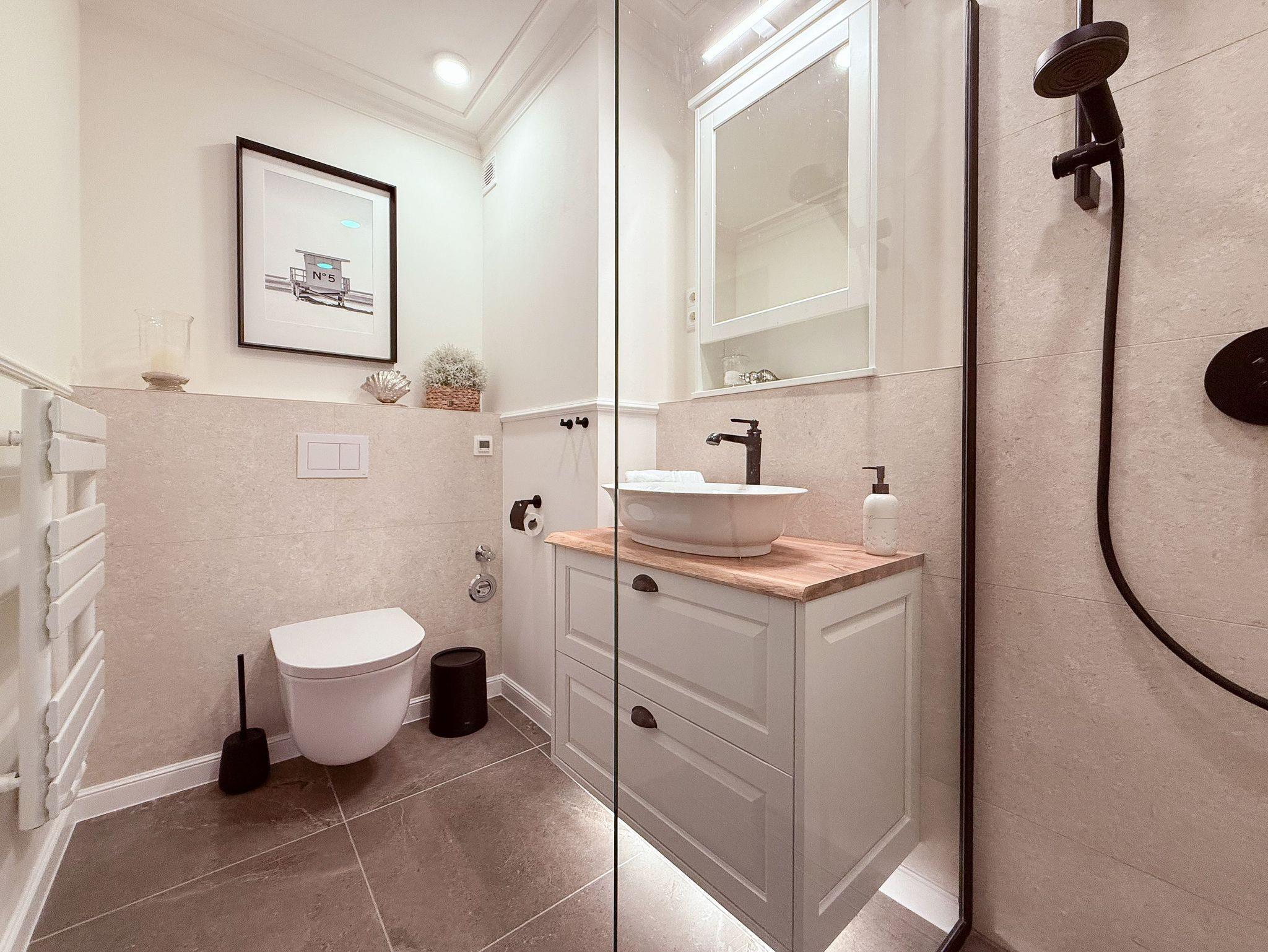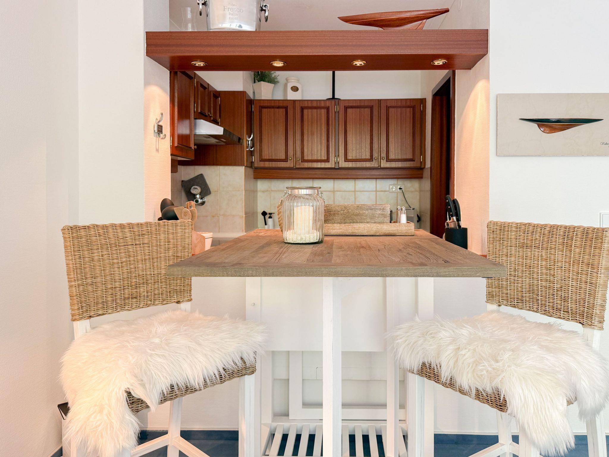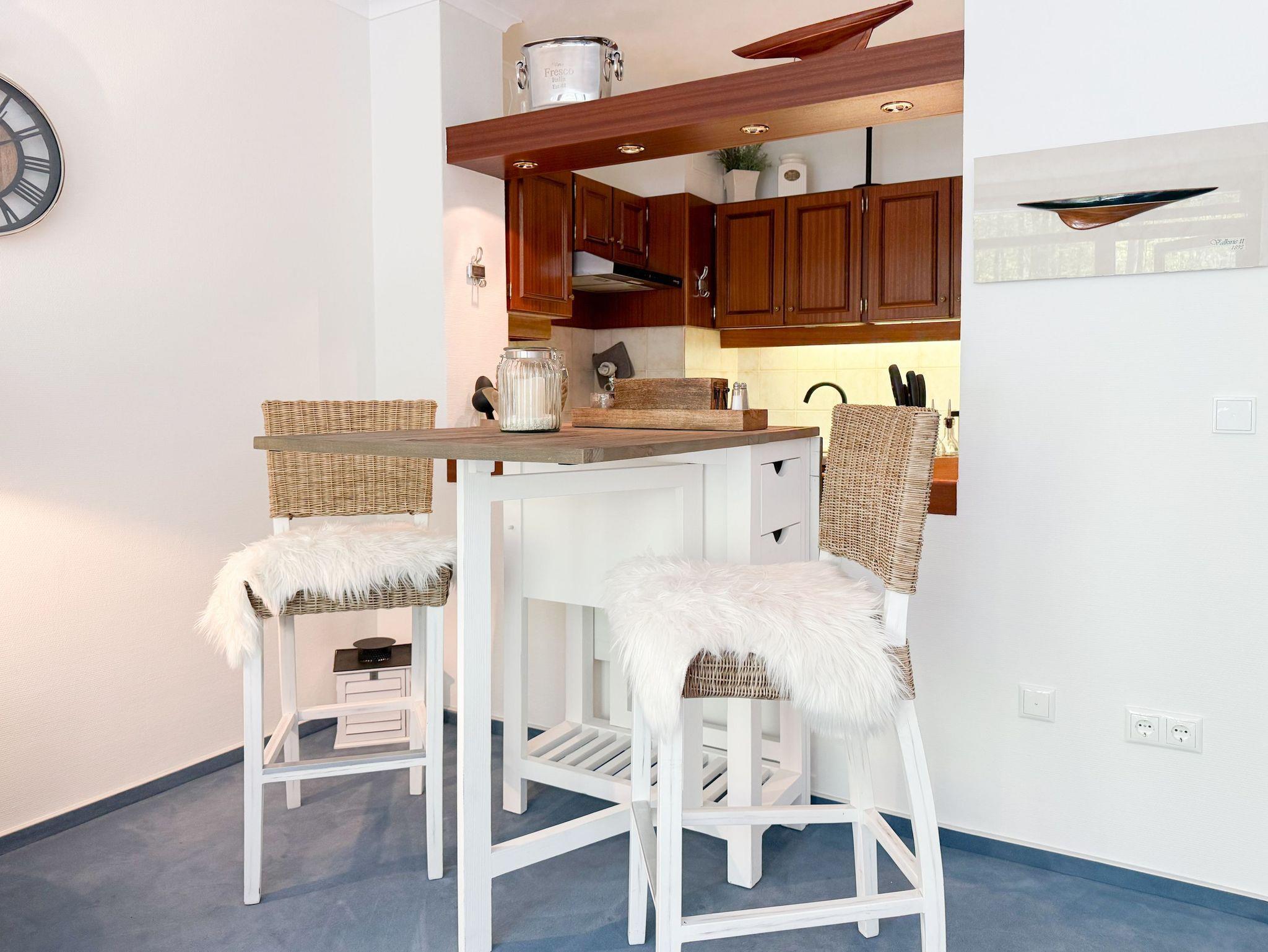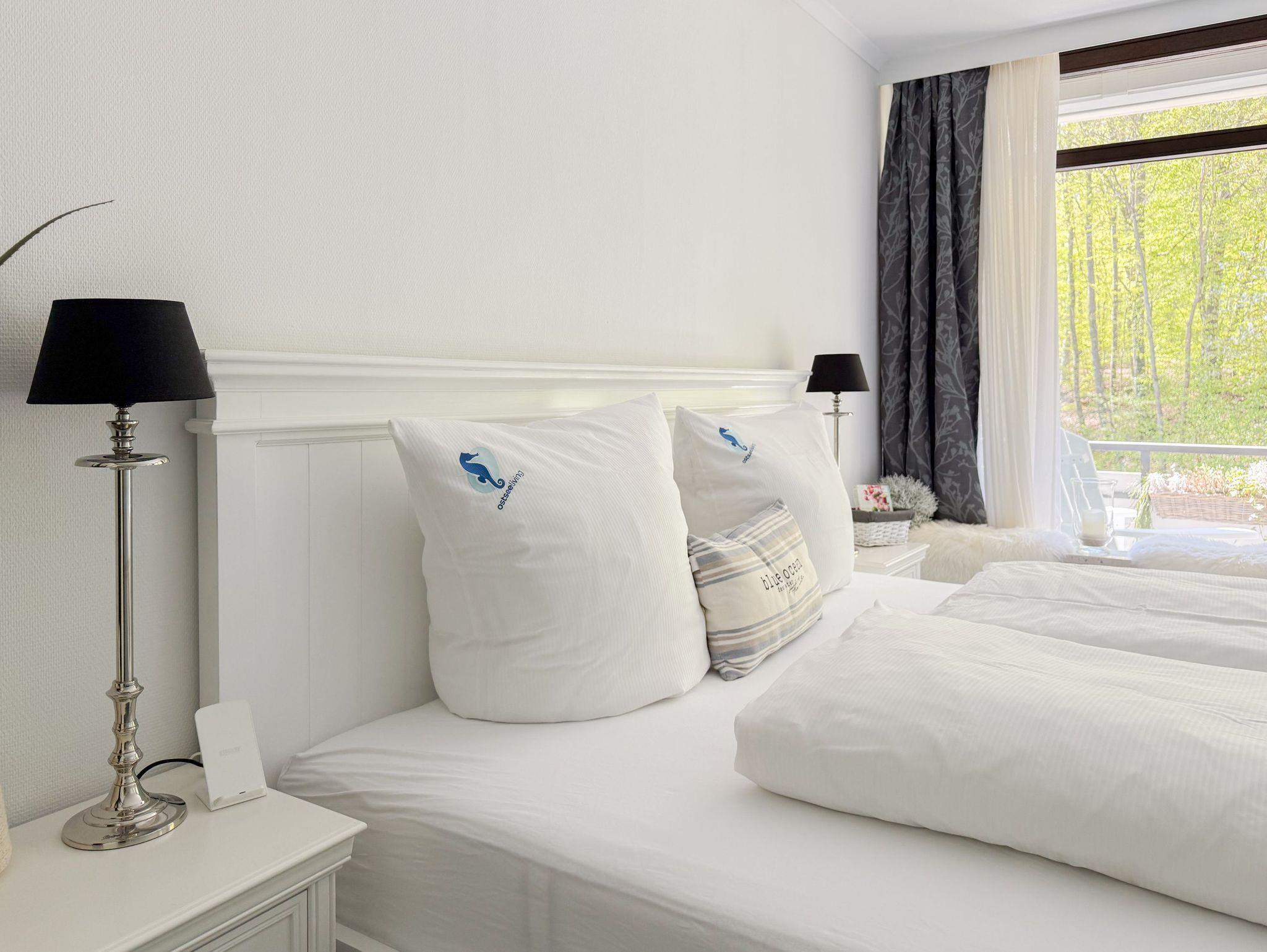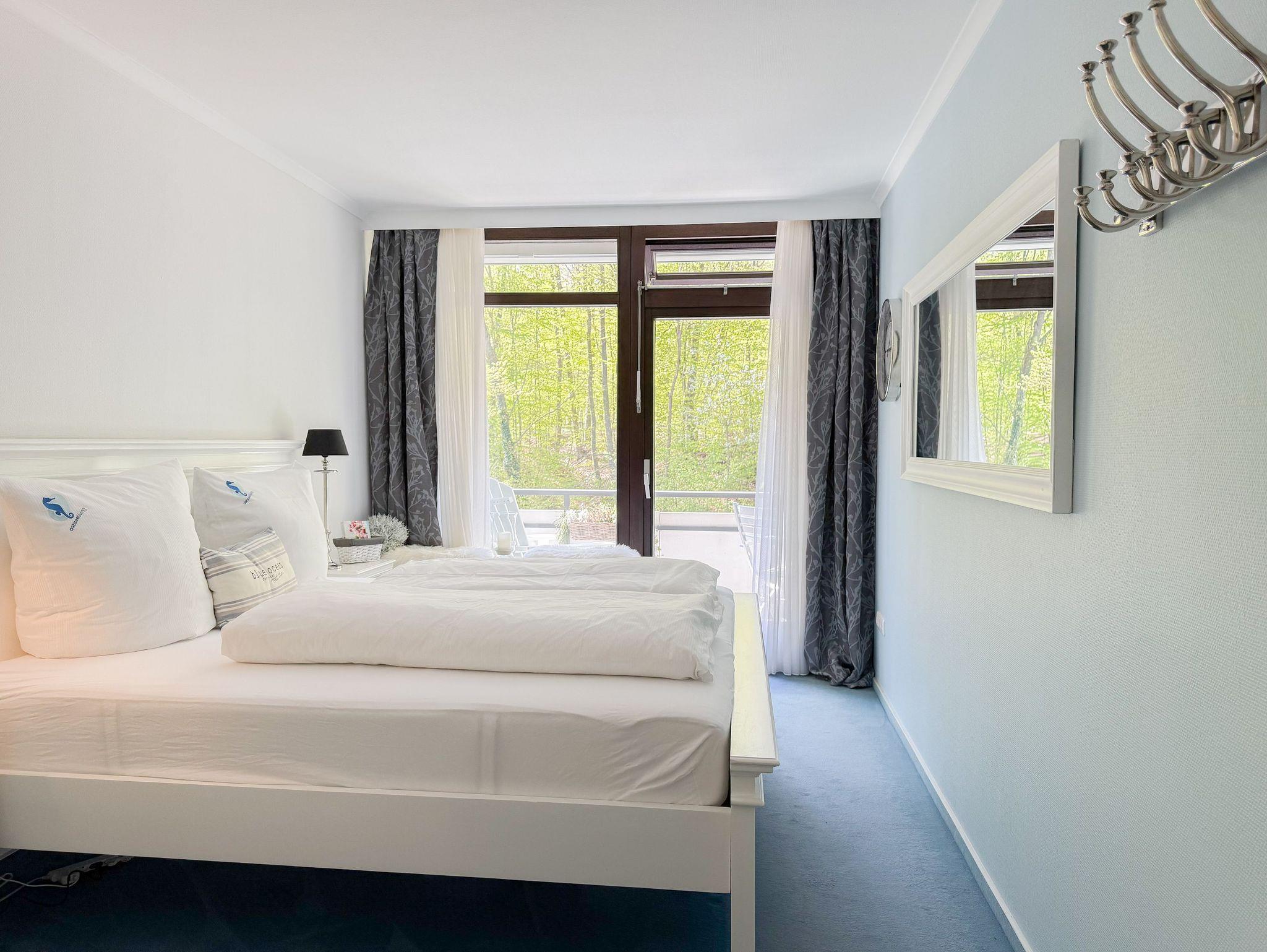 Es erwartet Sie ein stilvoll eingerichteter Rückzugsort, der für 2 Personen ein gemütliches Ambiente bietet, um einen entspannten Ostseeurlaub zu verleben. Der schöne Balkon in Südwestausrichtung, ausgestattet mit Gartenmöbeln und Markise, erstreckt sich über die gesamte Breite der Wohnung und ist sowohl vom Wohnzimmer, als auch vom Schlafzimmer zu begehen. Der großzügige Wohnbereich ist mit einem gemütlichen XL Sofa, TV und WLAN ausgestattet und der anschließende Essbereich ist für 2 Personen eingerichtet. Die integrierte bestens ausgestattete Küche verfügt über eine Durchreiche zum Essbereich. Das Schlafzimmer ist mit einem Doppelbett (180x200), Kleiderschrank und Verdunkelungsvorhängen ausgestattet. Das neue luxuriöse Bad verfügt über Waschtisch, WC, eine bodengleiche Walk In Dusche, Rainshower und Handbrause. Zu der Wohnung gehört ein Tiefgaragenstellplatz (Tor-Durchfahrtshöhe max. 1,90 m), dort können auch 2 Fahrräder vor dem Fahrzeug abgestellt werden. Das Tor ist von innen über den Schalter zu öffnen.[nbsp] Mit dem Fahrstuhl im Erdgeschoß gelangt man entspannt in die 2. Etage.
