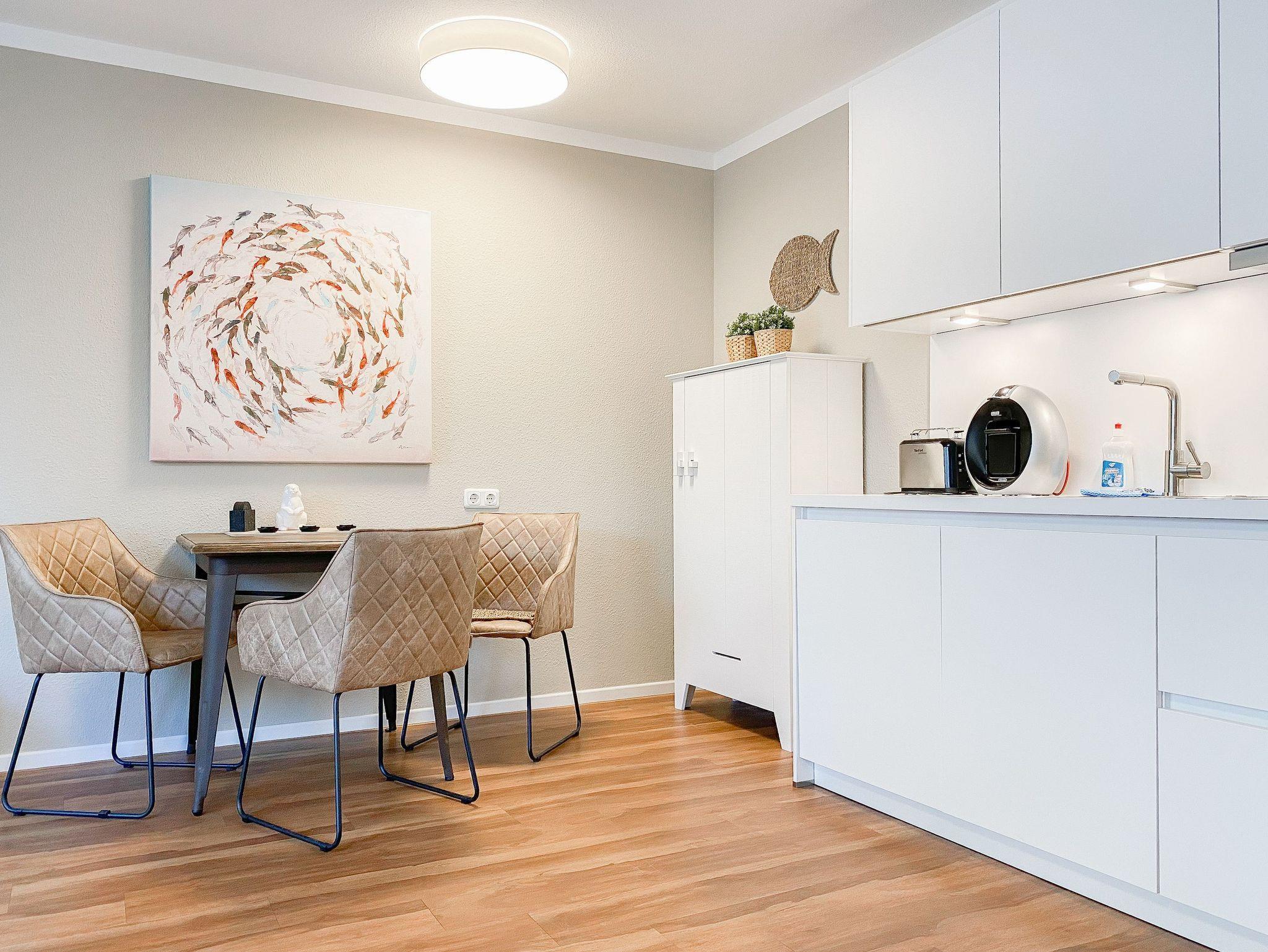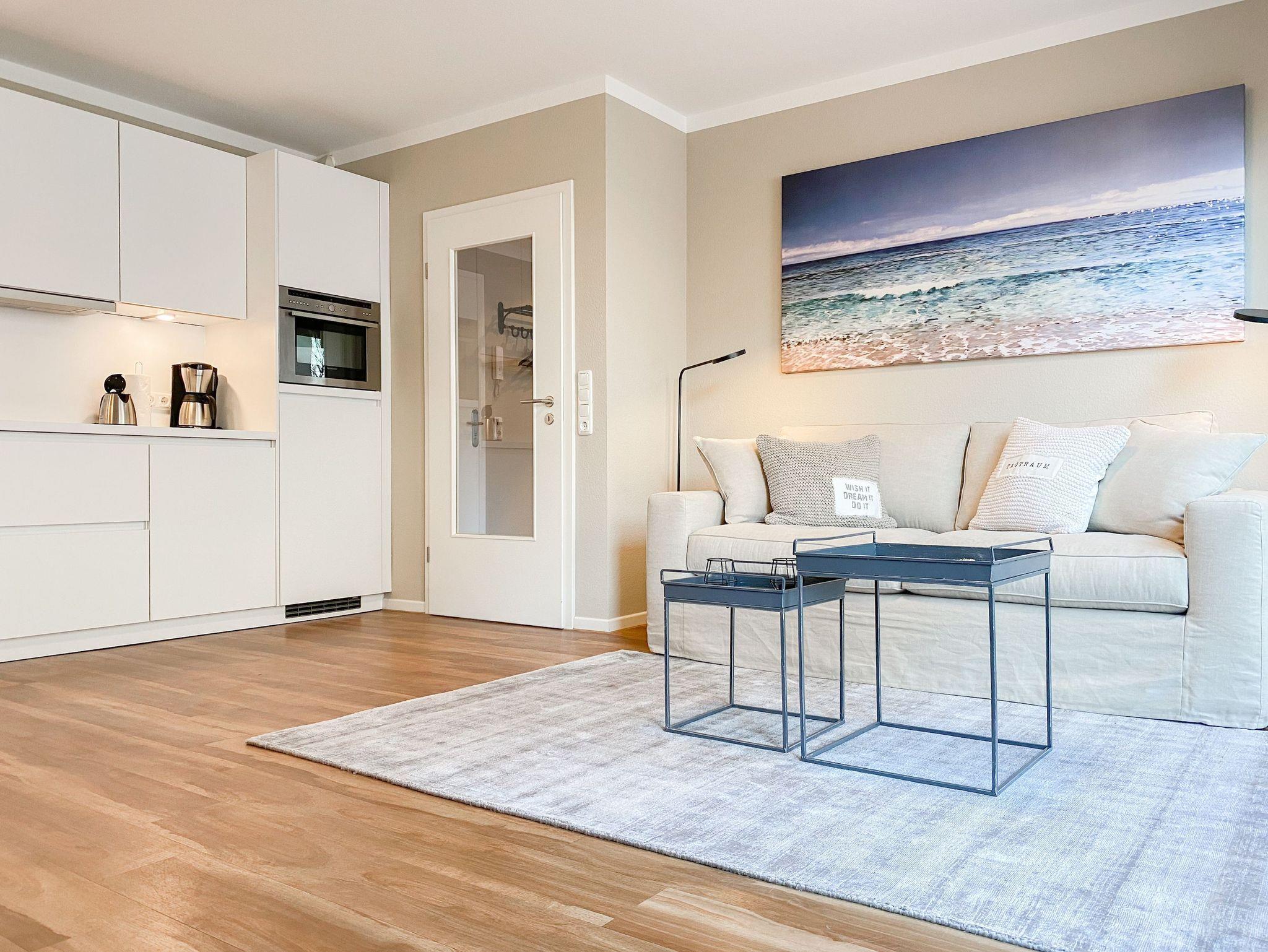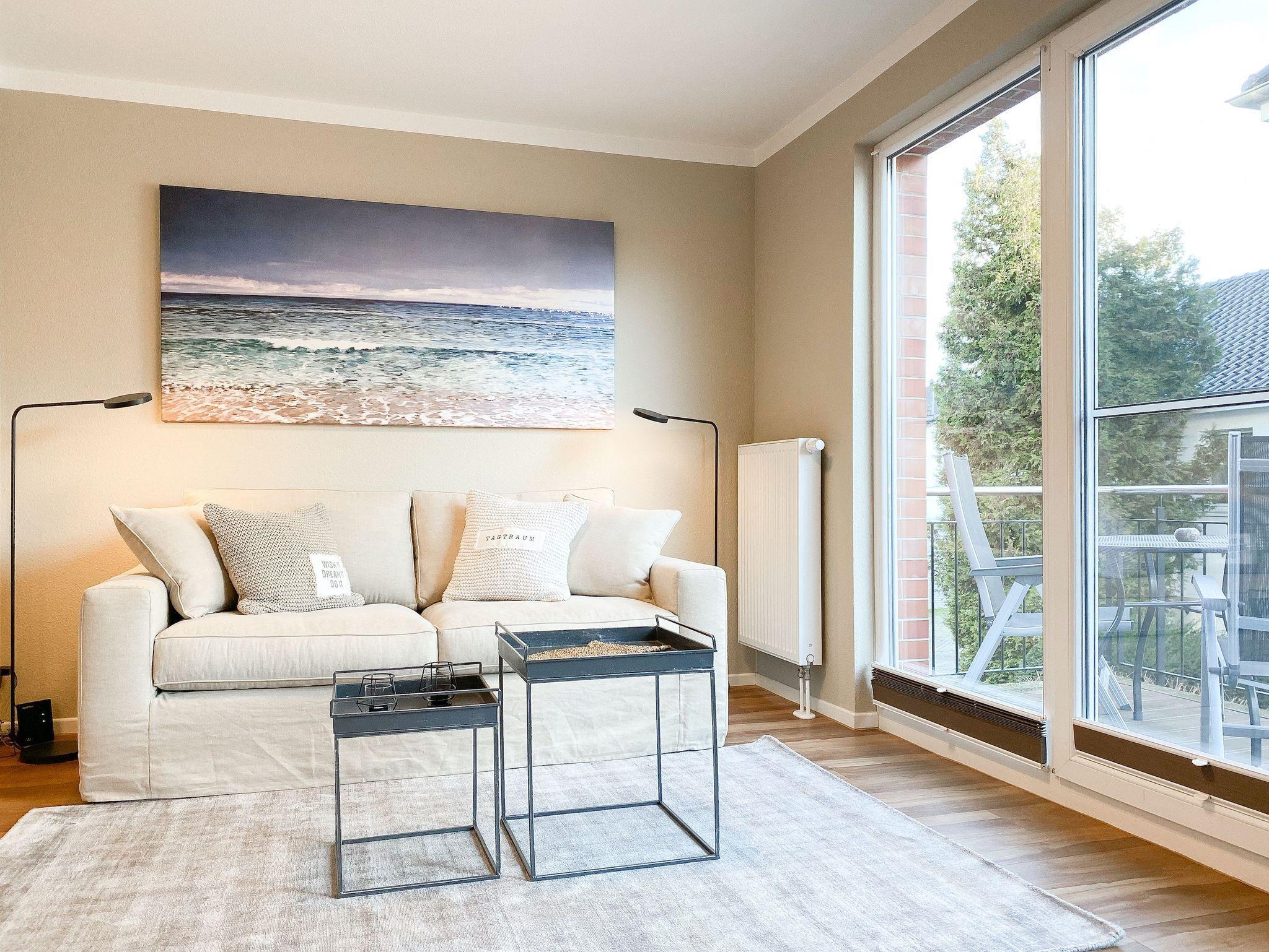 Die Ferienwohnung im 1. Obergeschoss ist hervorragend für[nbsp] 2-3 Personen geeignet und besticht durch ihr durchdachtes Raumkonzept. Es erwartet Sie ein gemütlicher Wohnbereich mit einem hochwertigen Sofa mit Schlaffunktion (140x180), ein anschließender Essbereich für 2 - 3 Personen und eine offene Designküche in bester Ausstattung. Die äußerst hochwertige neue Möblierung im Hampton Style vermittelt Strandflair und lädt zum Wohlfühlen in Strandnähe ein. Der Sonnenbalkon in Südausrichtung ist mit Gartenmöbeln und einer elektrischen Markise ausgestattet. Im Schlafzimmer befindet sich ein hochwertiges Boxspringbett (180x200), ein weiterer TV und die Fenster sind mit Insektenschutz und elektrischen Außenjalousien versehen, sodass ein hoher Schlafkomfort gewährleistet ist. Der Kleiderschrank bietet ausreichend Stauraum für Ihre Urlaubsgarderobe. Das Duschbad verfügt über einen Spiegelschrank mit entsprechender Ablagefläche, einen Handtuchwärmer und Föhn. Ein großer Flatscreen-TV und Radio im Wohnzimmer als auch die kostenlose Nutzung des WLAN gehören zum Entertainmentpaket. Ein fester Parkplatz befindet sich am Haus. Ein Fahrradkeller befindet sich im Untergeschoss und ist über die Treppe im Hausflur zu erreichen. Waschmaschine und Trockner stehen im Keller zur gemeinschaftlichen Nutzung zur Verfügung.