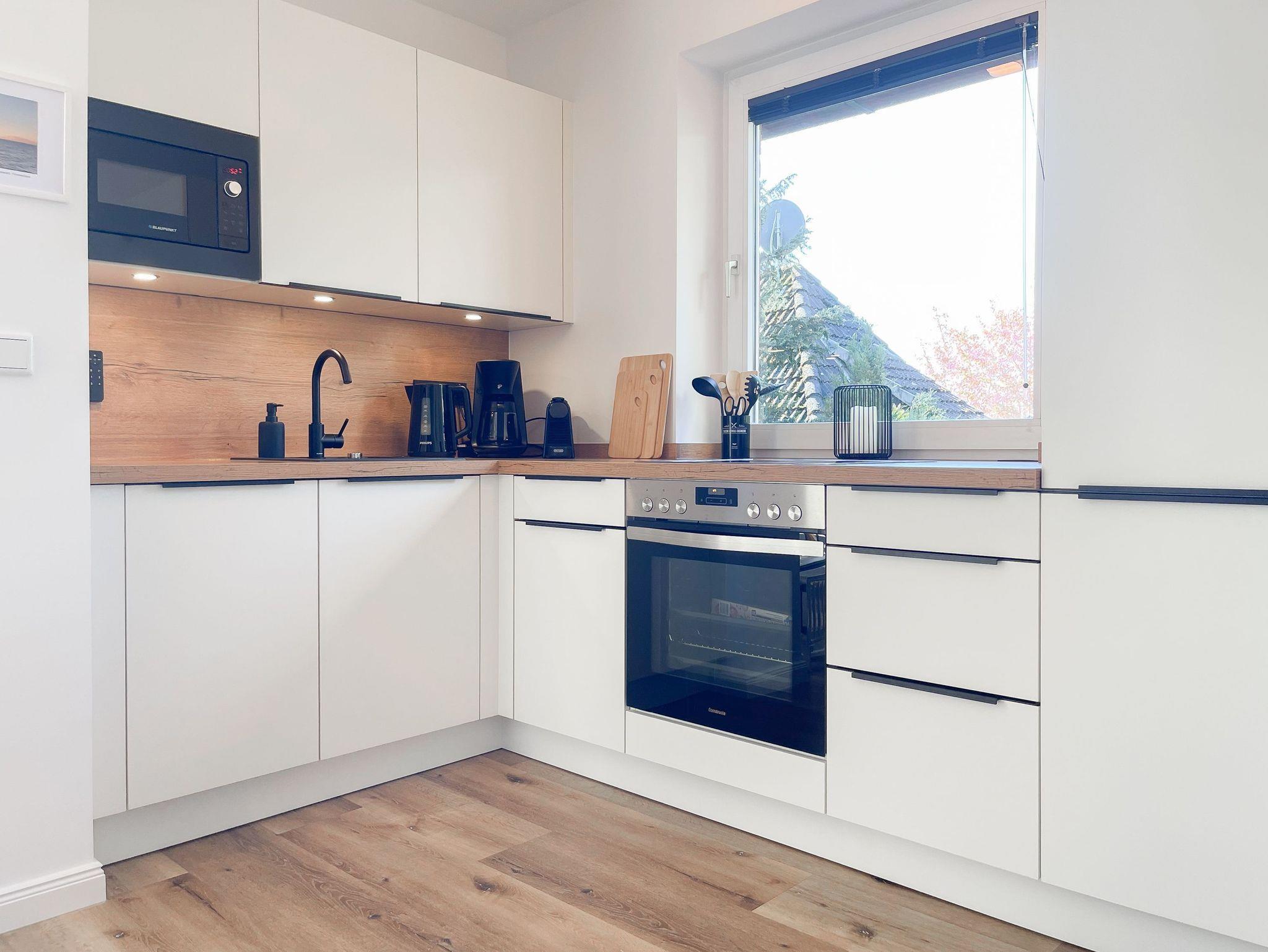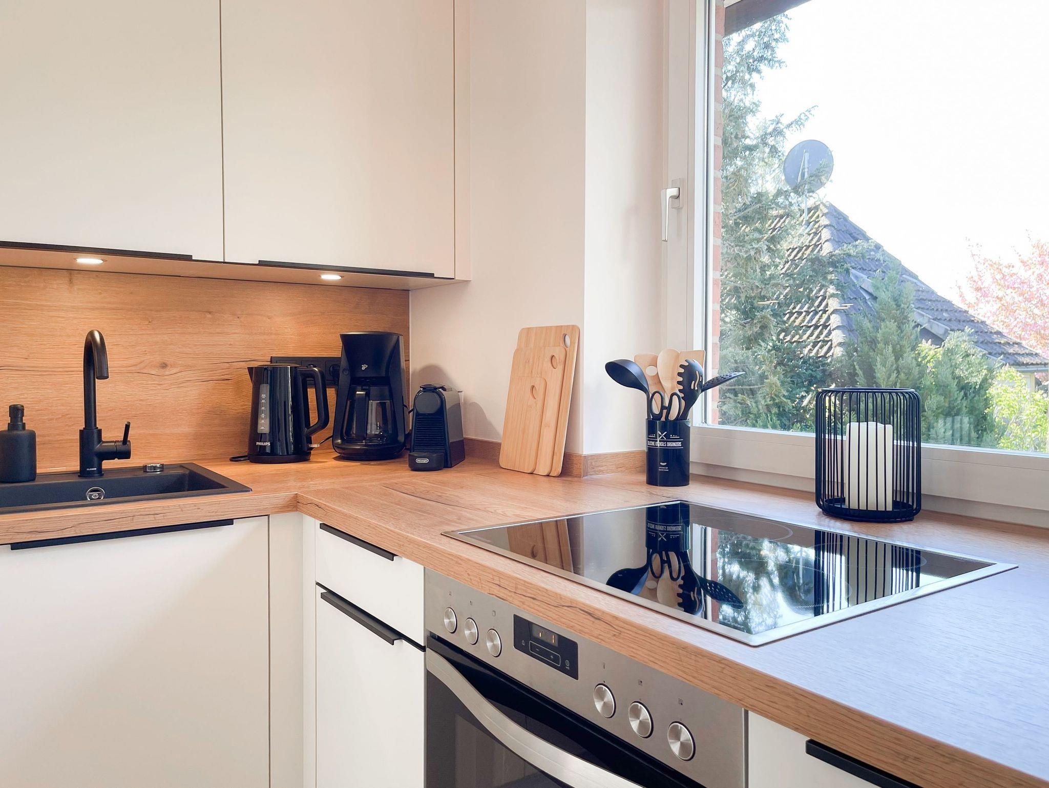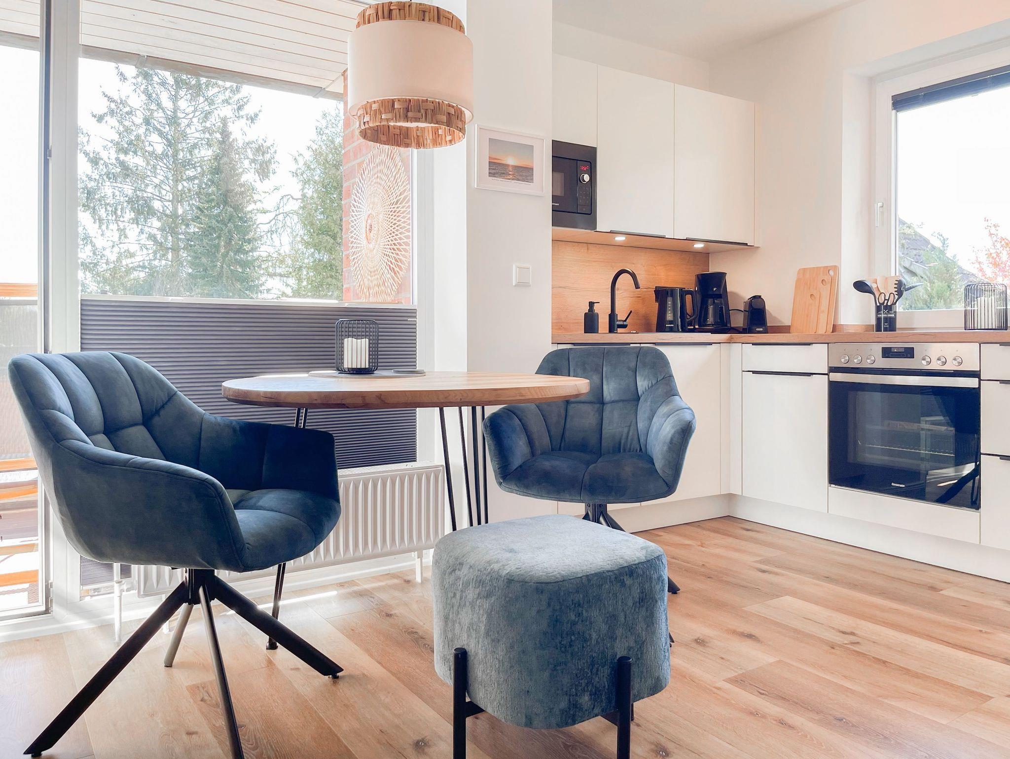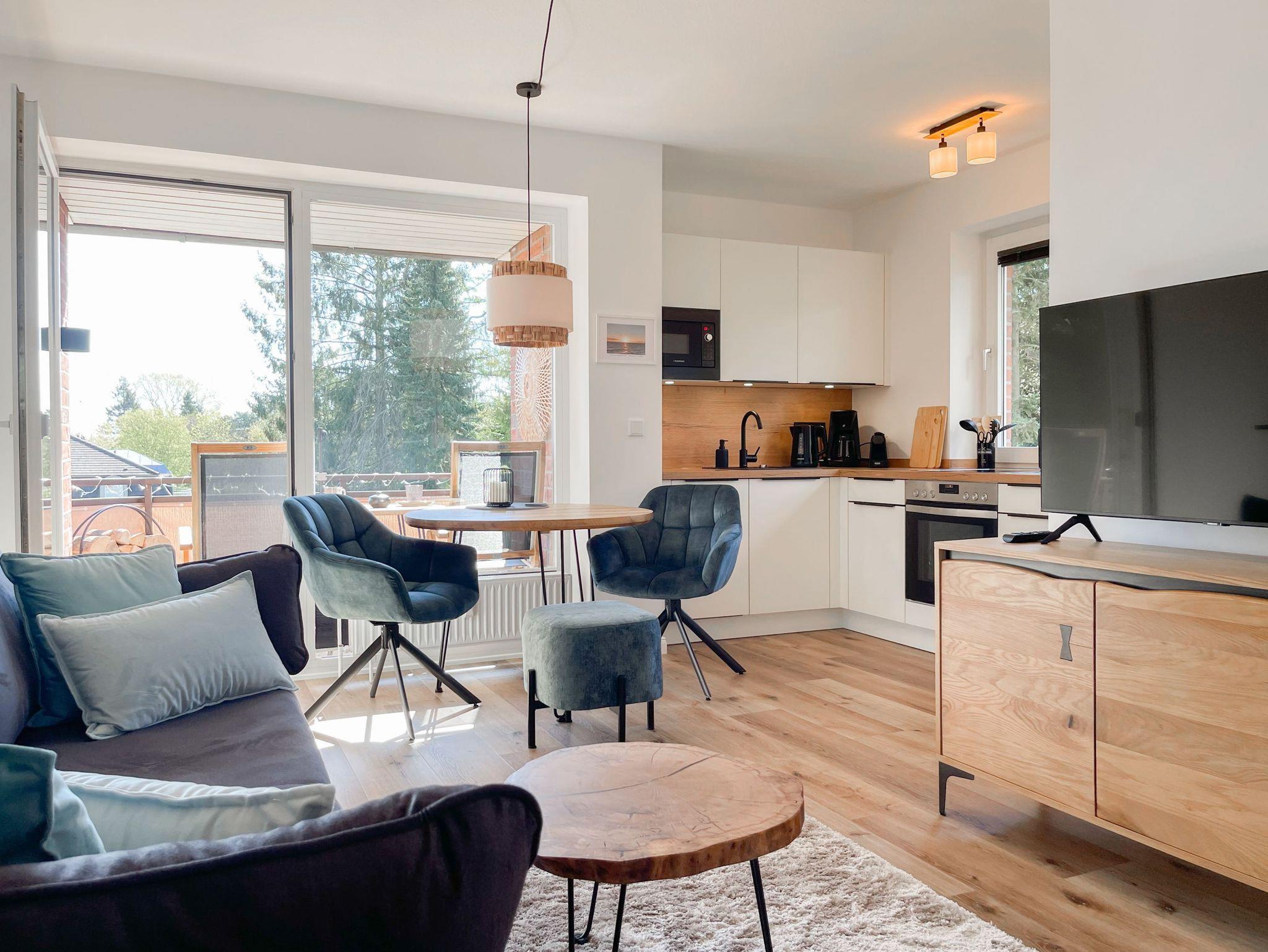 Es erwartet Sie eine hochwertig eingerichtete und bestens ausgestattete Ferienwohnung in der 1. Etage, die perfekt für 2 Personen geeignet ist, um den wohlverdienten Urlaub in einem schönen Ambiente zu verbringen. Der hyggelige Wohnbereich, eingerichtet mit einem Schlafsofa, Smart-TV und Bluetooth-Radio, vermittelt Gemütlichkeit und Wohlbefinden. Der anschließende Essbereich bietet ausreichend Platz und die offene neue Einbauküche in perfekter Ausstattung fügt sich wunderbar in den Wohnraum ein. Sie verfügt unter anderem über Spülmaschine, Backofen, Mikrowelle, Induktionsherd, Gefriermöglichkeit und vieles mehr. Verbringen Sie entspannte Stunden bei Sonnenschein von morgens bis zum frühen Nachmittag auf dem überdachten Balkon, ausgestattet mit Sonnenstühlen und Outdoortisch. Das Schlafzimmer ist mit einem Boxspringbett (180x200)[nbsp] und einem weiteren Smart-TV eingerichtet. Das Fenster ist mit Blackout Plissees zur vollständigen Verdunkelung versehen. Ausreichend Schrankfläche befindet sich im Wohnbereich. Das neue Duschbad ist modern und edel. WLAN steht selbstverständlich zur Verfügung.
