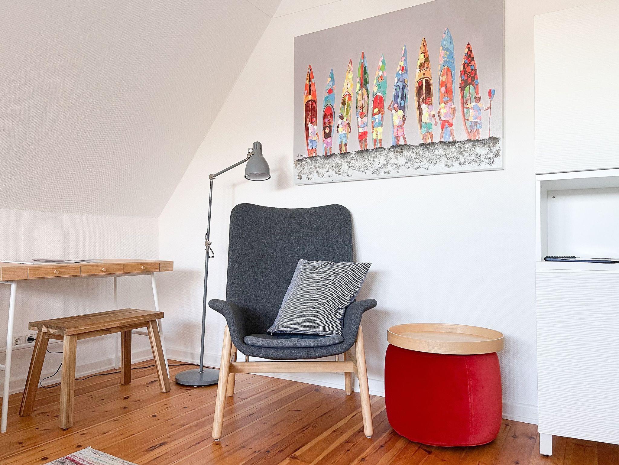 Die liebevoll renovierte Ferienwohnung befindet sich im ersten Obergeschoss eines äußerst charmanten Hauses mit nur 2 Einheiten. Im EG ist eine Praxis für Physiotherapie untergebracht, sodass der gesamte Außenbereich mit großem, eingewachsenen Garten mit Terrasse, Markise, Sonnenliegen, Strandkorb und Gasgrill ausschließlich den Gästen der Ferienwohnung zur Verfügung steht. Zusätzlich steht ein Strandkorb (saisonbedingt Mitte Mai bis Mitte September) zur kostenlosen Nutzung am Strand bereit.