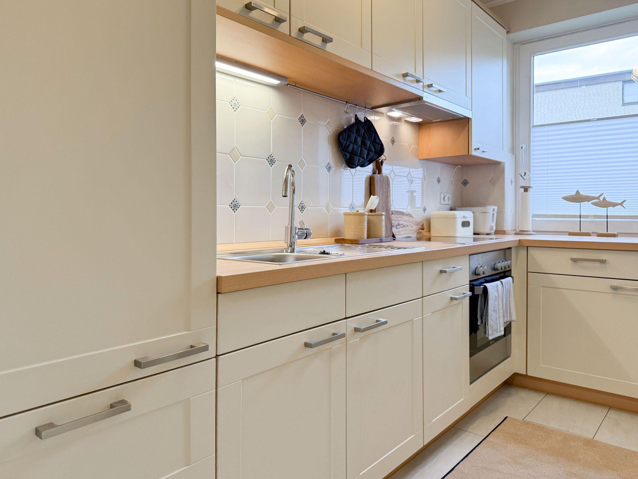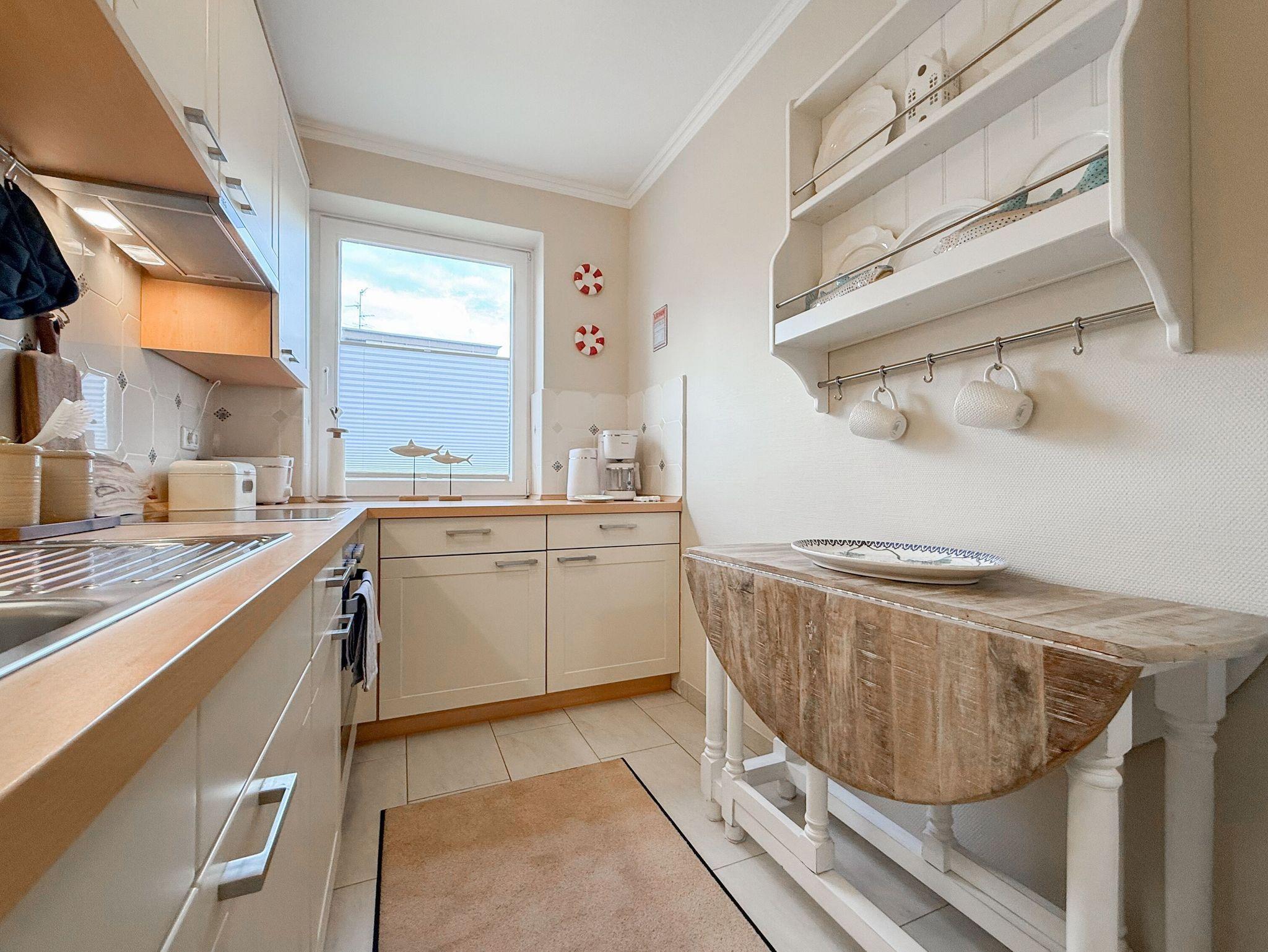 Die äußerst liebevoll und geschmackvoll gestaltete Ferienwohnung bietet Ihnen einen behaglichen Rückzugsort für entspannte Urlaubstage, ohne auf den typischen Charme und die lebendige Lebensart von Timmendorfer Strand zu verzichten. Dank durchdachter Raumaufteilung, hochwertiger Materialien und liebevoller Details entfaltet sich von der ersten Sekunde an eine warme, einladende Atmosphäre, in der Sie sich sofort wie zu Hause fühlen können. Es erwartet Sie ein schöner Wohnbereich, der mit einem Sofa, einem Sessel und TV ausgestattet ist. Der integrierte Essbereich ist großzügig und sehr gemütlich mit Korbsesseln eingerichtet. Genießen Sie sonnige Stunden auf der großzügigen Südwestterrasse, die mit einer Markise sowie Gartenmöbeln ausgestattet ist.[nbsp] Ob frühmorgendlicher Kaffee, ruhige Nachmittage mit einem guten Buch oder ein Glas Wein unter freiem Himmel ? hier finden Sie den perfekten Ort, um den Tag in der Sonne in vollen Zügen zu genießen. Die separate Küche ist bestens ausgestattet, damit Sie bequem kochen und genießen können ? hier finden Sie alles, was Sie brauchen. Das Schlafzimmer verfügt über ein Doppelbett (180x200), zwei große Kleiderschränke mit reichlich Stauraum, die Fenster lassen sich durch spezielle Vorhänge verdunkeln. Das Bad ist mit Waschtisch, Dusche, WC und Handtuchtrockner ausgestattet. Ein praktischer Abstellraum befindet sich im Flurbereich.