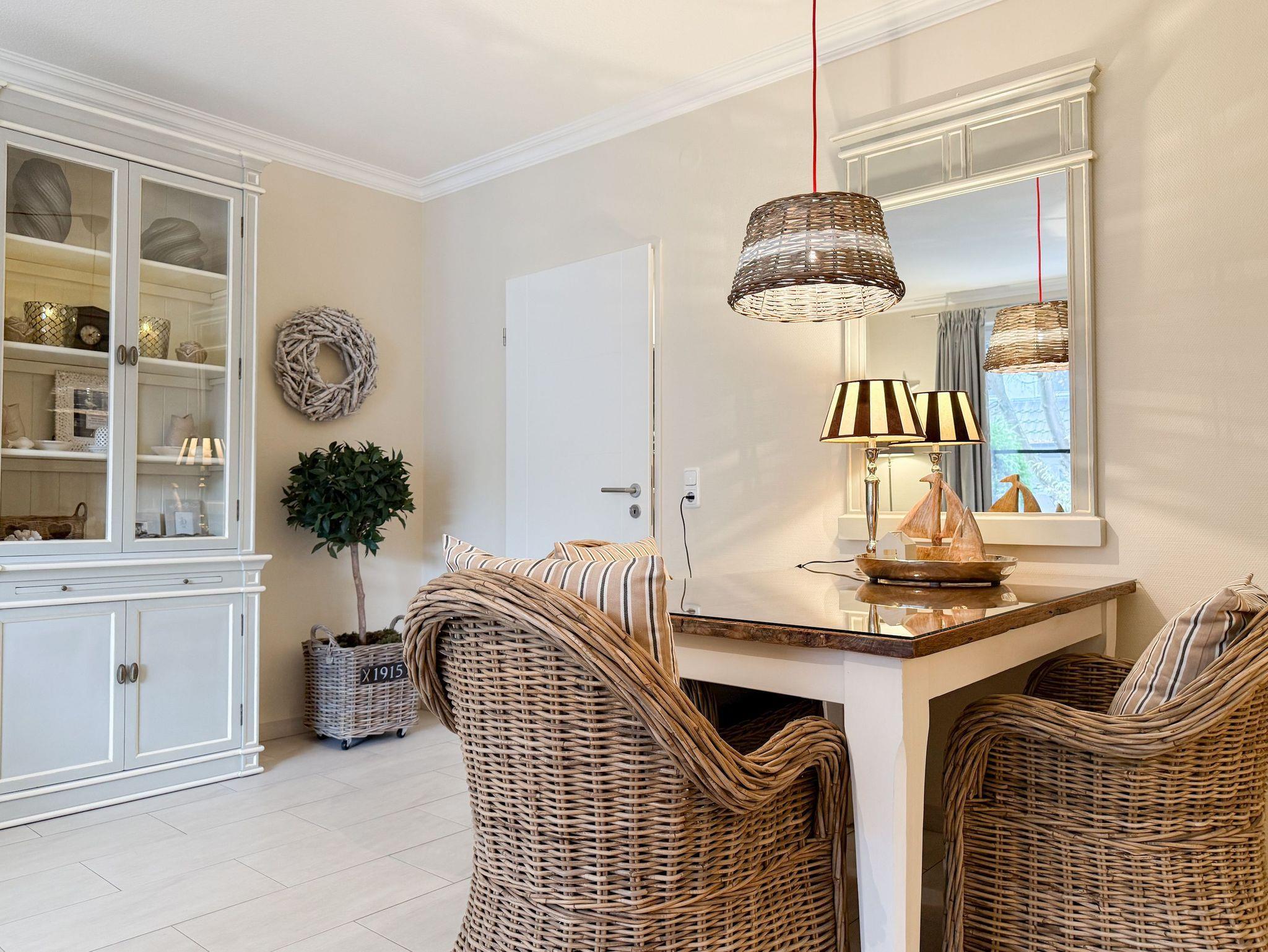Die äußerst liebevoll und geschmackvoll gestaltete Ferienwohnung bietet Ihnen einen behaglichen Rückzugsort für entspannte Urlaubstage, ohne auf den typischen Charme und die lebendige Lebensart von Timmendorfer Strand zu verzichten. Dank durchdachter Raumaufteilung, hochwertiger Materialien und liebevoller Details entfaltet sich von der ersten Sekunde an eine warme, einladende Atmosphäre, in der Sie sich sofort wie zu Hause fühlen können. Es erwartet Sie ein schöner Wohnbereich, der mit einem Sofa, einem Sessel und TV ausgestattet ist. Der integrierte Essbereich ist großzügig und sehr gemütlich mit Korbsesseln eingerichtet. Genießen Sie sonnige Stunden auf der großzügigen Südwestterrasse, die mit einer Markise sowie Gartenmöbeln ausgestattet ist.[nbsp] Ob frühmorgendlicher Kaffee, ruhige Nachmittage mit einem guten Buch oder ein Glas Wein unter freiem Himmel hier finden Sie den perfekten Ort, um den Tag in der Sonne in vollen Zügen zu genießen. Die separate Küche ist bestens ausgestattet, damit Sie bequem kochen und genießen können hier finden Sie alles, was Sie brauchen. Das Schlafzimmer verfügt über ein Doppelbett (180x200), zwei große Kleiderschränke mit reichlich Stauraum, die Fenster lassen sich durch spezielle Vorhänge verdunkeln. Das Bad ist mit Waschtisch, Dusche, WC und Handtuchtrockner ausgestattet. Ein praktischer Abstellraum befindet sich im Flurbereich.
