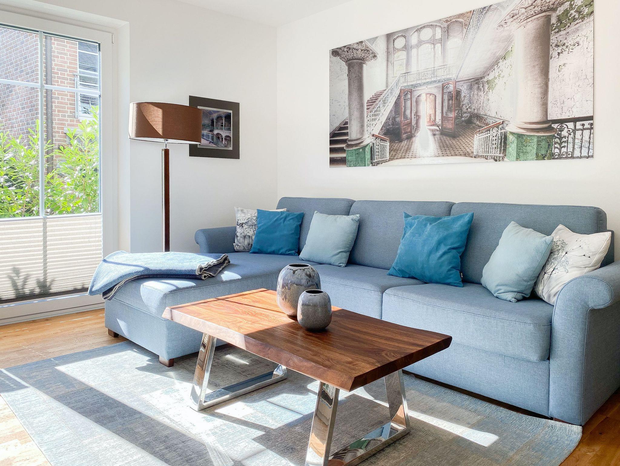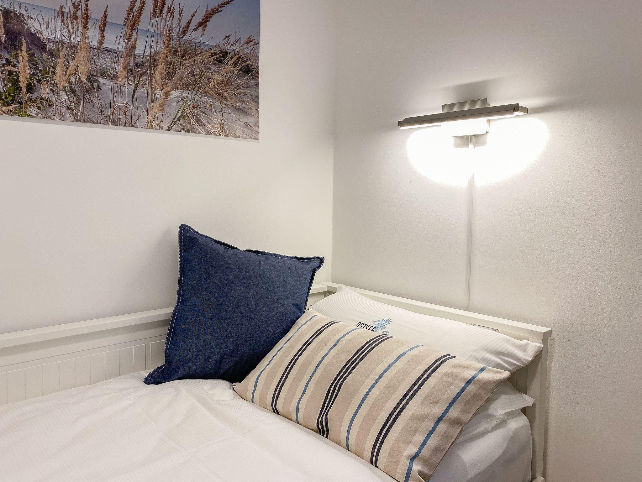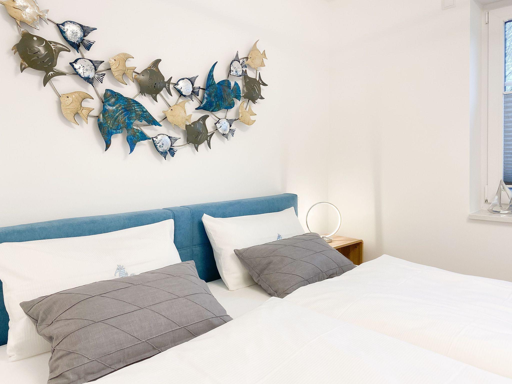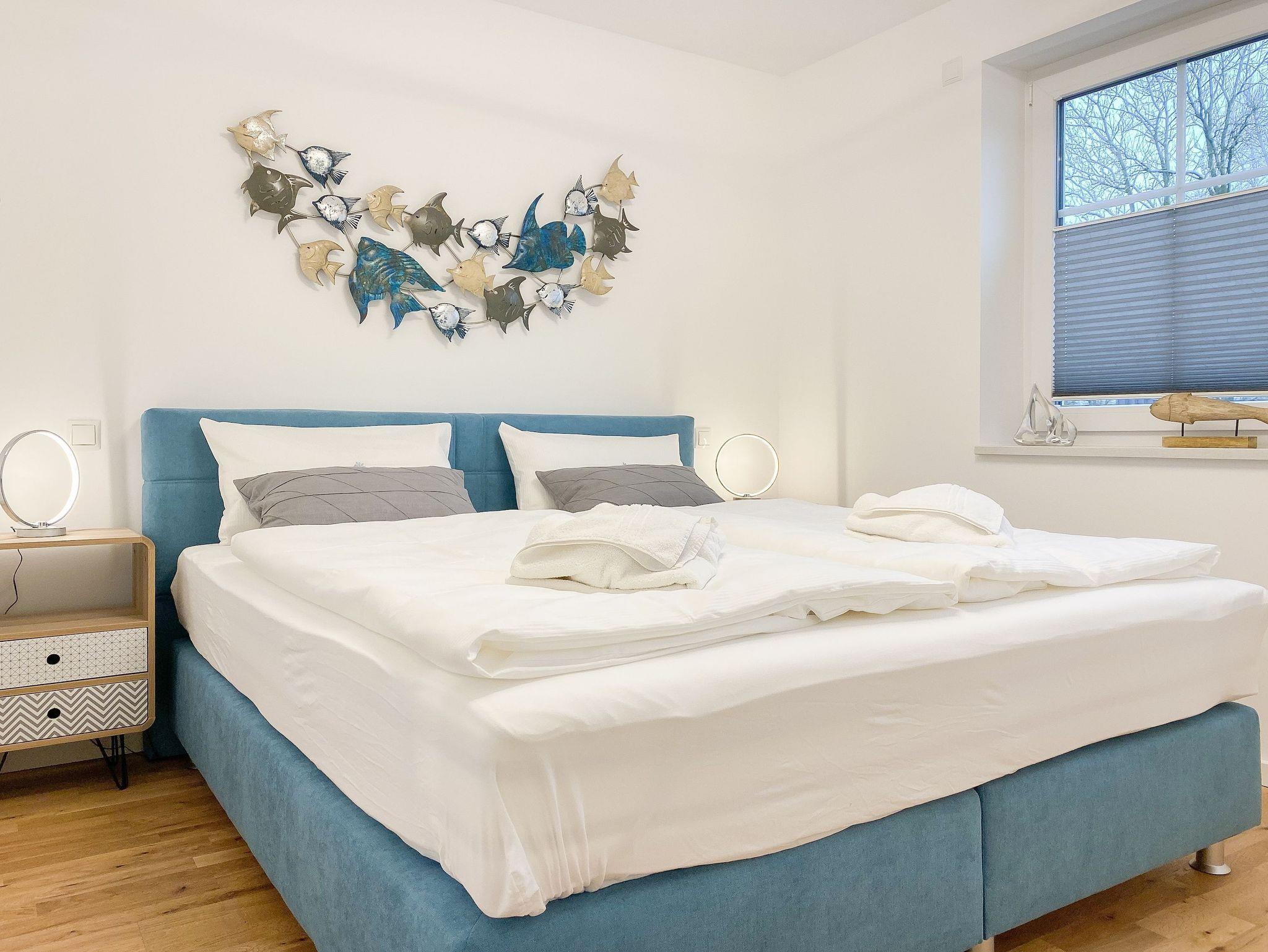 Der großzügig gestaltete Wohn-Essbereich ist äußerst geschmackvoll eingerichtet.[nbsp] Hier erwartet Sie unter anderem eine hochwertige Ausziehcouch, die sich schnell in einen vollwertigen Schlafplatz (160 x 200) verwandeln lässt. Eine offene und gut ausgestattete Küche lässt den Raum noch großzügiger erscheinen und bodentiefen Fenster sorgen für lichtdurchflutete Räume. Bei Bedarf können diese mit elektrischen Jalousien verdunkelt werden. Eine Fußbodenheizung sorgt bei kälteren Temperaturen für zusätzliche Behaglichkeit. Das große Schlafzimmer ist mit einem Boxspringbett (180 x 200) ausgestattet. Hier können Sie nach einem ereignisreichen Urlaubstag perfekt zur Ruhe kommen. Ein weiteres Zimmer verfügt über ein Kojen-Bett, das Sie bequem zu einem Doppelbett (160x200) ausziehen können. Das Badezimmer ist mit einer ebenerdigen Dusche und einem Handtuchwärmer versehen und ein separates Gäste WC steht Ihnen ebenfalls zur Verfügung. Besonders einladend ist die nach hinten gelegene, teilweise überdachte Außenterrasse, die mit hochwertigen Gartenmöbeln ausgestattet ist. Hier können Sie die Sonnenstunden genießen und die Seele baumeln lassen oder einen wunderschönen Urlaubstag an der frischen Seeluft ausklingen lassen. Liebevoll ausgesuchte Dekorationselemente sorgen für ein unverwechselbares maritimes Flair in der ganzen Wohnung.