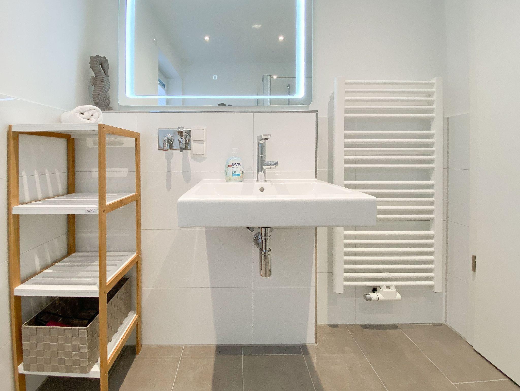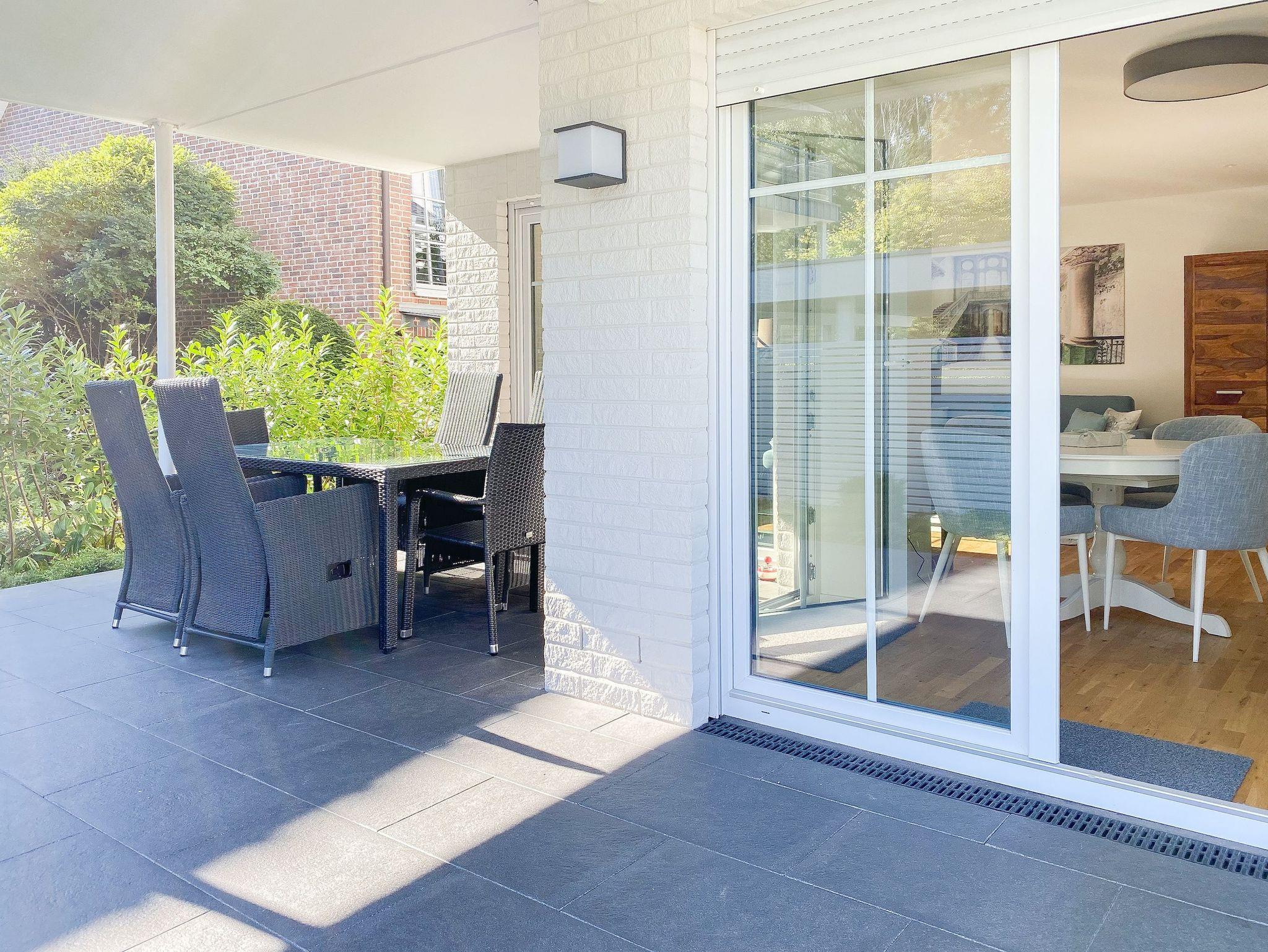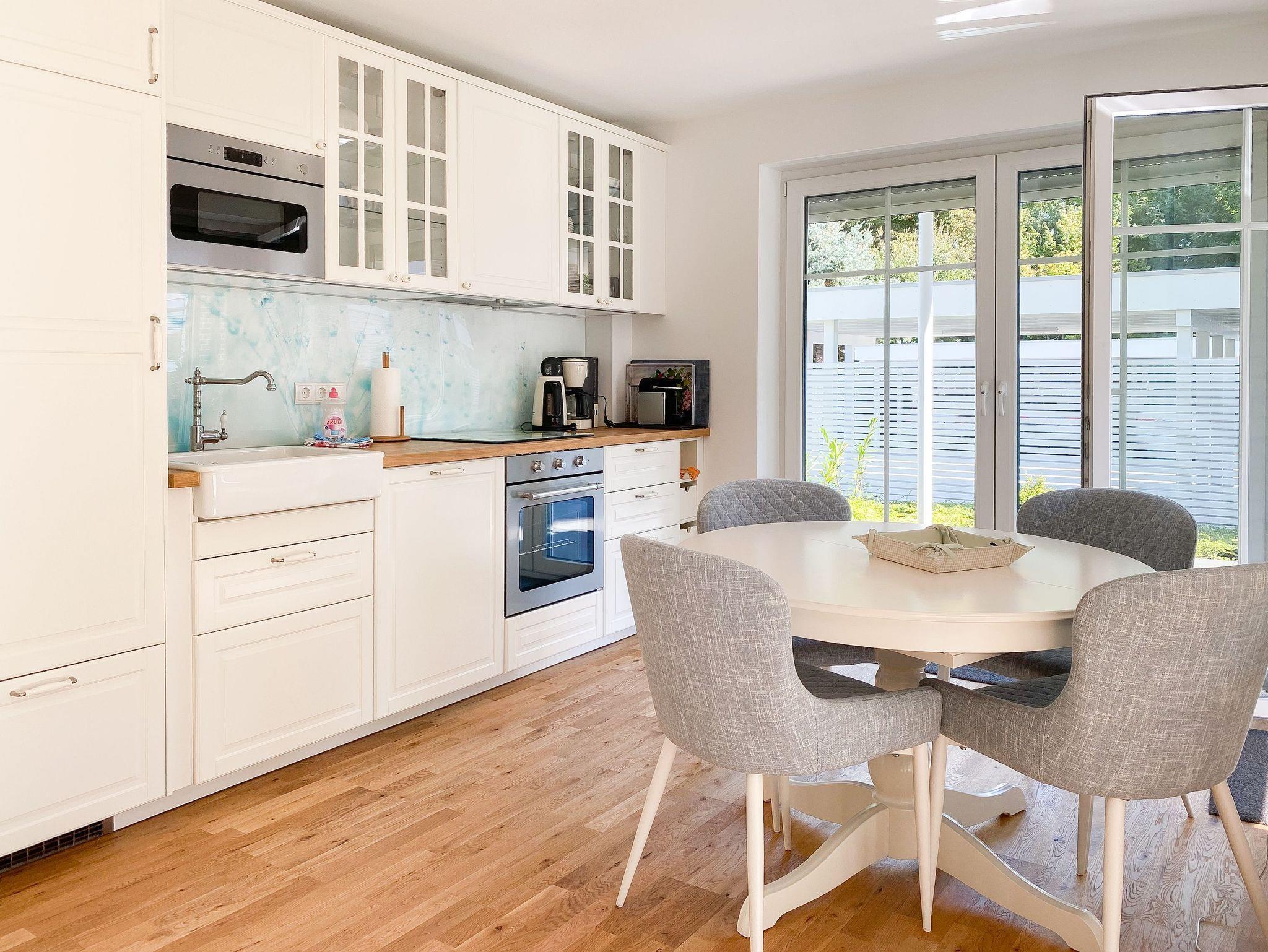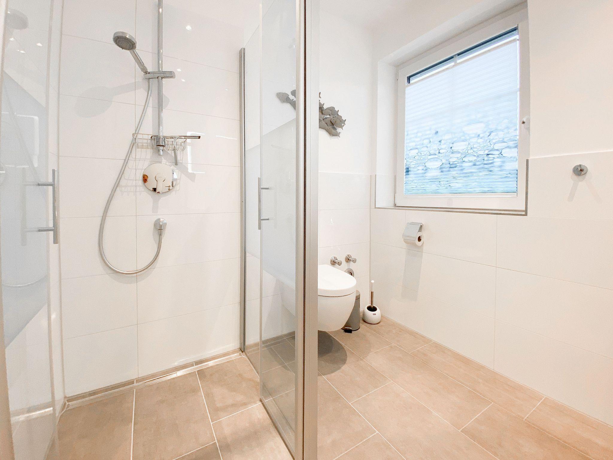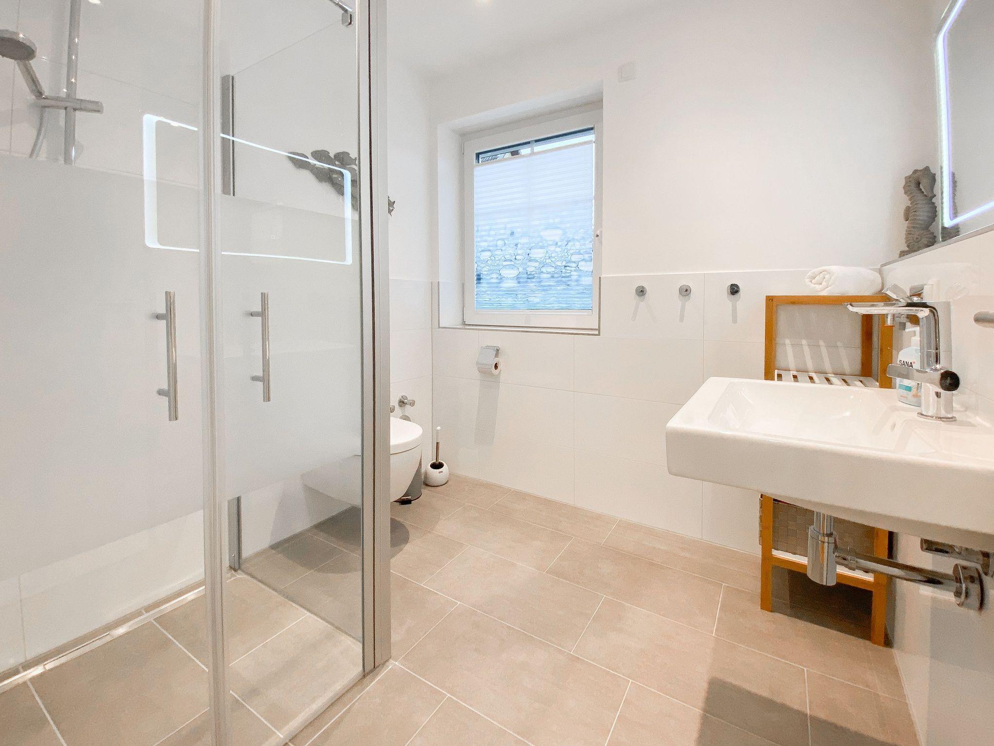 Der großzügig gestaltete Wohn-Essbereich ist äußerst geschmackvoll eingerichtet.[nbsp] Hier erwartet Sie unter anderem eine hochwertige Ausziehcouch, die sich schnell in einen vollwertigen Schlafplatz (160 x 200) verwandeln lässt. Eine offene und gut ausgestattete Küche lässt den Raum noch großzügiger erscheinen und bodentiefen Fenster sorgen für lichtdurchflutete Räume. Bei Bedarf können diese mit elektrischen Jalousien verdunkelt werden. Eine Fußbodenheizung sorgt bei kälteren Temperaturen für zusätzliche Behaglichkeit. Das große Schlafzimmer ist mit einem Boxspringbett (180 x 200) ausgestattet. Hier können Sie nach einem ereignisreichen Urlaubstag perfekt zur Ruhe kommen. Ein weiteres Zimmer verfügt über ein Kojen-Bett, das Sie bequem zu einem Doppelbett (160x200) ausziehen können. Das Badezimmer ist mit einer ebenerdigen Dusche und einem Handtuchwärmer versehen und ein separates Gäste WC steht Ihnen ebenfalls zur Verfügung. Besonders einladend ist die nach hinten gelegene, teilweise überdachte Außenterrasse, die mit hochwertigen Gartenmöbeln ausgestattet ist. Hier können Sie die Sonnenstunden genießen und die Seele baumeln lassen oder einen wunderschönen Urlaubstag an der frischen Seeluft ausklingen lassen. Liebevoll ausgesuchte Dekorationselemente sorgen für ein unverwechselbares maritimes Flair in der ganzen Wohnung.