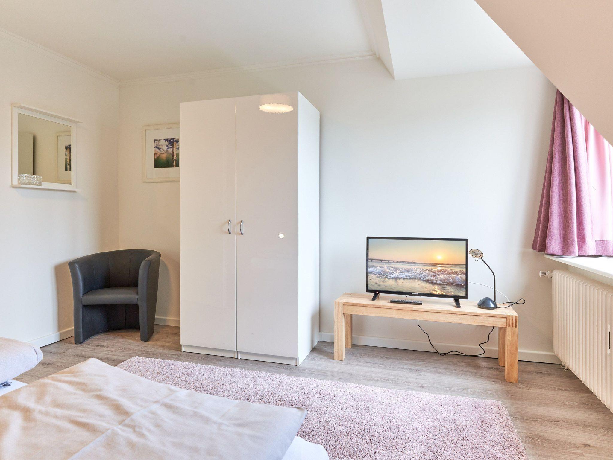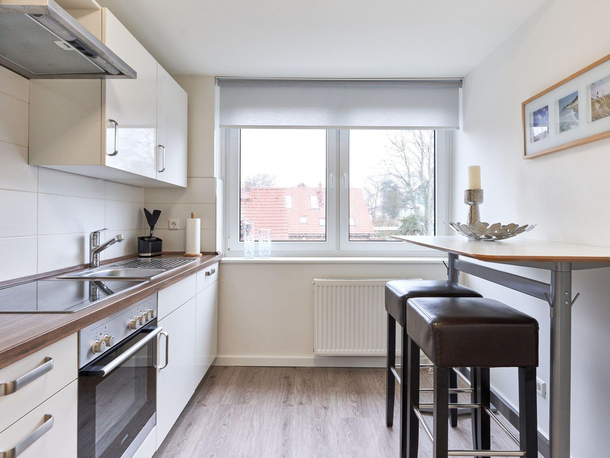 Dieses in 2022 umfassend renovierte und großzügig geschnittene Apartment teilt sich auf in Küche, Tageslichtbad, 2 große Schlafzimmer, Wohnbereich und möblierten Balkon. Die Einbauküche ist komplett ausgestattet, mit einem Kaffeetresen, Geschirrspüler und neuer Filter Kaffeemaschine eingerichtet. Im komplett neu gestalteten Badezimmer finden Sie eine Echtglasdusche, Lichtspiegel, neue Badobjekte mit Unterschrank sowie einen Badheizkörper für Handtücher. Der moderne, helle Wohnbereich ist mit großen Fenstern. gemütlicher Sitzecke (mit Schlafoption für eine fünfte Person), Flachbildschirmfernseher, sowie einem Essplatz ausgestattet. Beide Schlafzimmer sind mit einem Doppelbett eingerichtet, ein Schlafzimmer bietet einen extra Fernseher. Verdunkelungsgardinen sorgen in Wohn- und Schlafzimmern für eine gemütliche Atmosphäre und ungestörten Schlaf.