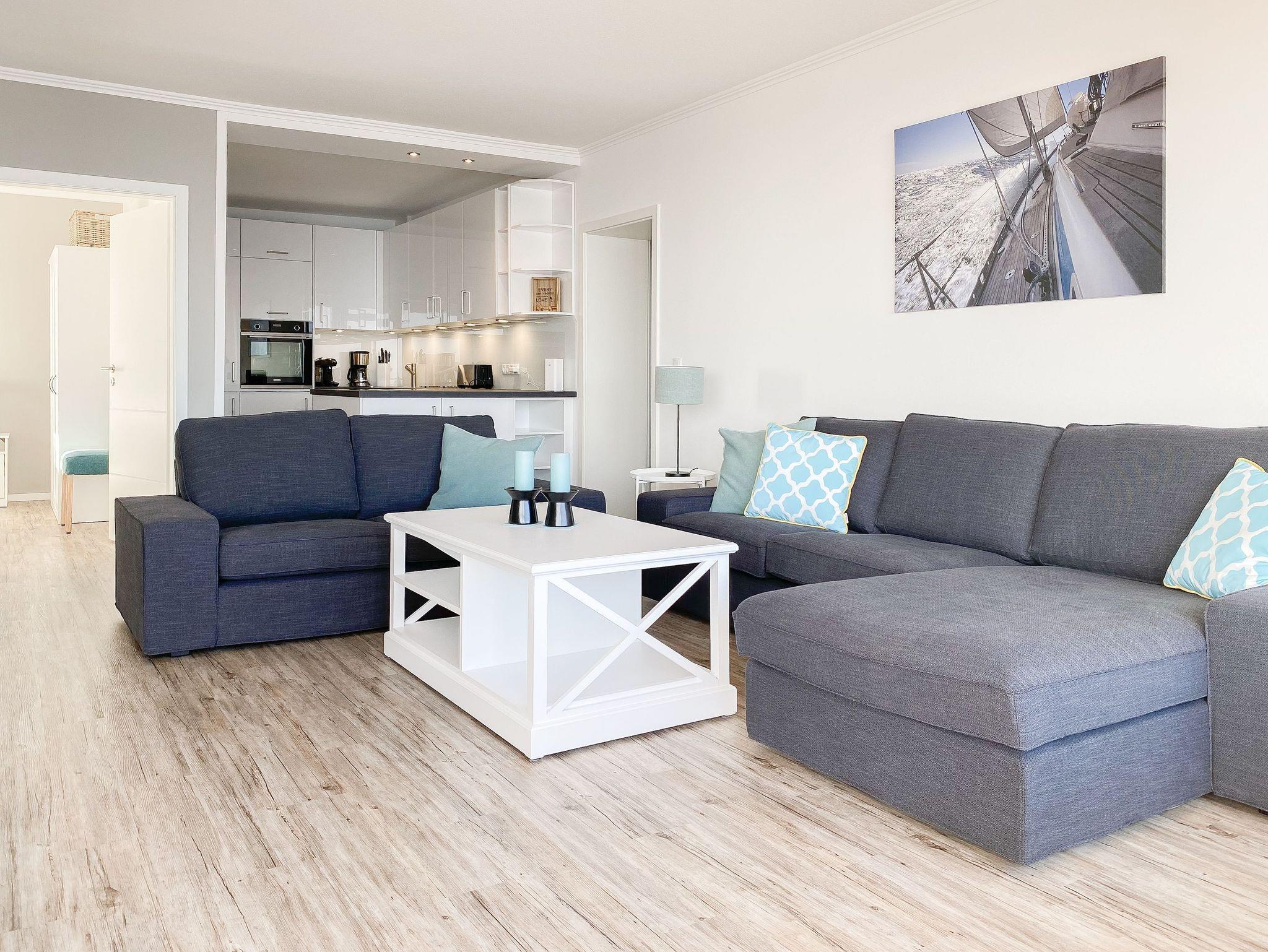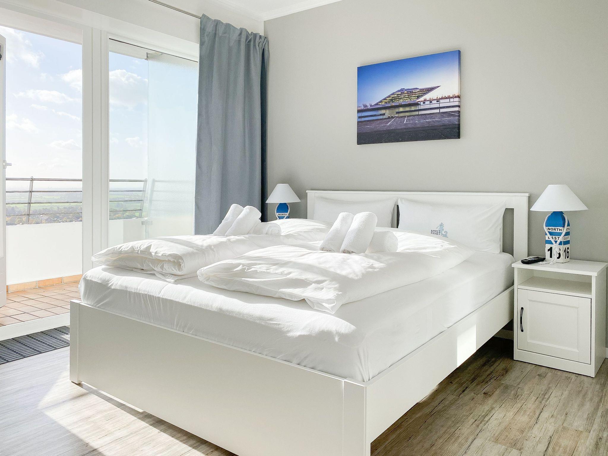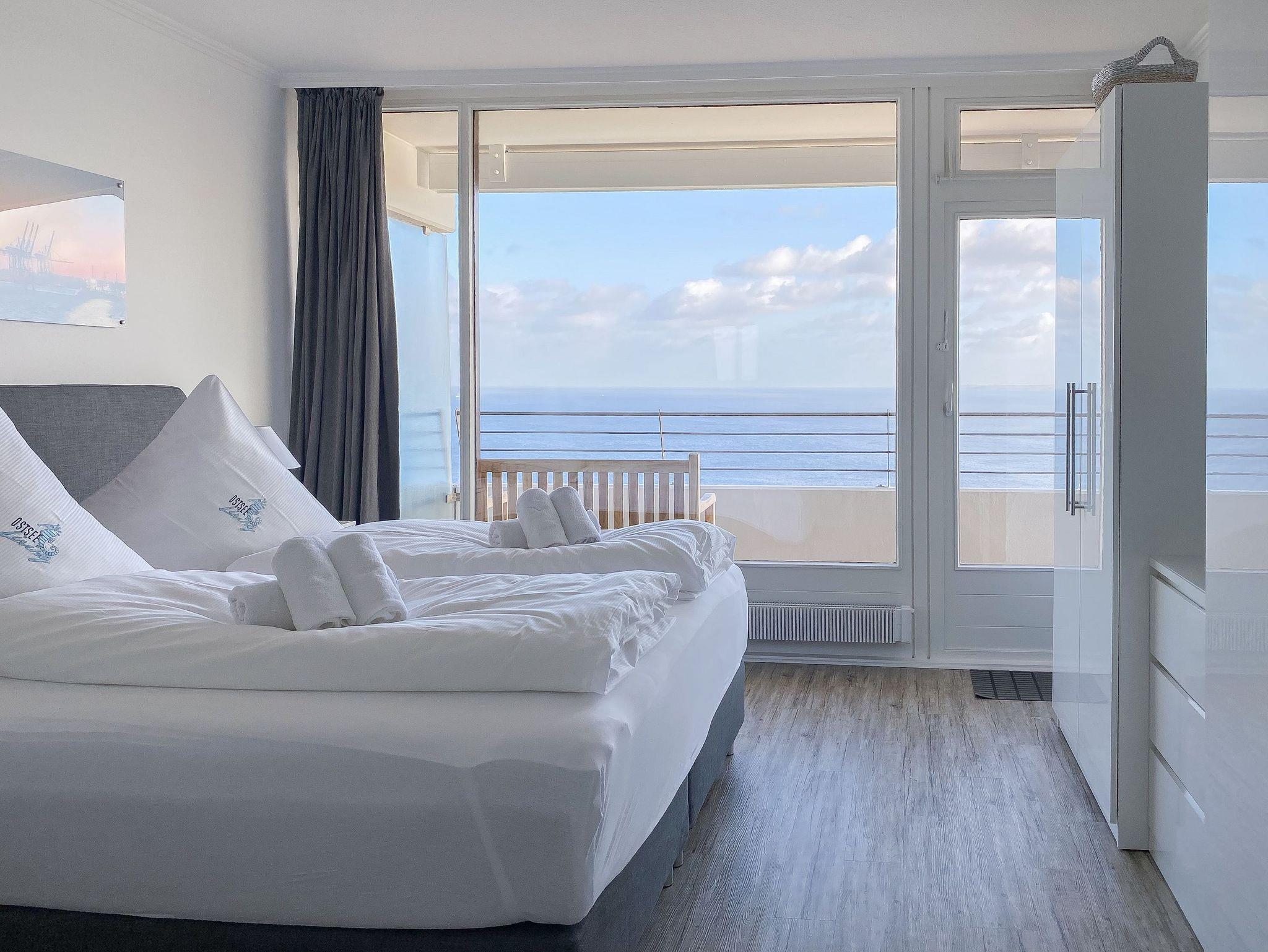 Die großzügige Eckwohnung bietet mit 2 Schlafzimmern und 2 Bädern höchsten Wohnkomfort auf 120 qm für 4 Personen. Sie verfügt über einen umlaufenden Sonnenbalkon mit elektrischer Markise, der sowohl vom Wohnbereich als auch von beiden Schlafzimmern zugänglich ist. Genießen Sie tagsüber das traumhafte Meerblickpanorama aus nahezu jedem Raum und bei Dunkelheit die besondere Atmosphäre der beleuchteten Lübecker Bucht. Es steht ein großzügiges[nbsp] Wohnzimmer mit anschließendem Essbereich für 4 Personen zur Verfügung. In der offenen, bestens ausgestatteten Designküche mit Induktionskochfeld und Spülmaschine, ist zusätzlich eine Waschmaschine integriert. Die beiden Schlafzimmer mit wunderschönem Meerblick sind jeweils mit einem Doppelbett (180x200 und 160x200) und TV ausgestattet. Die Fenster sind mit Verdunkelungsvorhängen versehen. Zwei neue, hochwertige Duschbäder runden das Angebot ab. Ein fester PKW Stellplatz in der Hotelgarage (Einfahrtshöhe 1,90/kein Aufzug) ist inklusive. Bei Verlust der Parkkarte ist Ersatz zu leisten.