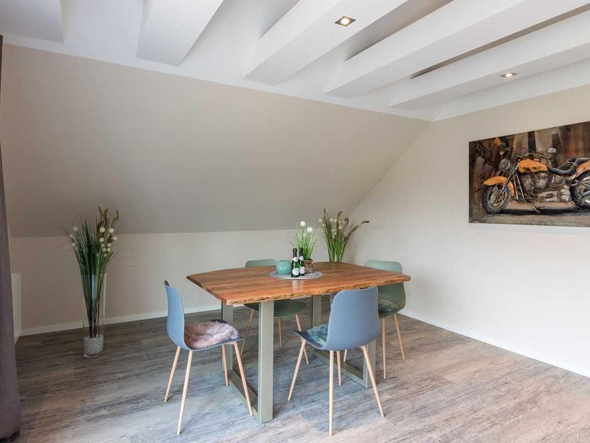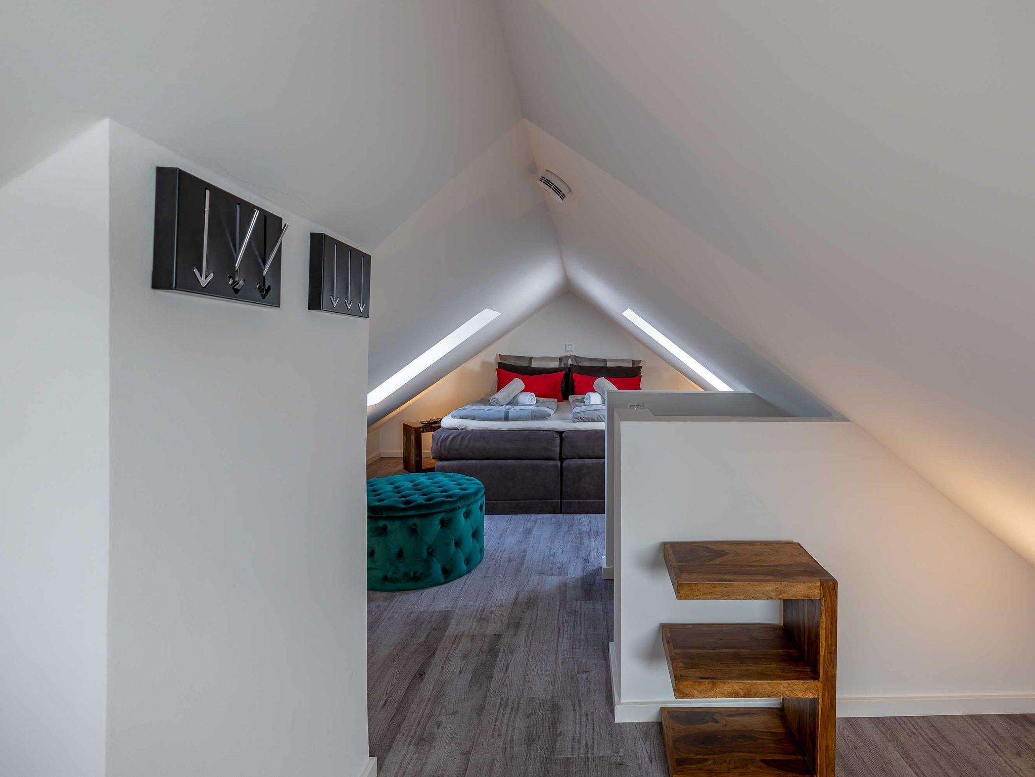 Sie schlafen in traumhaften Boxspringbetten – und für den entspannten Luxus tagsüber stehen zwei stilvolle Sofas und ein gemütlicher Esstisch zur Verfügung. Kinder dürfen sich im Spitzboden austoben oder vielleicht eine Runde Playstation spielen.