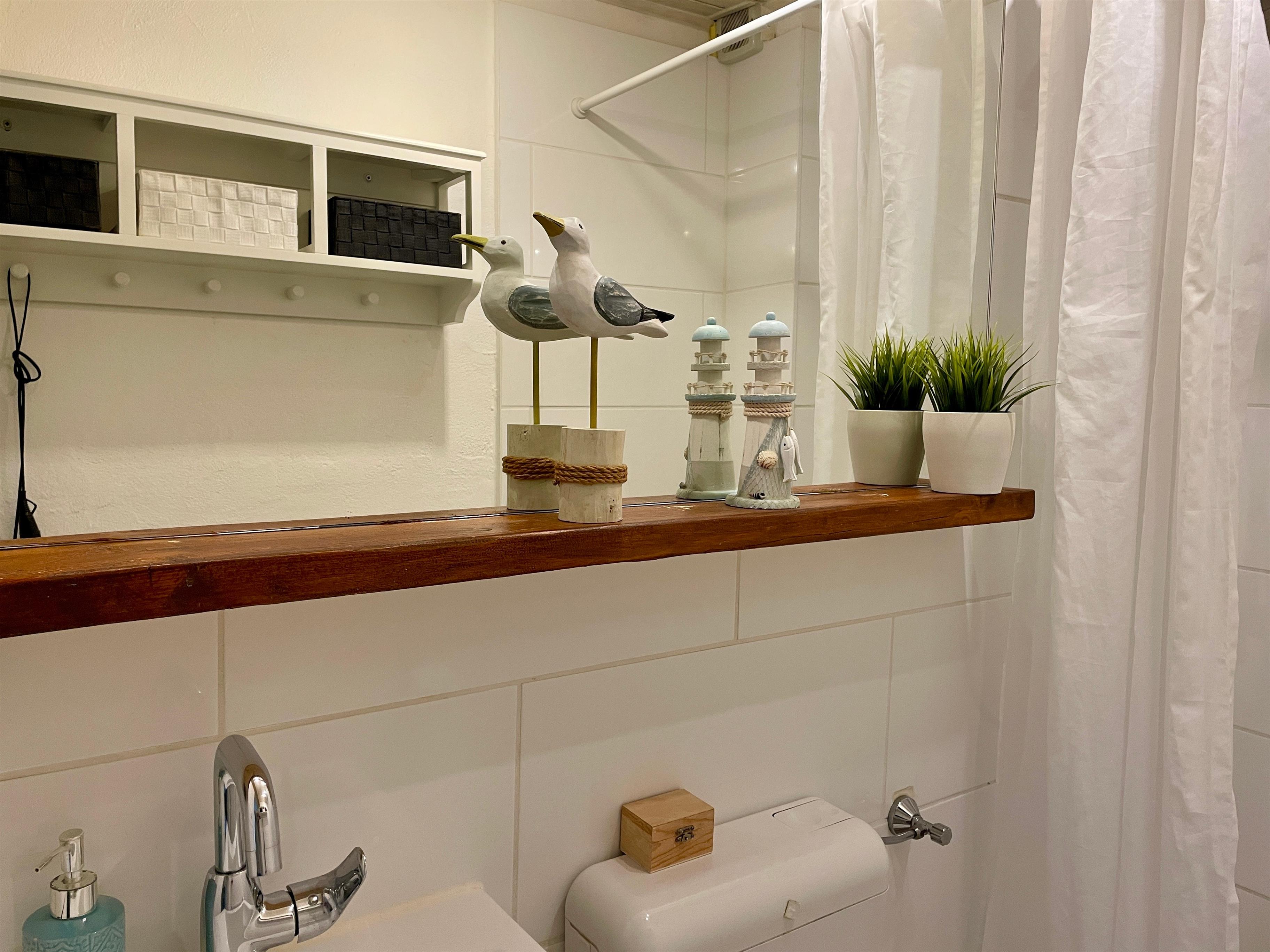 Das Badezimmer ist ausgestattet mit einer modernen Dusche und einem Haartrockner.