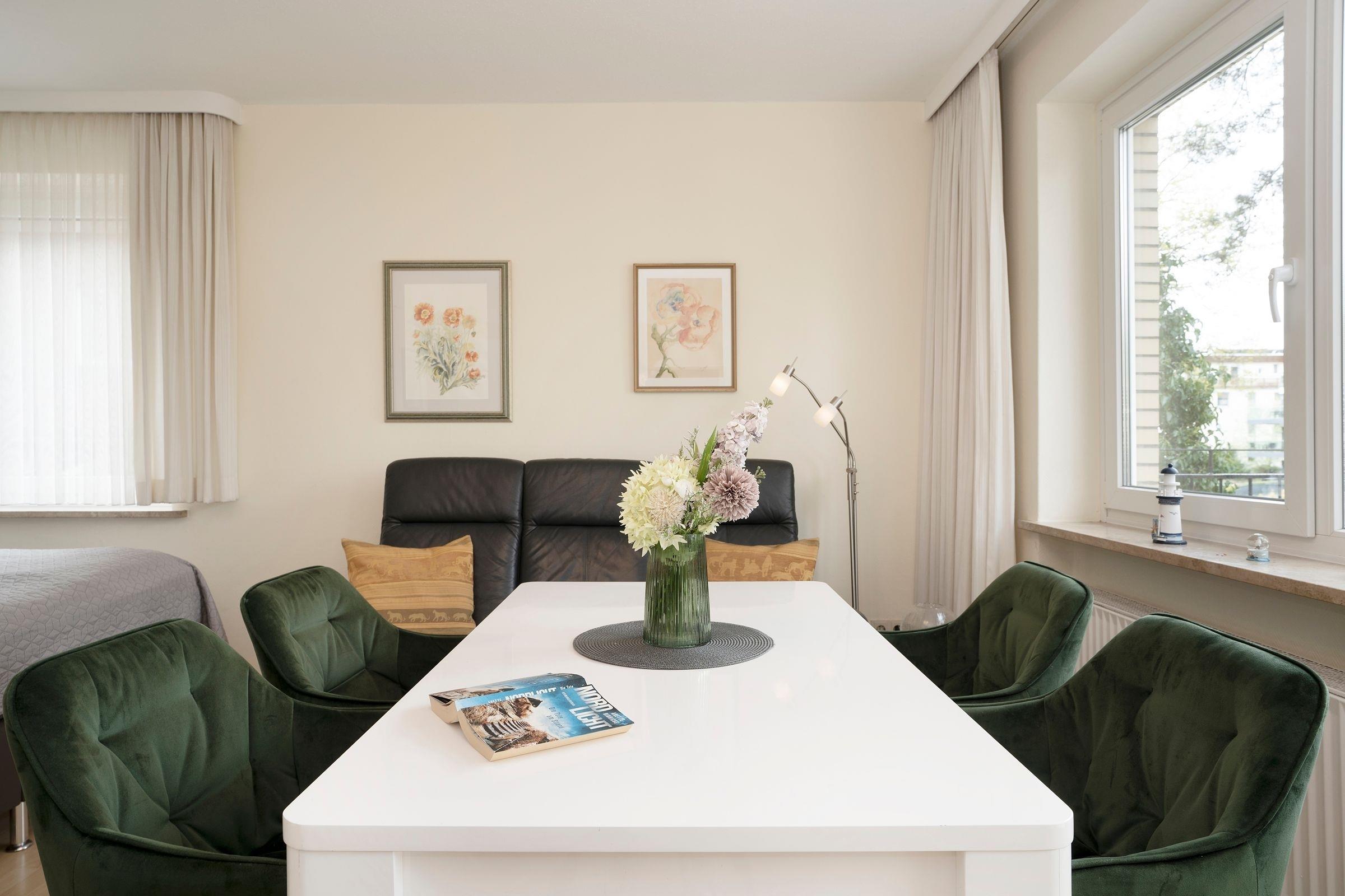 Wer träumt nicht davon, der Ostsee im Urlaub ganz nah zu sein? Die großzügige Ferienwohnung in der Wohnanlage Haus Seepferdchen am Meer ist nur rund 10 Meter vom Ostseestrand entfernt. Hier können Sie Ihre Strandmomente so oft und so lang Sie mögen genießen. Hereinspaziert – der Wohn-/Schlafbereich lädt mit der bequemen Couch sowie der netten Ess-Ecke und dem TV-Gerät zum gemütlichen Verweilen ein. Hier können Sie auch den großzügigen Balkon mit 2 gemütlichen Sitz-Ecken betreten. Wenn Sie nicht gerade Ihre Zeit am Strand verbringen, wird dies sicher Ihr neuer Lieblingsplatz. Zurück im Wohn-/Schlafbereich: In einer gemütlichen Nische verspricht ein Boxspringbett (180x200 cm) angenehme Nachtruhe. Auch das separate Schlafzimmer ist mit einem bequemen Boxspringbett (180x200 cm) ausgestattet. Hier stehen Ihnen ein weiteres TV-Gerät sowie ein großer Kleiderschrank zur Verfügung. Zudem ist hier genügend Platz, um ein Kinderreisebett aufzustellen. Das Besondere: Auch hier haben Sie Zutritt auf den großzügigen Balkon. In der kleinen, separaten Küche mit Spülmaschine finden Sie alle Annehmlichkeiten, die Sie zum Zubereiten Ihrer Urlaubsmenüs brauchen. Einen angenehmen Start in den neuen Tag bietet das moderne Duschbad mit Fenster und Handtuchwärmer.