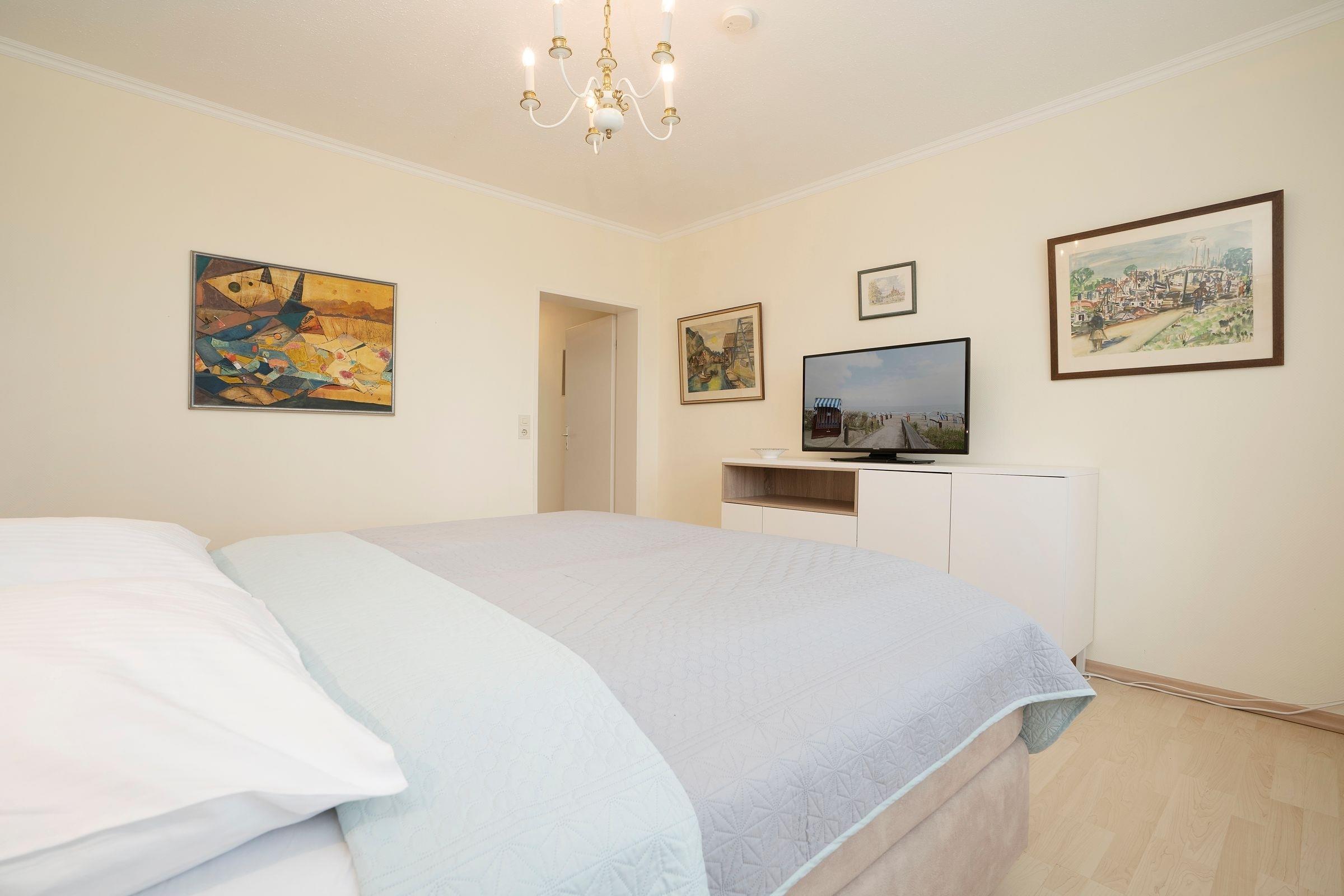 Schlafzimmer: 1 Boxspringbett (180x200 cm), Kleiderschrank im Flur, Platz für Kinderreisebett vorhanden, Sichtschutz (Gardinen), Smart-TV
