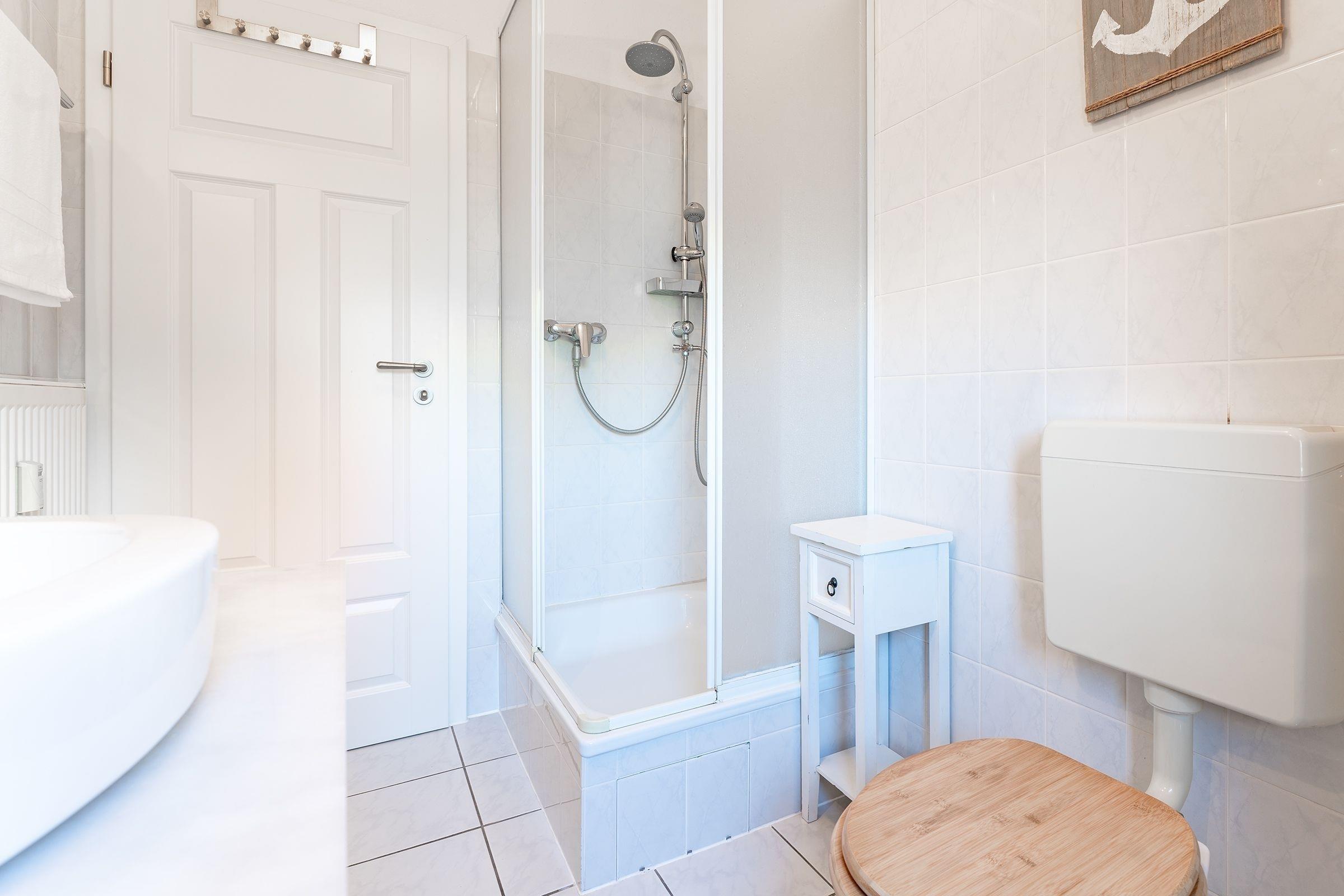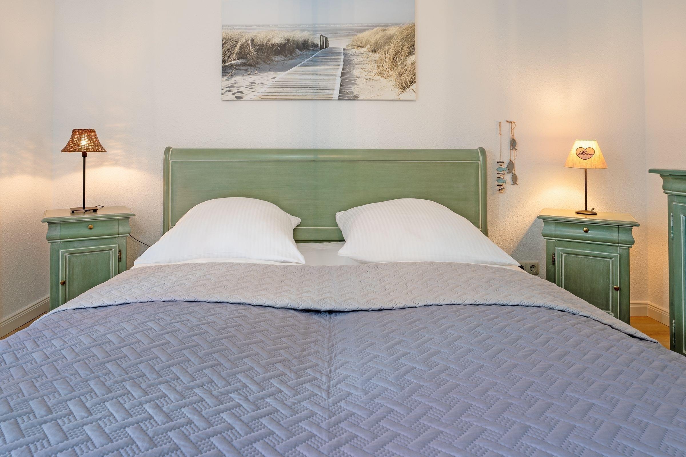Ein weiteres Highlight der Wohnung ist das liebevoll gestaltete und großzügige Schlafzimmer, das mit einem bequemen Doppelbett (2x 90x200 cm) für einen geruhsamen Schlaf sorgt. Nach Norden ausgerichtet ist es auch im Sommer stets angenehm kühl - Ihre Kleidung findet im geräumigen Kleiderschrank Platz. Schön sind die bodentiefen Fenster, verdunkelt wird mit elektrischen Außenjalousien. Das schicke, taghelle Duschbad mit Föhn und Kosmetikspiegel lässt Sie bestimmt mit einem Lächeln in den neuen Tag starten.