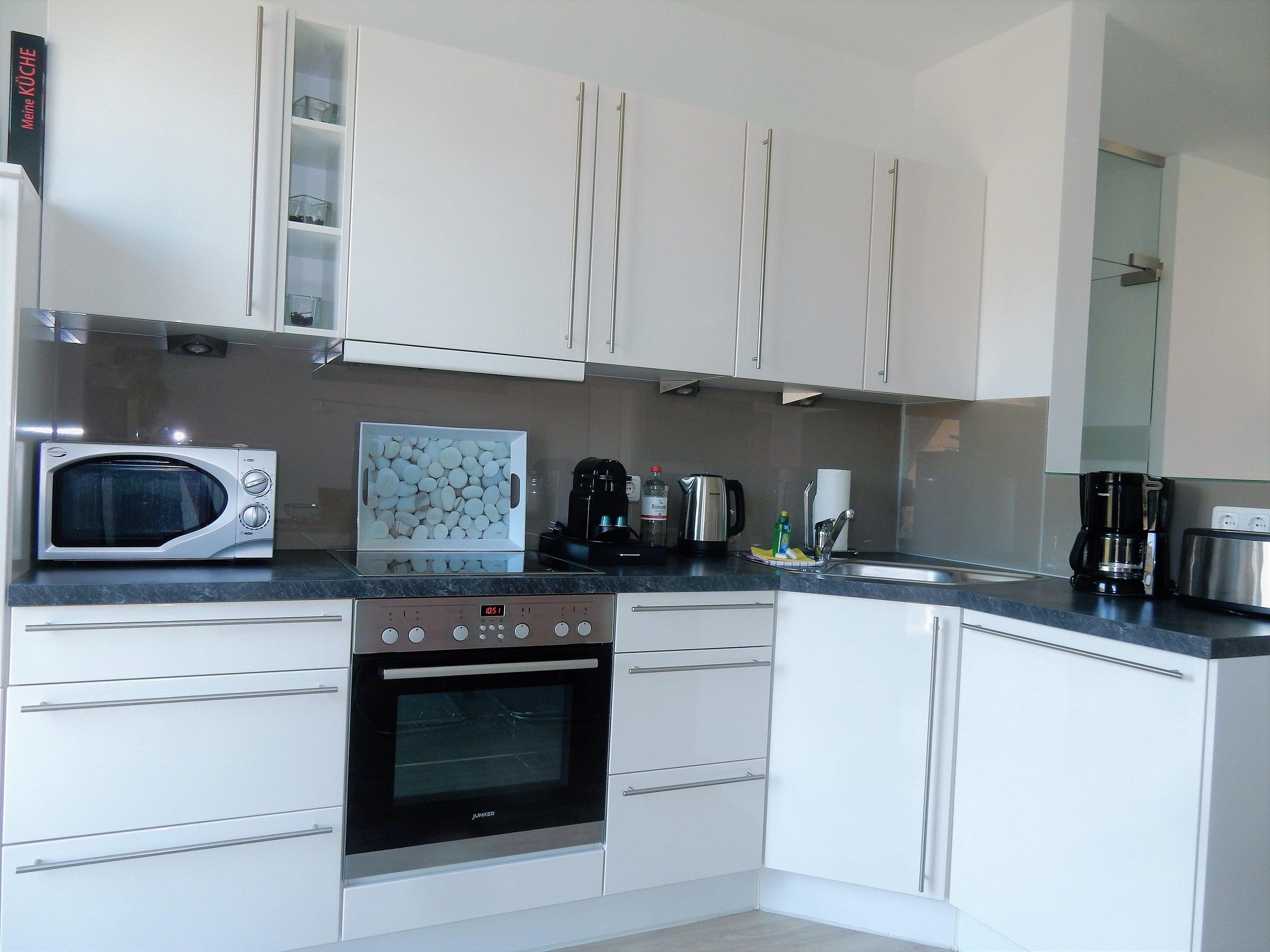 In der sich anschließenden offenen Einbauküche stehen eine umfangreiche Ausstattung und viele Annehmlichkeiten wie Geschirrspüler, Ceran-Kochfelder, Backofen, Mikrowelle mit Grill-Funktion, Kühlschrank mit Gefrierfach, Wasserkocher, Toaster, Kaffeemaschine u.v.m. bereit.