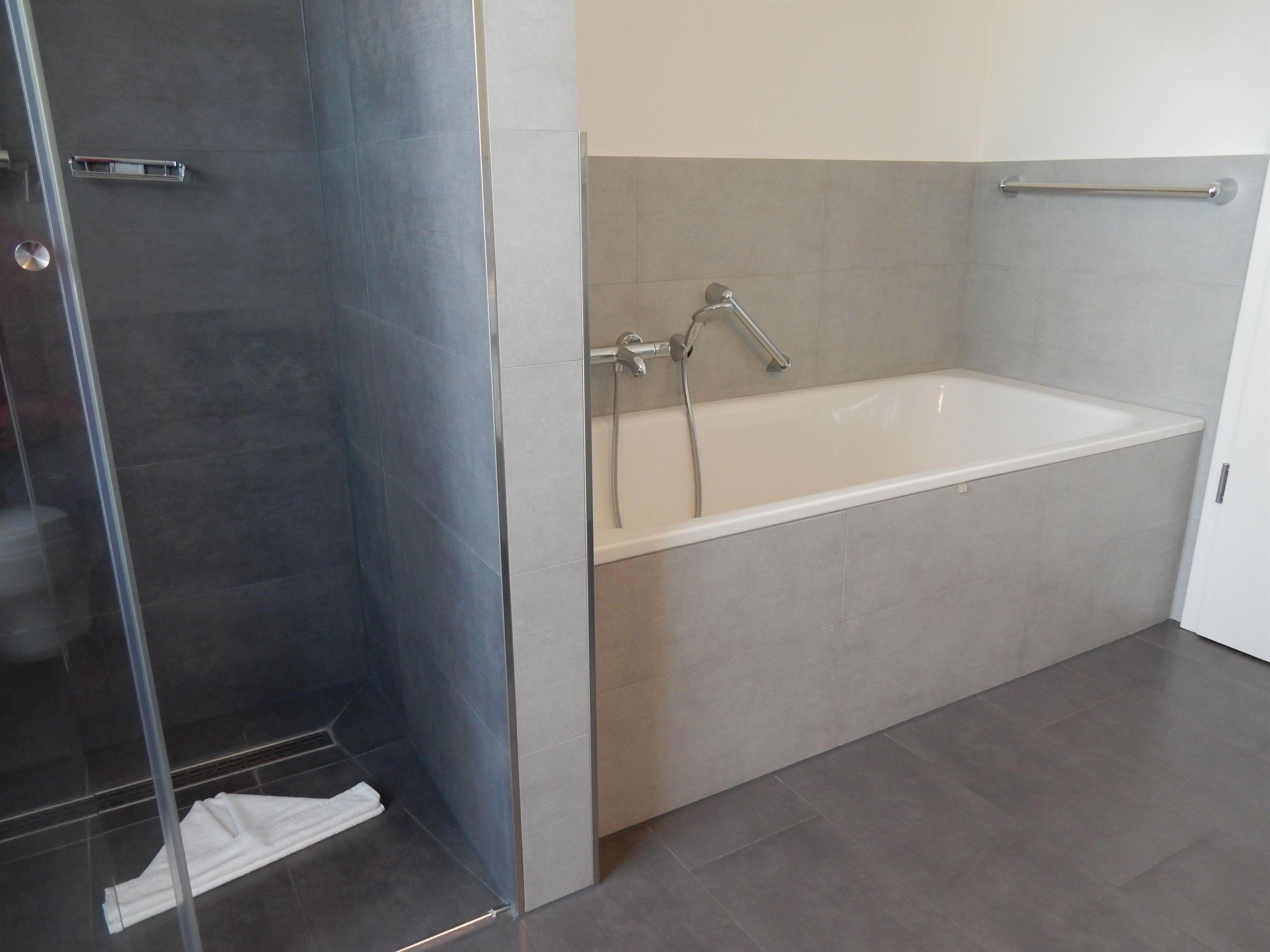 Das geräumige Vollbad verfügt sowohl über eine Badewanne als auch eine große, barrierefreie Dusche. Handtuchtrockner und Fön sind vorhanden. Ein zweites Badezimmer - ebenfalls mit bodentiefer Dusche - ergänzt die komfortable Ausstattung.