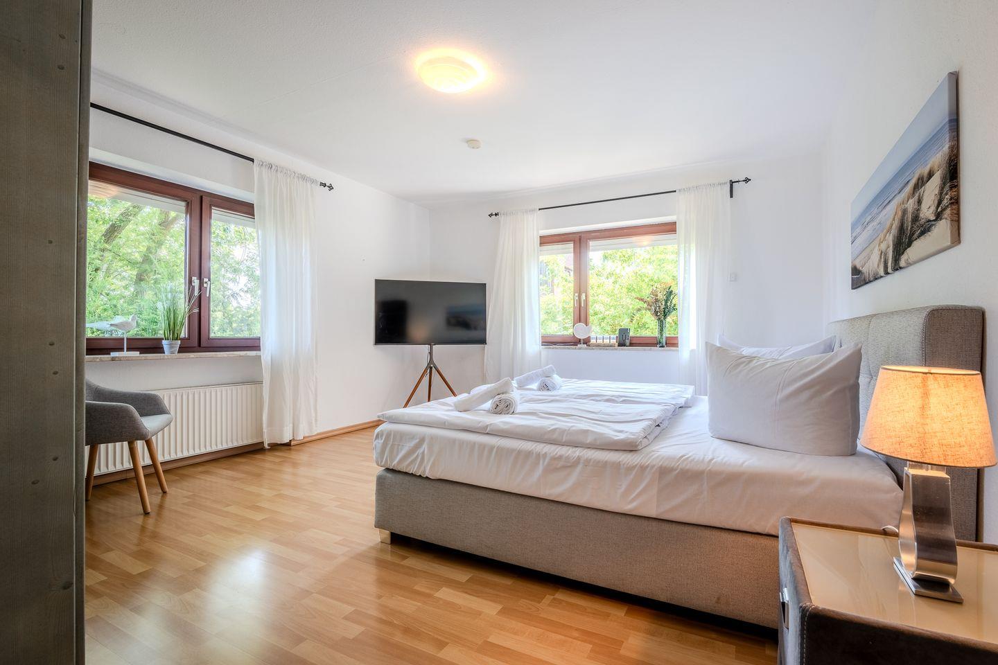 In diesem schönen Ferienhaus kommt die Urlaubsstimmung von ganz allein! Auf 140 qm mit Terrasse und Garten ist Platz für Familie und Freunde. Genießen Sie "Gemeinsamzeit" auf der Terrasse, oder lassen Sie den Tag entspannt bei einem gemeinsamen Fernsehabend auf der bequemen Sofalandschaft ausklingen. Die in der voll ausgestatteten Küche zubereiteten Speisen können Sie gemeinsam am großen Esstisch einnehmen. Die Küche mit zusätzlichem kleinem Esstisch ist mit Backofen, Herd und Spülmaschine ausgestattet und lässt sich durch eine große Glastür vom Wohn- und Esszimmer abtrennen. Zwei Schlafzimmer mit bequemen Doppelbetten und eigenem TV-Gerät befinden sich im Erdgeschoss, ein weiteres Schlafzimmer mit Doppelbett befindet sich im Souterrain des Hauses. Für eine weitere Person ist auf dem Sofa im Wohnzimmer Platz. Das Badezimmer verfügt über Badewanne und Dusche, sowie eine Waschmaschine. Zusätzlich gibt es ein separates Gäste-WC. EIn PKW-Stellplatz am Haus inklusive. Der Strand und die Promenade mit zahlreichen Geschäften und Restaurants ist 1,3 km entfernt, die nächsten Supermärkte sind mit dem Auto in weniger als 5 min. zu erreichen.