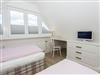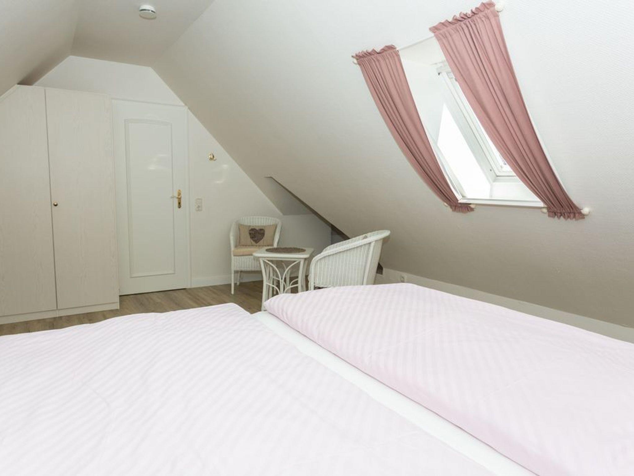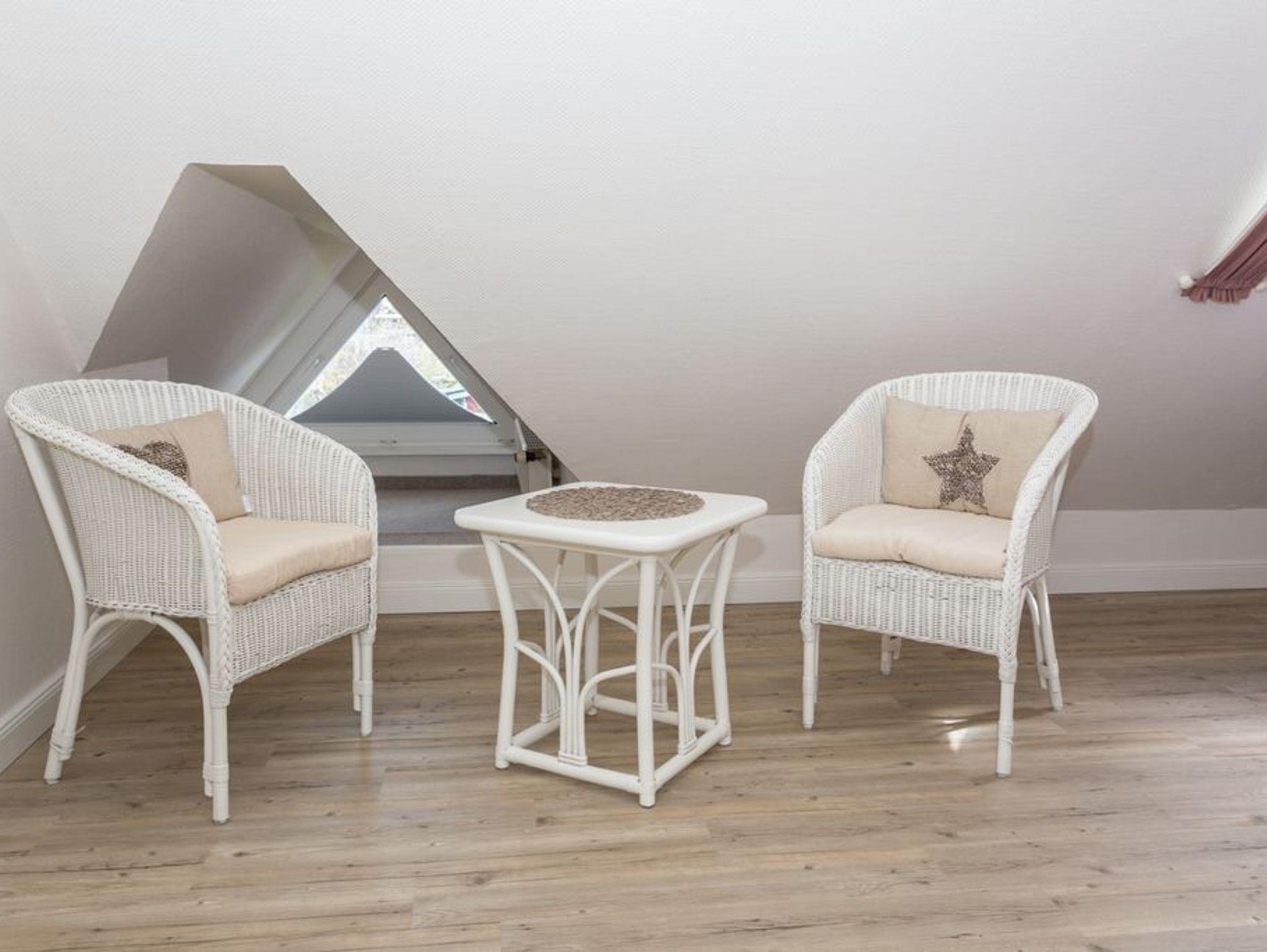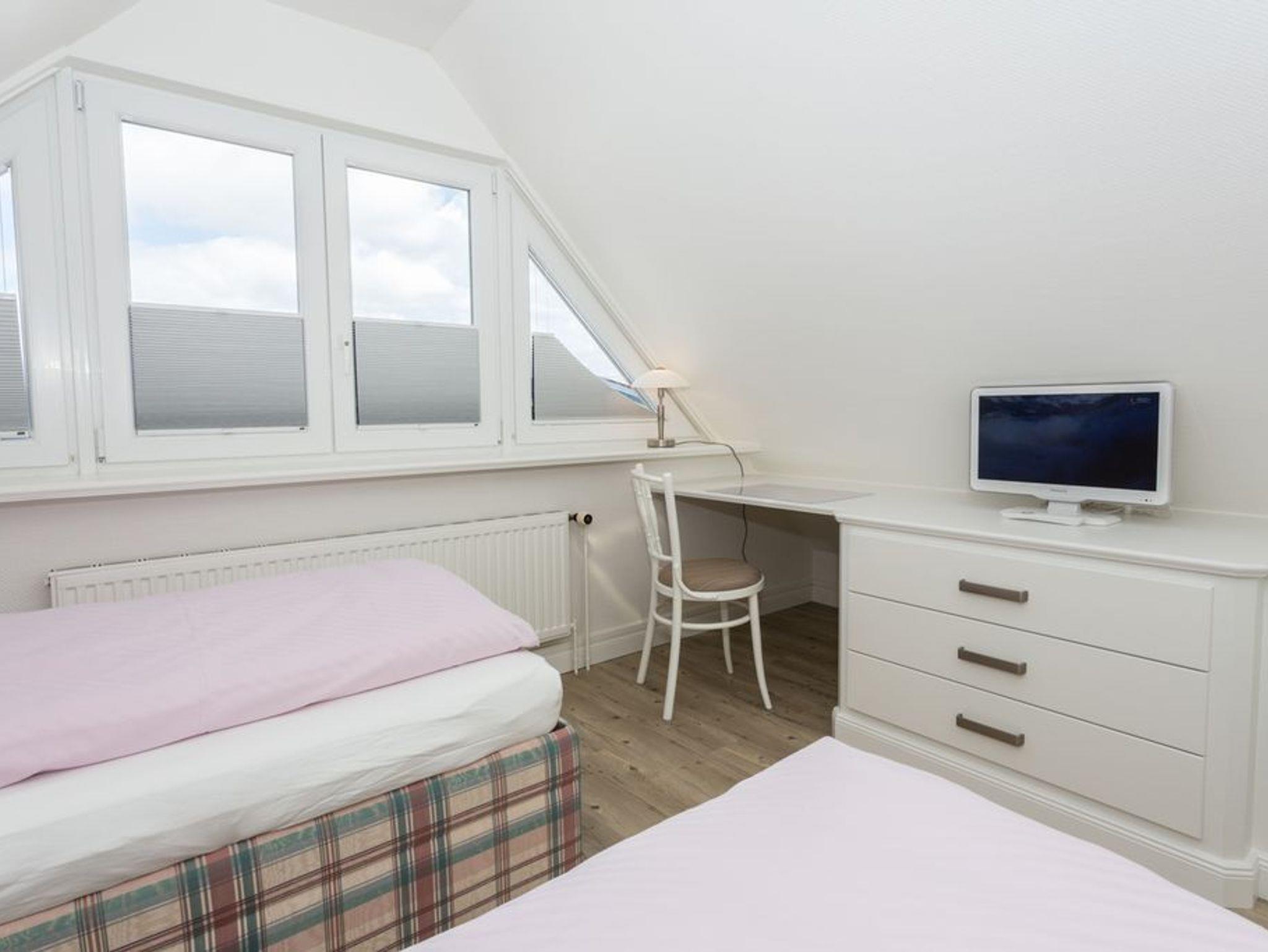 Die geräumige 3-Zimmer-Ferienwohnung für 4 Personen, ca. 65m², erstreckt sich über zwei Ebenen. Im Obergeschoss befinden sich ein Duschbad / WC, Wohnzimmer mit Essplatz sowie Sitzgruppe, Flat-TV, Radio, Telefon und kostenfreiem W-Lan. Die Küchenzeile ist zum Wohnraum offen mit Geschirrspüler und Mikrowelle ausgestattet. Waschmaschine sowie Trockner sind gemeinschaftlich auf der gleichen Ebene im Obergeschoß nutzbar. Eine Treppe ins Dachgeschoss führt zu zwei separaten Schlafzimmern (alle Betten sind wahlweise als Einzel- oder Doppelbetten stellbar) und einem kleinen Abstellraum. Bettwäsche und Handtücher sind zur Anreise aufgezogen. Ein Pkw-Stellplatz befindet sich vor dem Haus. Der gemeinschaftliche Außenbereich bietet einen Terrassenplatz mit Strandkorb und Gartenmöbeln, einen überdachten Sitzbereich, einen großzügigen Fahrradunterstand sowie Schränke für Ihre Golfbags. Tierhaltung ist nicht gestattet.
