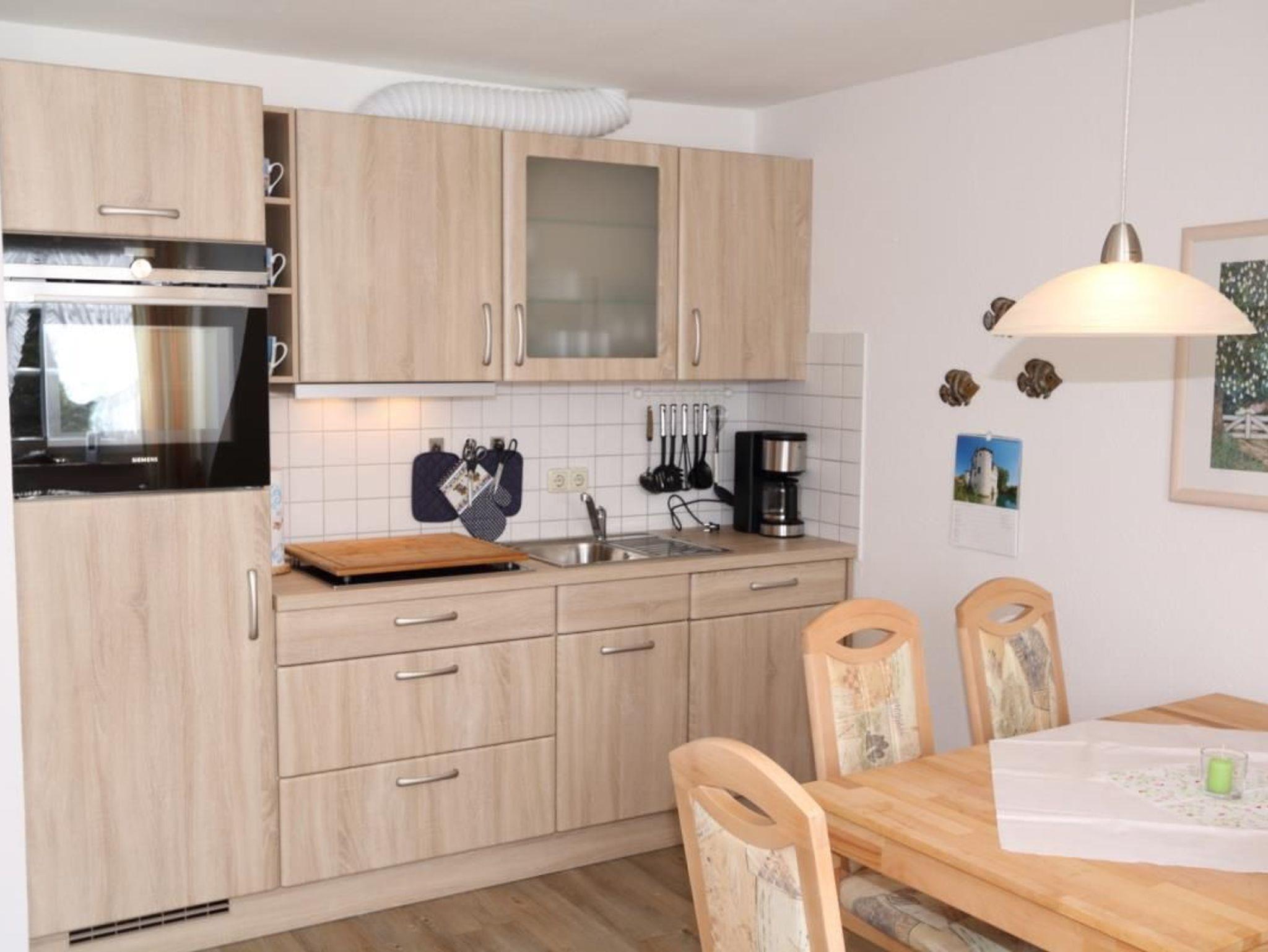 Küche mit Kochfeld und Dunstabzug, Backofen, Kühlschrank mit Eisfach, Spülmaschine, Filter-Kaffeemaschine, elektrischer Wasserkocher und Toaster sind selbstverständlich.