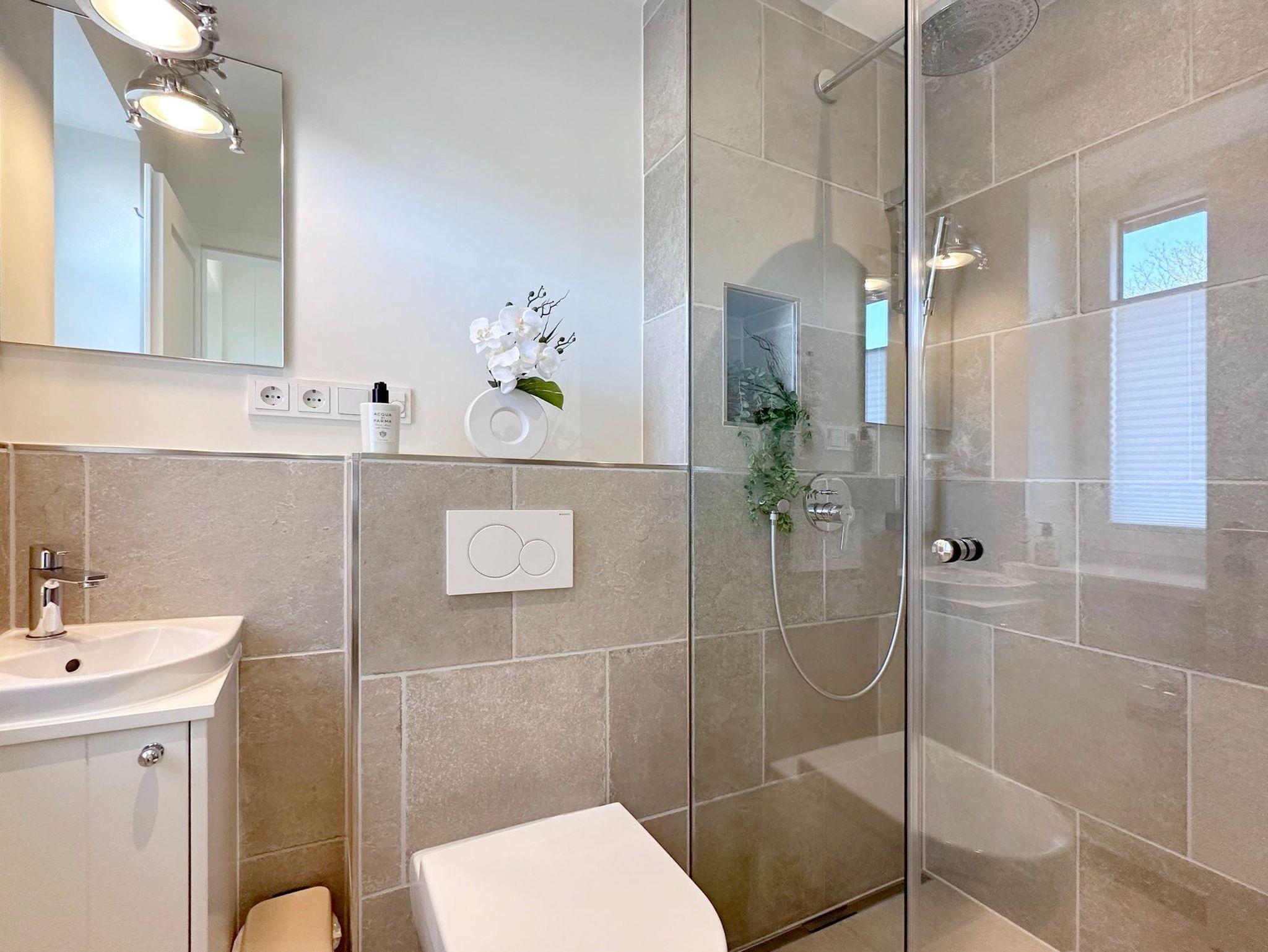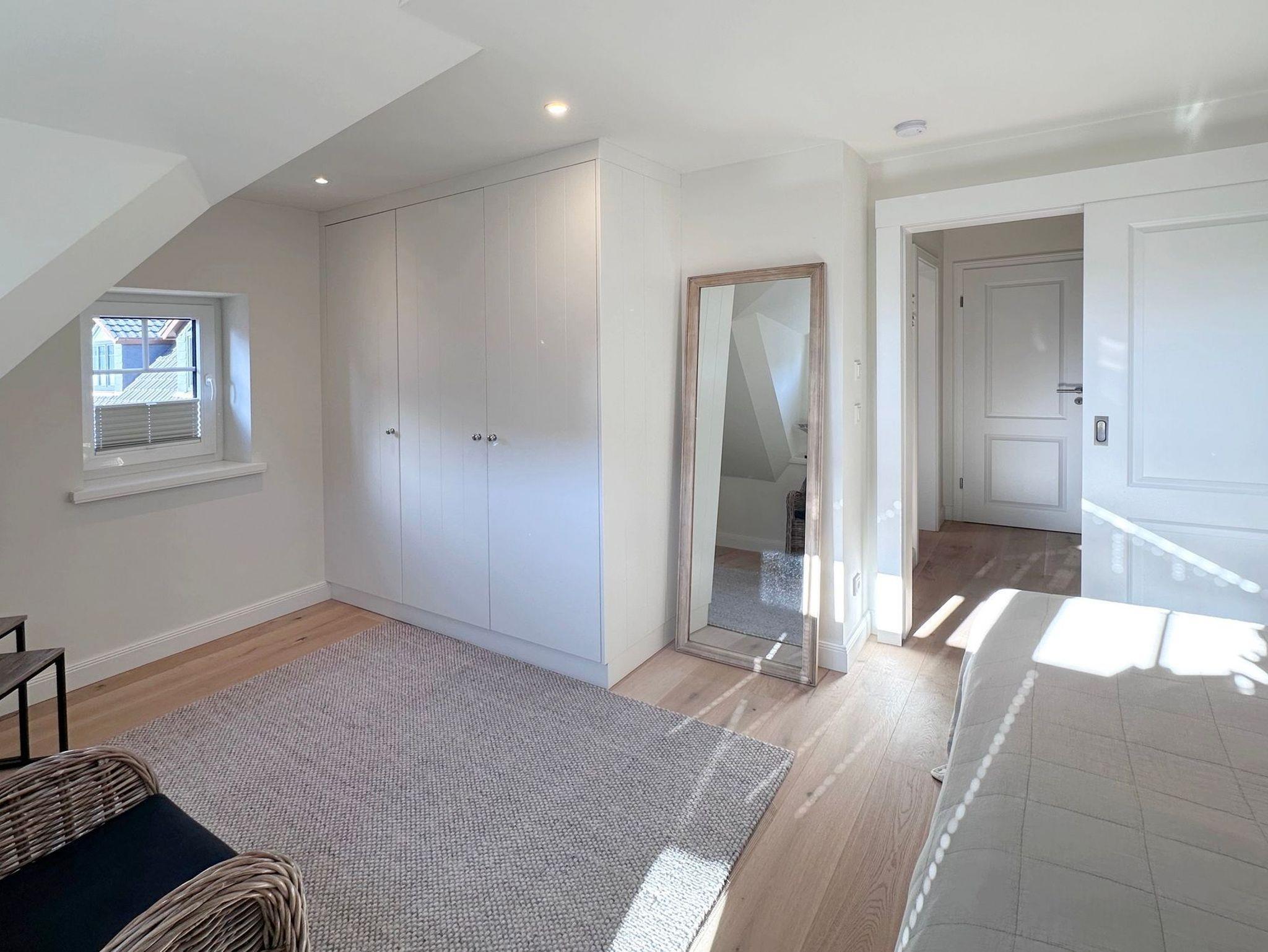 Im Obergeschoss befinden sich zwei Räume mit je einem Doppelbett (160x200 und 180x200) sowie ein weiteres Badezimmer mit Dusche und WC.