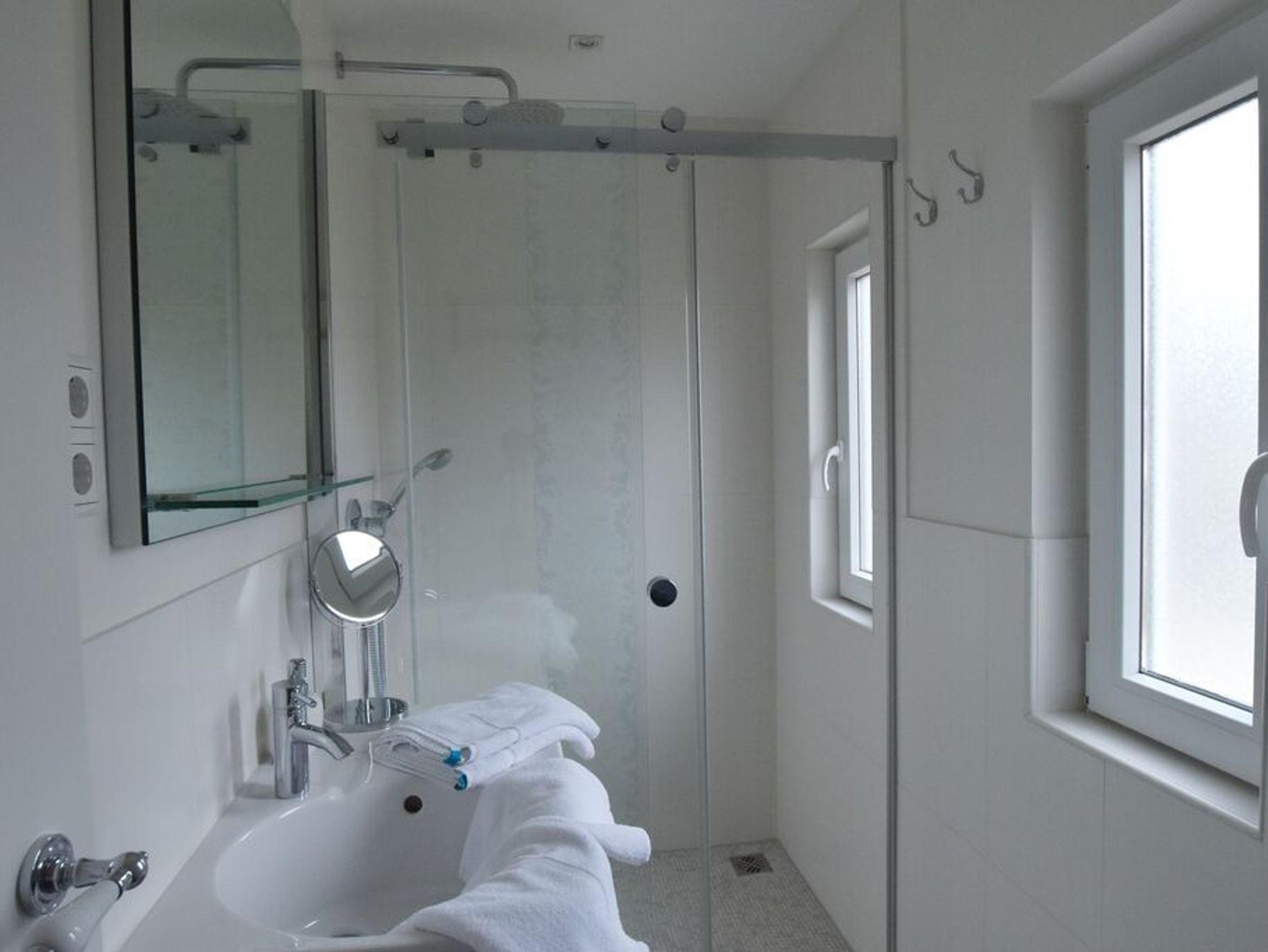 Ebenfalls im EG finden Sie ein Duschbad mit begehbarer bodentiefer Dusche, Waschbecken und WC.