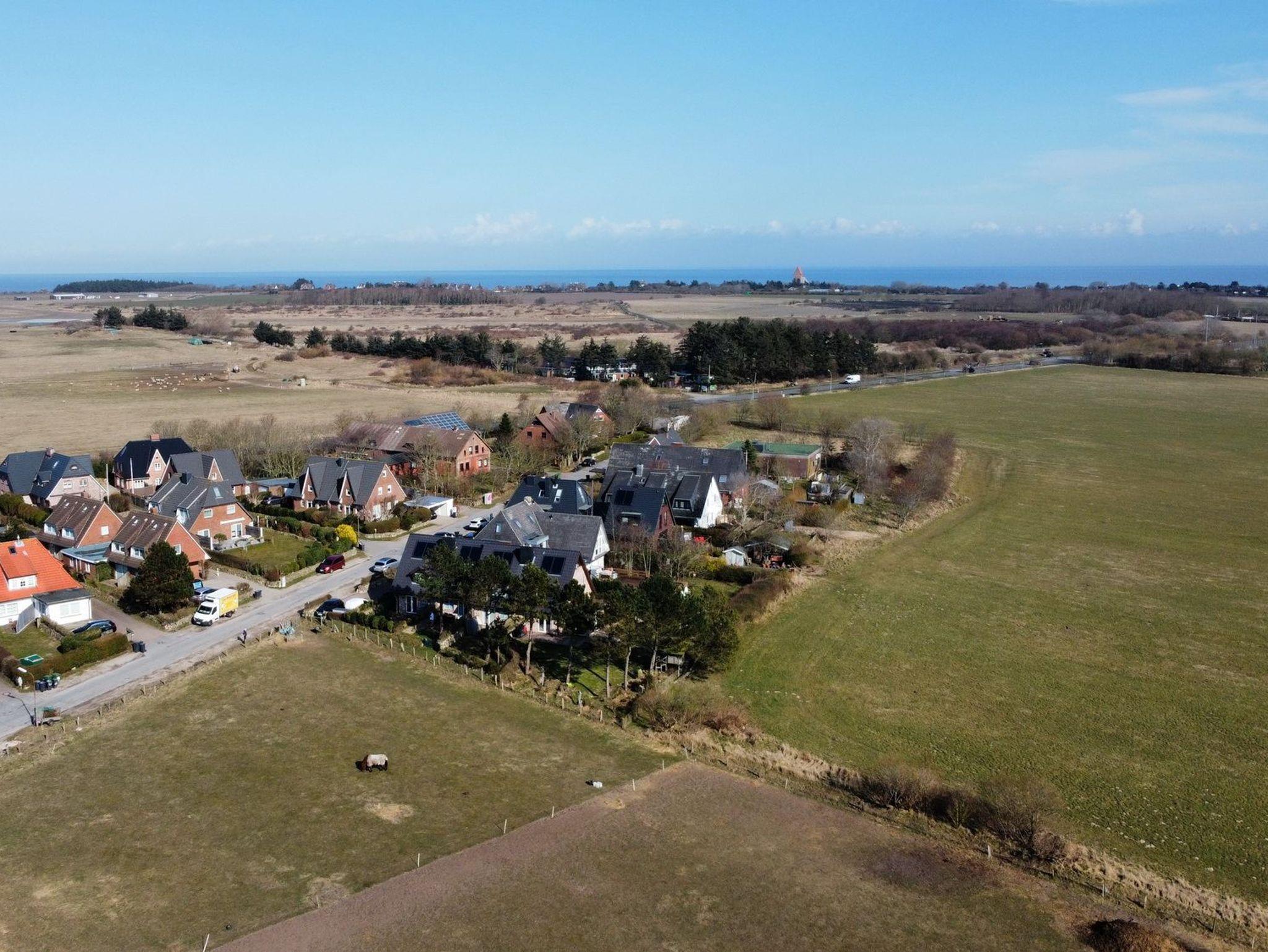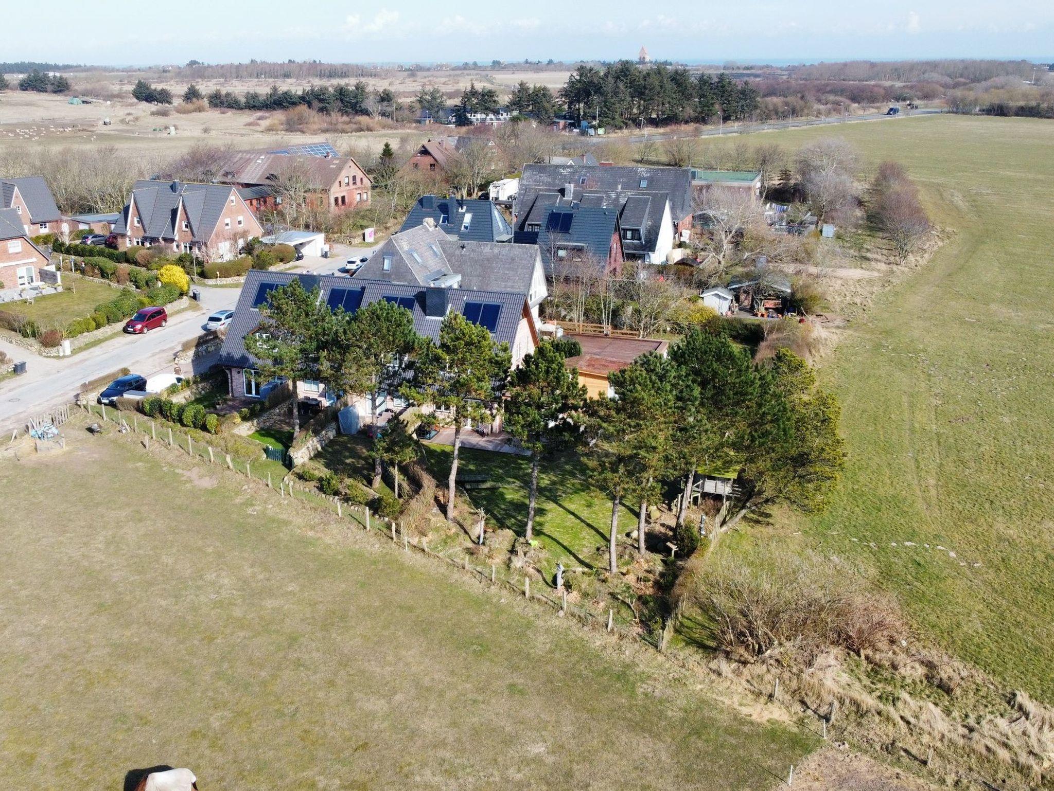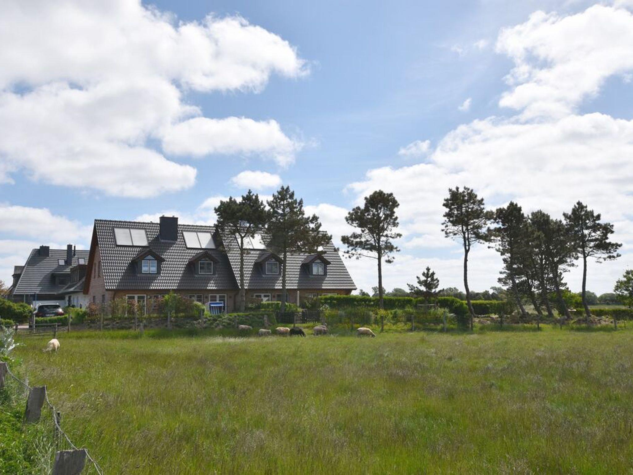 Modernes Ferienhaus mit Feldblick und exklusiver Ausstattung auf Sylt, ideal für Familien und Haustierbesitzer.