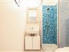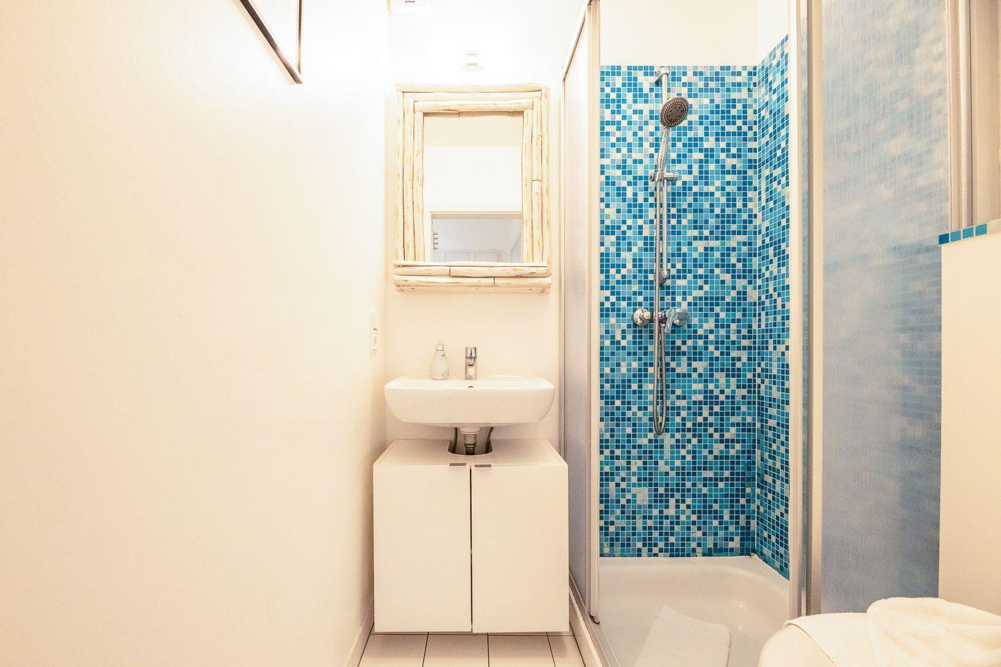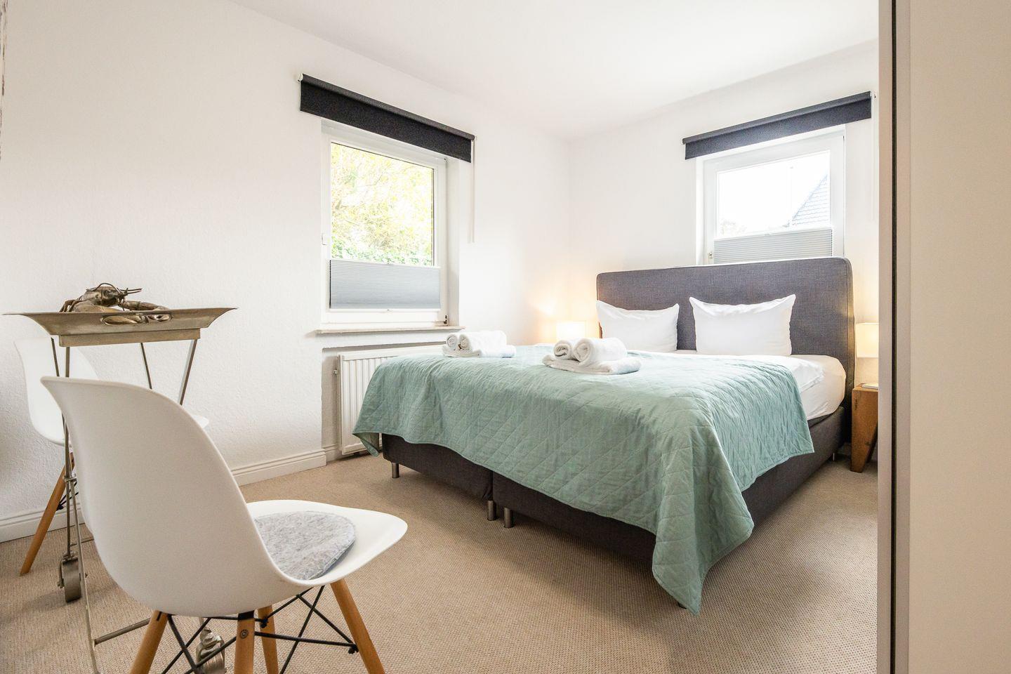 Klein und fein präsentiert sich das Schlafzimmer mit seinem breiten Boxspringbett und gleich nebenan das kompakte Duschbad mit seinen farbigen Akzenten.