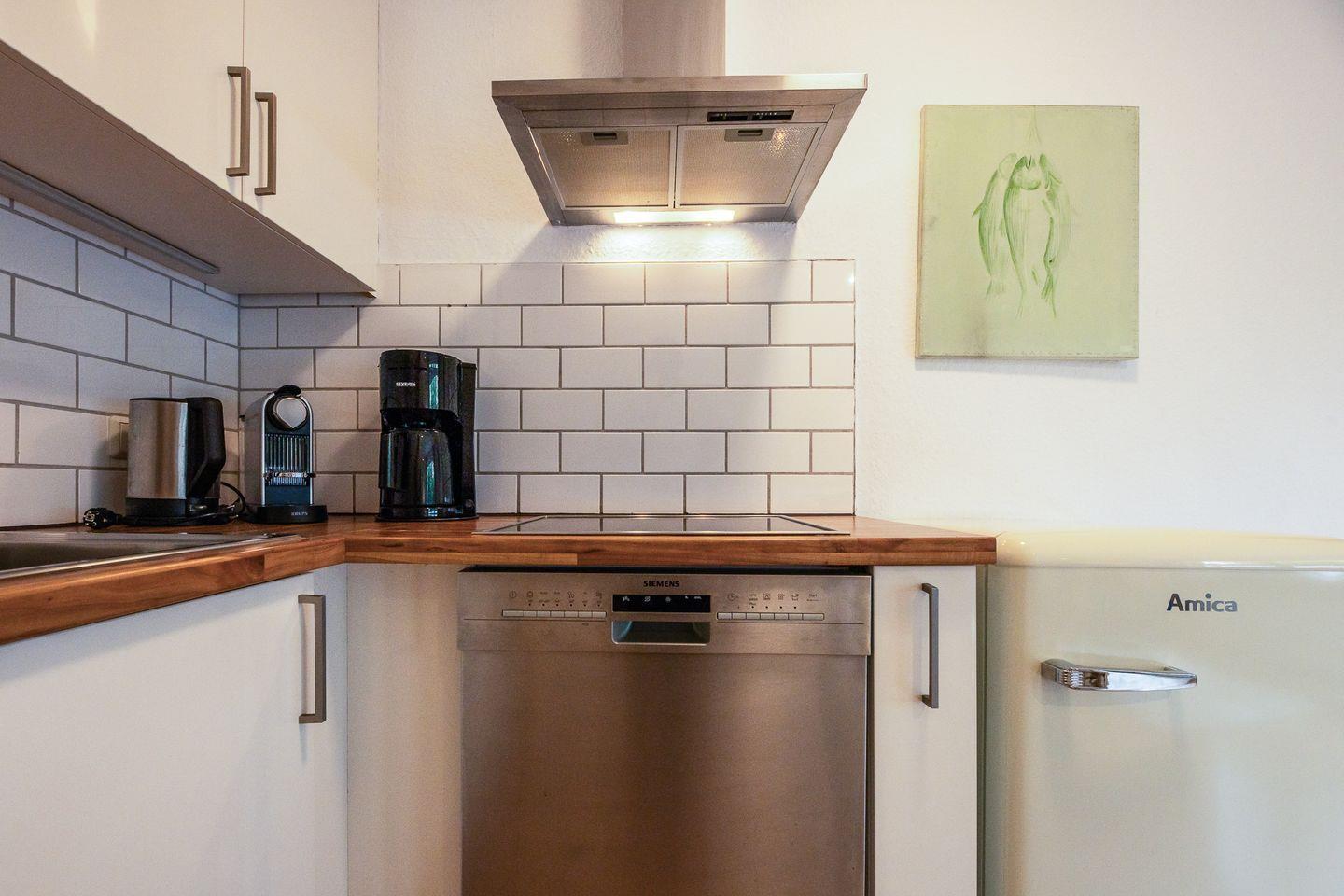 Im Wohn-/Essbereich gibt es genügend Platz für die Lounge-Couch, Esstisch und einen großen Flatscreen. Ein wenig um die Ecke versteckt sich die kleine, aber gut ausgestattete Küchenzeile. Für viel Licht im Raum sorgen nicht nur die großen Fenster, sondern auch die hellen Farben und Naturtöne.