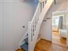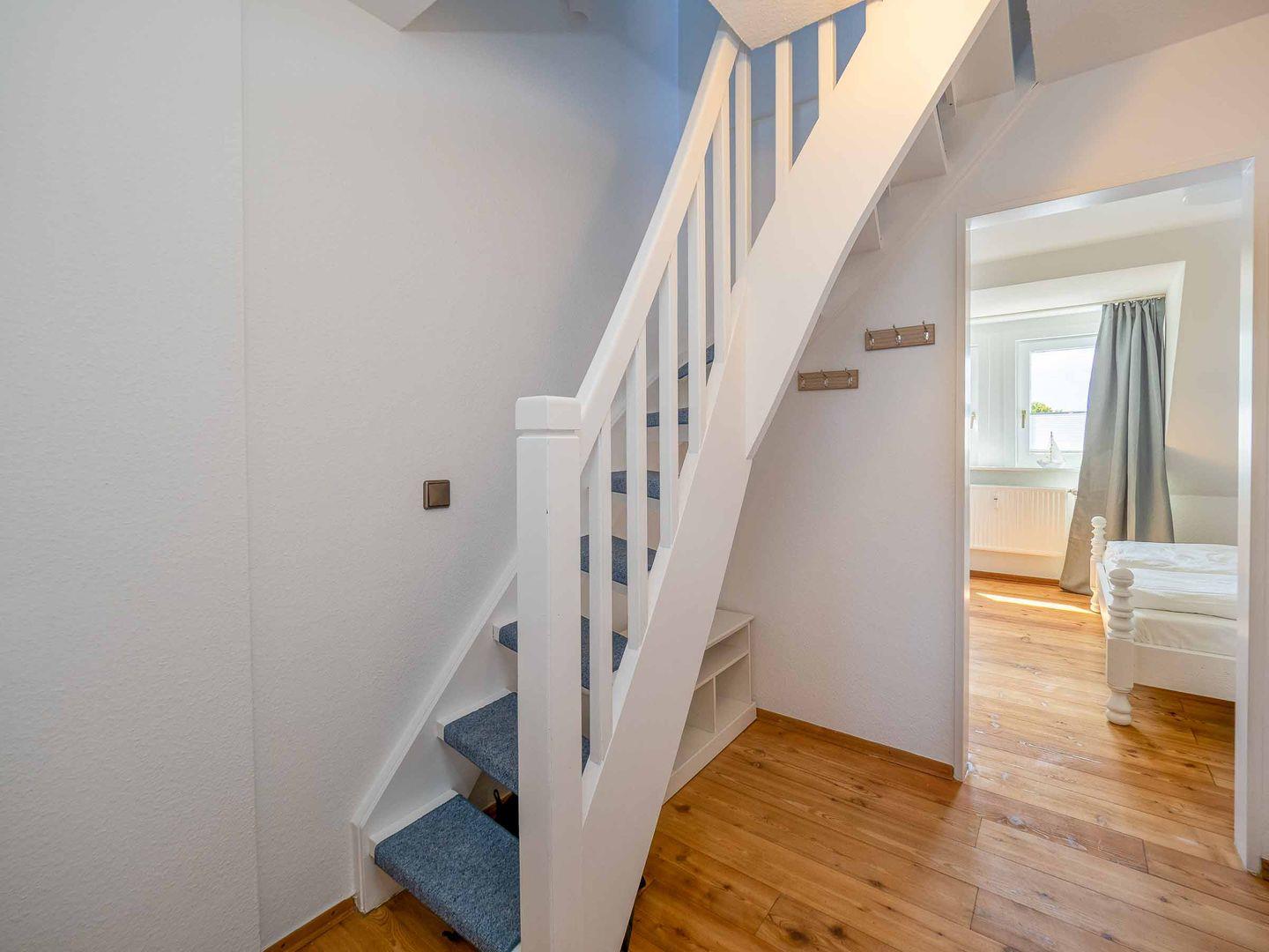 Eine steile, jedoch gut begehbare Treppe mit Treppengeländer führt in das Dachgeschoss: