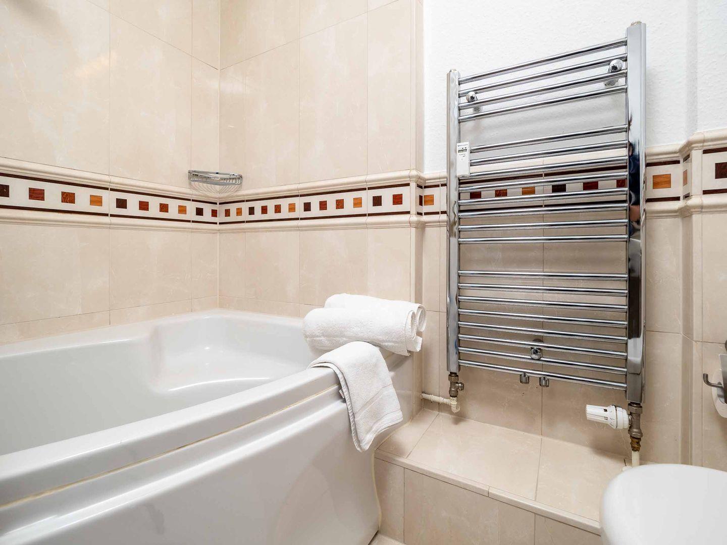 Badezimmer: Moderne Eckbadewanne mit Duschtrennwand und Duschkopfhalterung, WC und Handtuchtrockner.