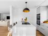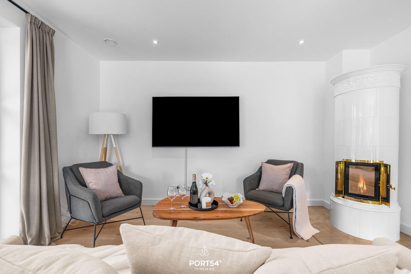 Der offen gestaltete Wohnbereich verbindet Wohnzimmer und Küche zu einem besonders komfortablen Lebensmittelpunkt. Hier genießen Sie einen offenen Kamin, ein edles Sofa und hochwertige Wohnaccessoires. Die offene Küche ist mit modernen Geräten wie Geschirrspüler, Kühlschrank mit Gefrierfach, Backofen, Nespressomaschine, Wasserkocher und Toaster ausgestattet. Eine reichhaltige Grundausstattung an Küchenutensilien, Geschirrhandtüchern sowie ein Esstisch stehen Ihnen zur Verfügung.