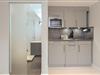 Um die Wohnung luftig und dennoch gemütlich zu gestalten wurde hier auf viel Weiß und als Kontrast dazu warmes Grau sowie clevere Stauraumlösungen gesetzt. Die passgenaue Küchenzeile fügt sich harmonisch in den Raum ein und kann es in puncto Ausstattung auch locker mit größeren Küchen aufnehmen. Gegessen wird mit Ausblick nach draußen direkt am Fenster. Ein gemütliches Bett und ein kleiner Sessel machen die Einrichtung komplett. Das Duschbad ist durch eine Schiebetür verbunden und auch hier sorgen Weiß und Grau für eine moderne Lässigkeit.