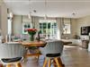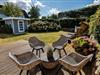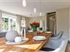 Das helle Wohn- und Esszimmer lädt mit einem gemütlichen Sofa, einem großen Esstisch und einem modernen TV zum Entspannen ein. Von hier aus haben Sie direkten Zugang zur Westterrasse und zur sonnigen Südterrasse, die beide in den schön angelegten Garten führen. Hier können Sie die frische Meeresluft in vollen Zügen genießen und entspannte Stunden im Freien verbringen.
