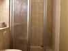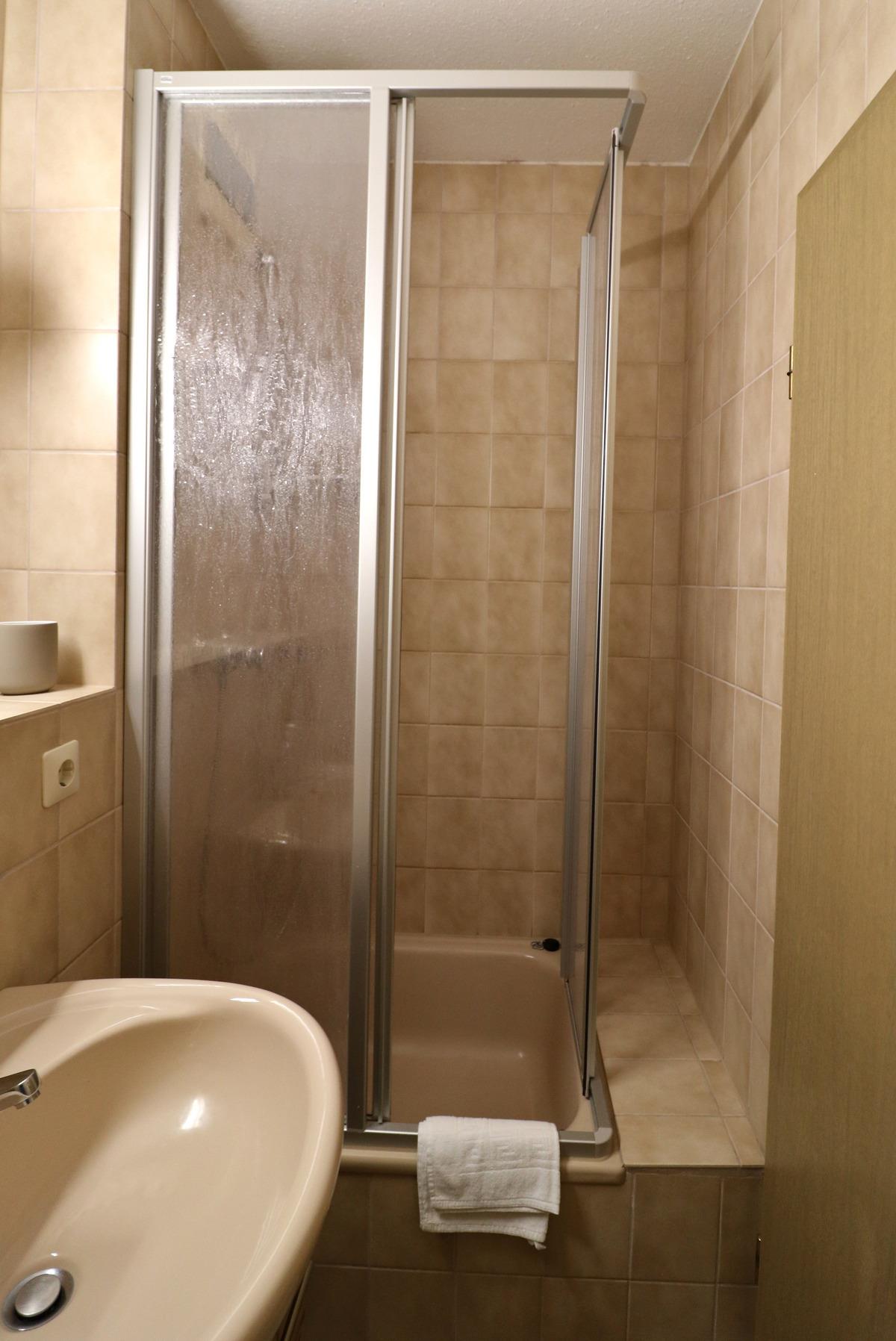 Das Badezimmer hat eine Dusche, Waschbecken und WC.
