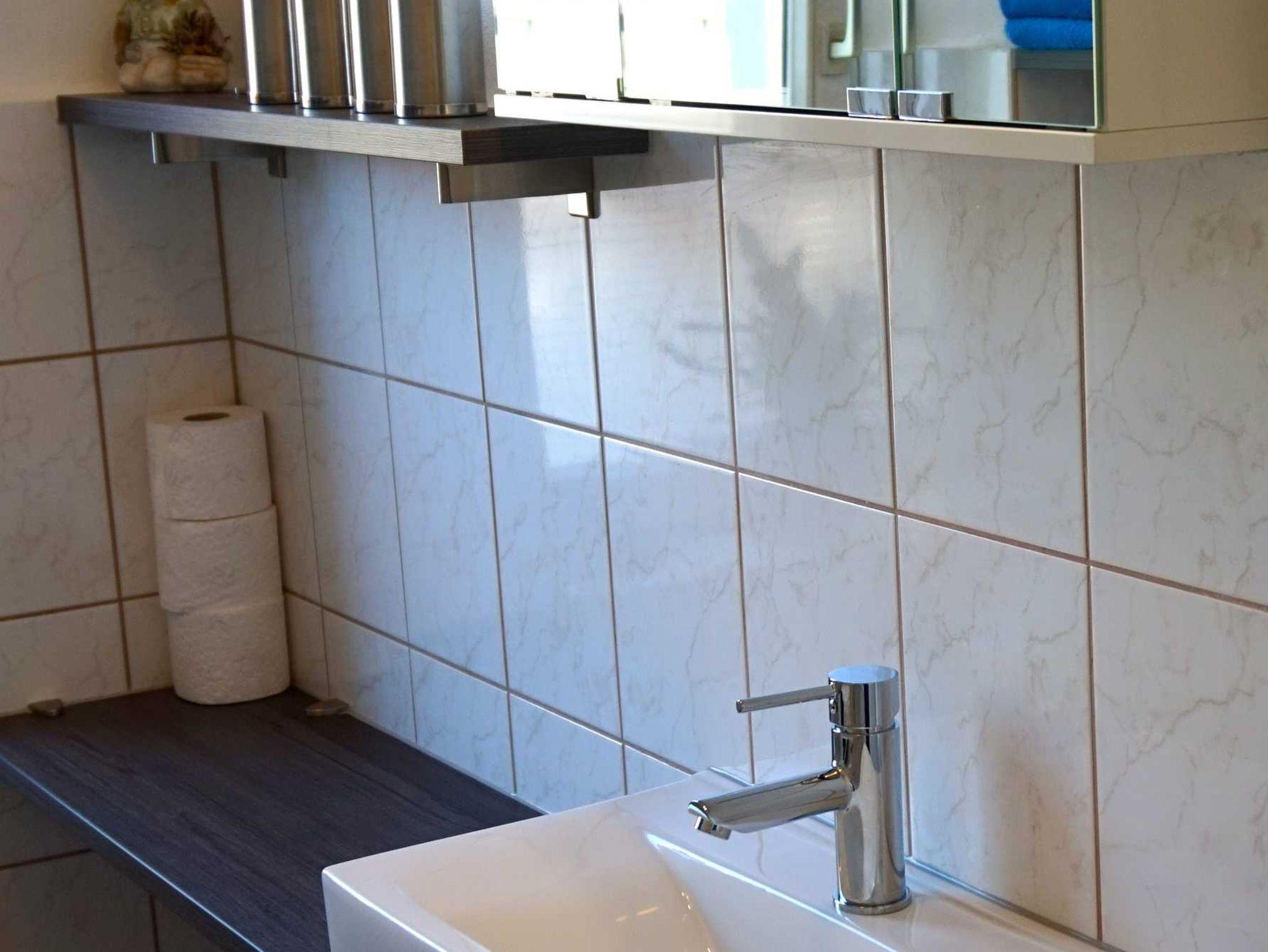 Das moderne Tageslichtbad ist über einen kleinen Gemeinschaftsflur erreichbar. Es verfügt über eine eingebaute Badewanne mit Brause, einen beleuchteten Spiegelschrank mit Steckdose, WC und Designerwaschbecken. Zusätzlich eingebaute Ablagen bieten ausreichend Platz für alles was man in Bad so braucht.