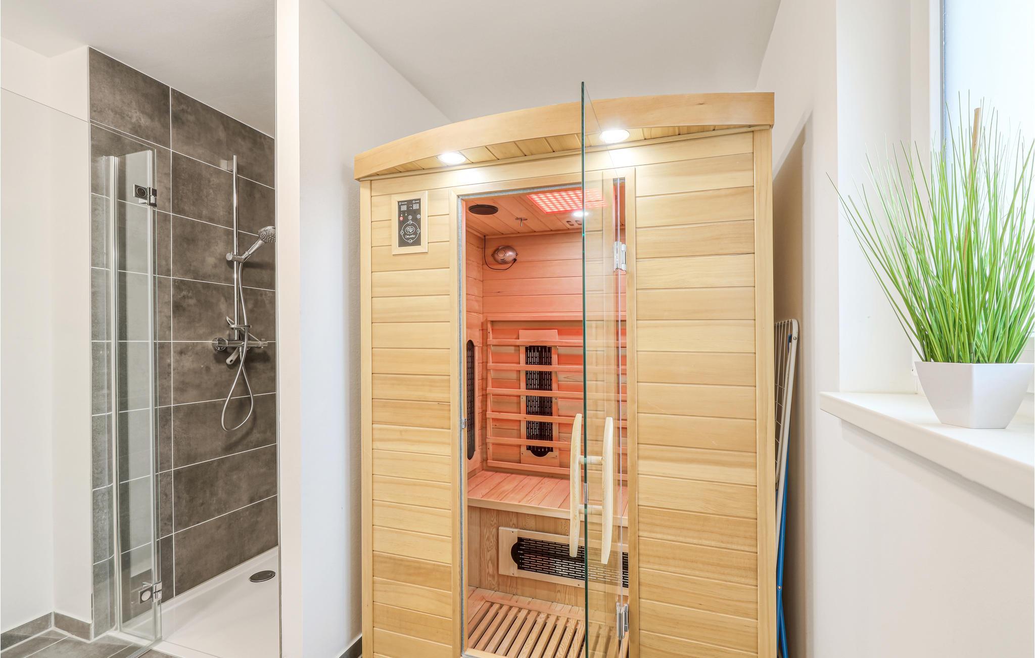 Ihr Haus erstreckt sich über 2 Etagen. Im Erdgeschoss befindet sich ein offener, gemütlicher Wohnbereich mit angrenzender Gartenterrasse und einer modernen Einbauküche, welche durch bodentiefe Fenster zum Verweilen einlädt. An kalten Tagen können Sie es sich vor dem eingebauten Kamin gemütlich machen. Neben dem Wohnbereich befindet sich ein helles Badezimmer mit Duschkabine und Infrarotsauna.