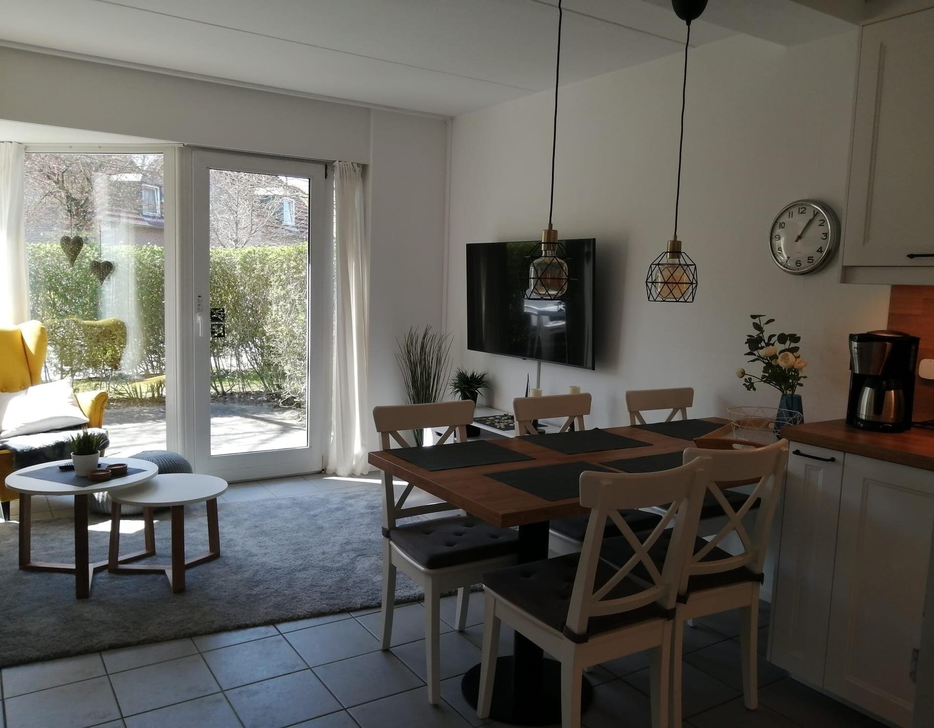 Unser modernes und liebevoll eingerichtetes Ferienhaus bietet auf 65 m² und 2 Etagen Platz für 4 Personen evtl. plus Kleinkind. Das Haus wurde Anfang 2022 komplett renoviert. Dabei wurde das Badezimmer komplett erneuert, die Böden und die Treppe wurden neu gemacht. Des Weiteren verfügt die Ferienwohnung über eine neue Küche inklusive neuer Geräte und neuem Mobiliar. Die Ferienwohnung unterteilt sich in einen großzügigen Wohn-Essbereich und Badezimmer im Erdgeschoss sowie zwei Schlafzimmern im Obergeschoss. Das Haus verfügt über eine nach Süden ausgerichtete Terrasse, die ans Wohnzimmer angrenzt, auf der es sich wunderbar entspannen lässt. Hier stehen ein Tisch sowie 6 Gartenstühle und ein Grill mit diversem Zubehör zur Verfügung. Das Wohnzimmer ist mit einer Couch und zwei gemütlichen Sesseln ausgestattet, so dass auch 4 Personen ausreichend Platz finden, um auf dem großen Flachbildschirm spannende Fernsehabende zu erleben. Weiterhin besteht im Wohnzimmer die Möglichkeit gemütliche Spielabende zu verbringen. Diverse Spiele (Spielesammlung, Uno u. ä.) stehen zur Verfügung. Natürlich verfügt das Haus über WLAN, so dass dem Streamen der Lieblingsserie oder dem Anschluss von Spielekonsolen nichts im Wege steht. Hinweis: Die Internetversorgung erfolgt über das Mobilfunknetz, so dass es zu anbieterabhängigen Versorgungsschwankungen kommen kann, auf die der Vermieter leider keinen Einfluss hat! Der gemütliche Essbereich verbindet Wohnzimmer und Küche miteinander und lädt zum gemeinsamen Frühstücken oder leckerem Abendessen ein. Hier finden 4 Personen bequem Platz. In einem separatem kleinen Abstellraum steht als Besonderheit eine Waschmaschine zur Verfügung und natürlich ein Wäscheständer um die Wäsche an der frischen Nordseeluft auf der Terrasse zu trocknen. Die moderne Küche lässt keine Wünsche offen. Hier finden Sie einen Kühlschrank, einen Backofen, einen Herd mit Induktionsfeld, Geschirrspüler und Mikrowelle. Zusätzlich gibt es noch einen Toaster, einen Wasserkocher und eine Kaffeemaschine. Das moderne frisch renovierte Badezimmer verfügt über eine ebenerdige Dusche mit eleganter Glasduschwand, WC, Waschtisch mit großem Spiegelschrank und diversen Ablagemöglichkeiten, Handtuchtrockner und Fön. Im Obergeschoss befinden sich die beiden Schlafzimmer, die neu mit Laminat ausgestattet sind. Das etwas größere Schlafzimmer verfügt über ein Doppelbett (180x200), großer Aufbewahrungskombi, Schlafsessel (evtl. für Kinder, die nicht allein nebenan schlafen wollen) und TV. Bei Bedarf bietet dieses Zimmer genug Platz, um hier ein Kinderreisebett (im Haus vorhanden) zuzustellen. Das zweite Schlafzimmer ist mit zwei Einzelbetten ausgestattet. Dieses Zimmer verfügt als Ablagemöglichkeit ebenfalls über eine geräumige Kommode. Neben dem Eingang befindet sich ein Fahrradständer, an dem Fahrräder abgestellt und angeschlossen werden können. Auf dem Gelände befindet sich ein Hartgummiplatz, der für sportliche Aktivitäten wie Fußball, Handball, Basketball oder Ähnlichem zur Verfügung steht. Weiterhin befinden sich auf dem Gelände viele verschiedene Spielplätze, die alle Kinderwünsche erfüllen. Parkplätze sind direkt vorm Haus ausreichend vorhanden. Bettwäsche und Handtücher können bei Bedarf zugebucht werden. Bitte haben Sie Verständnis dafür, dass das Rauchen und das Mitbringen von Haustieren in unserer Ferienwohnung nicht gestattet ist.