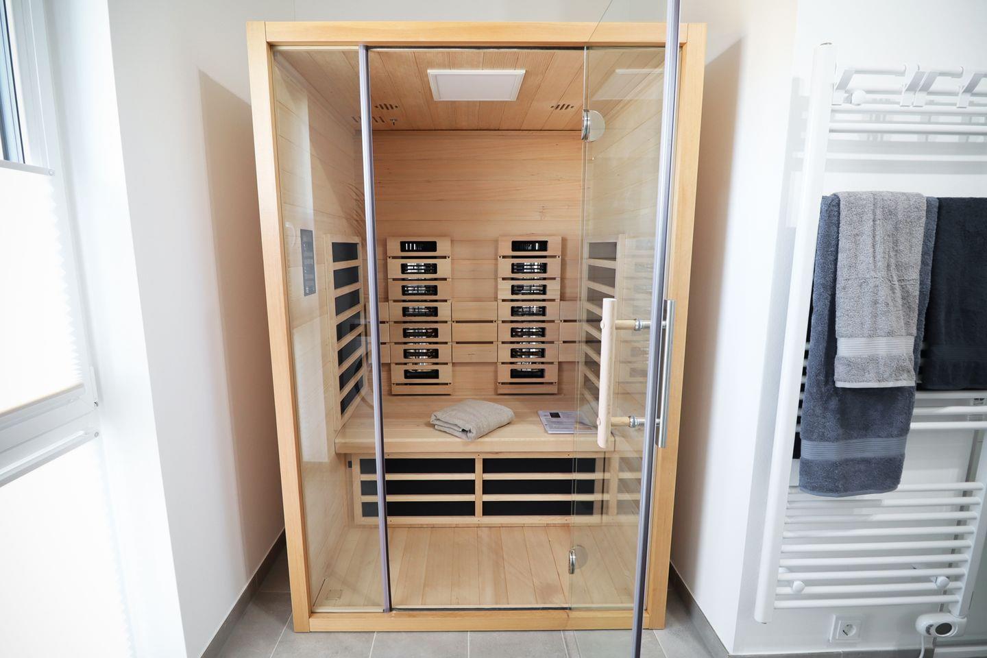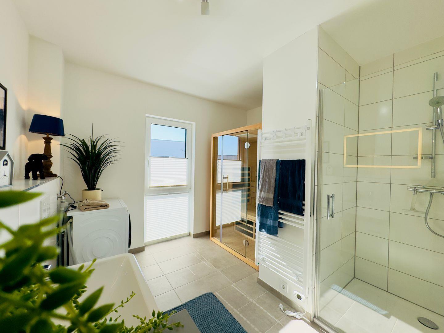 Nach einem Tag an der Nordseeluft kannst du im Wellnessbad mit Infrarotsauna entspannen. Die ebenerdige Dusche, stilvolle Akzente und eine Waschmaschine machen den Raum zu deiner persönlichen Wohlfühloase.
