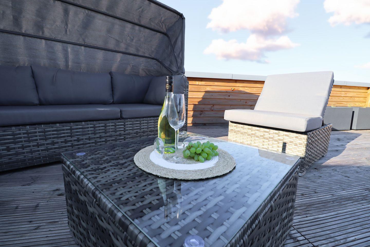 Auf der ersten Dachterrasse mit großem Essbereich genießt du Mahlzeiten mit Aussicht. Die zweite Terrasse bietet Loungemöbel und einen extra großen Strandkorb – perfekt zum Entspannen oder für eine Nacht unter dem Sternenhimmel.