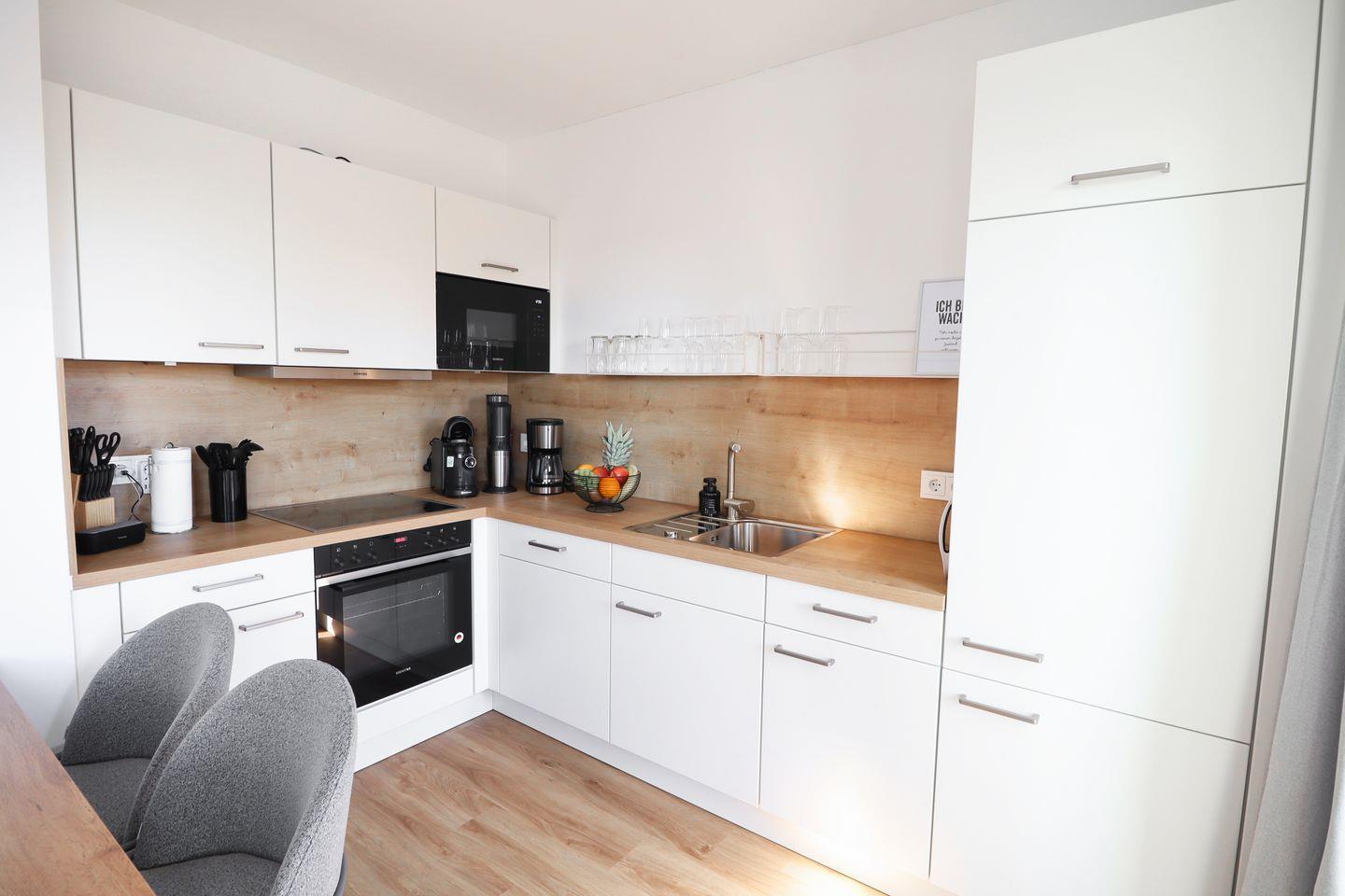 Das Interieur wurde von einer erfahrenen Raumgestalterin mit viel Liebe zum Detail entworfen. Harmonische Farben, hochwertige Materialien und ein offener Grundriss sorgen für ein einladendes Ambiente. Die moderne Küche ist mit Tassimo-Kaffeemaschine, Saftpresse und Sodastream ausgestattet. Der elegante Wohnbereich mit Holzofen lädt zum Entspannen ein und bietet dank bodentiefer Fenster einen herrlichen Blick aufs Wasser.